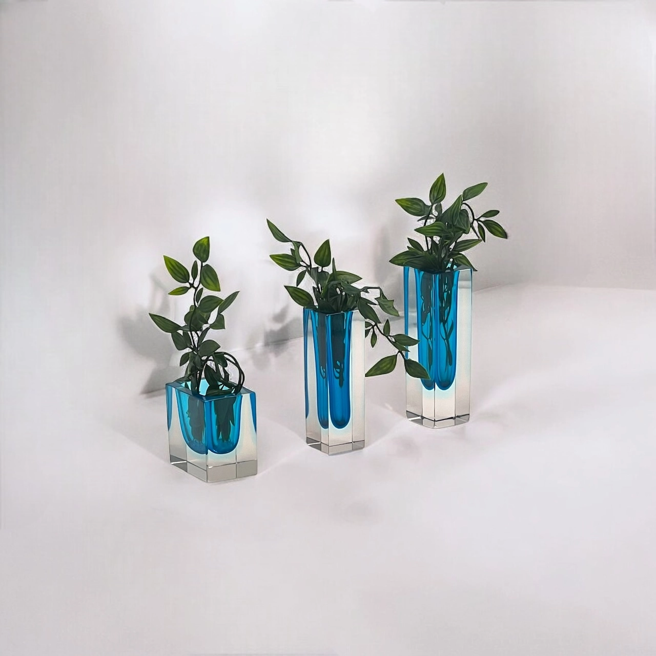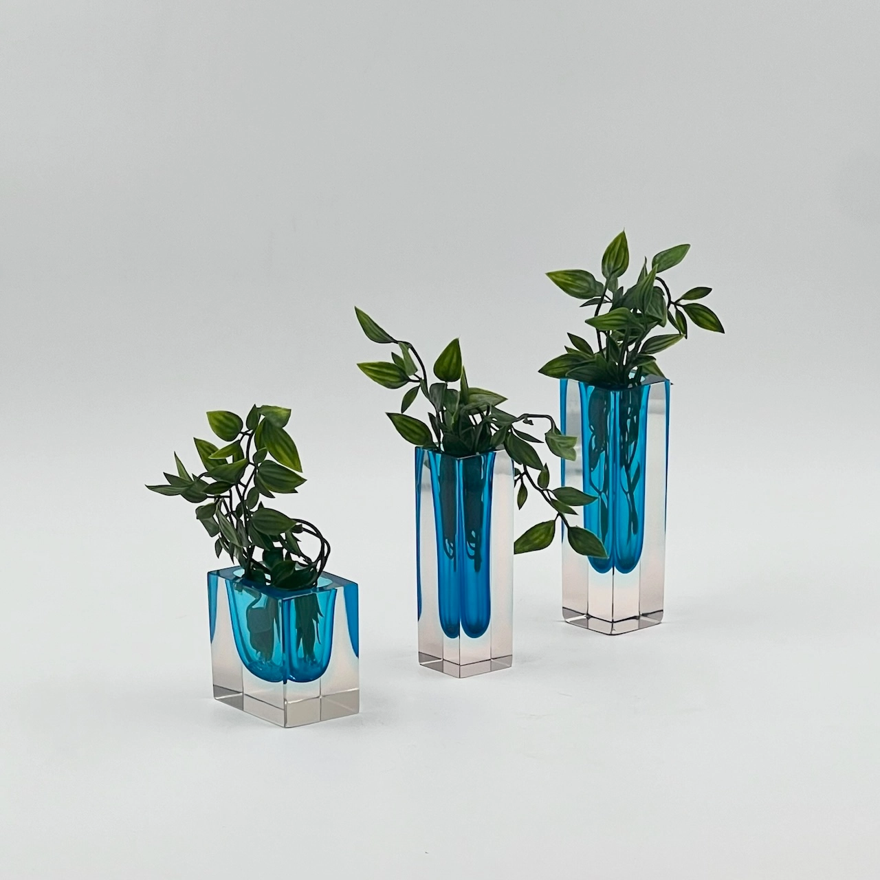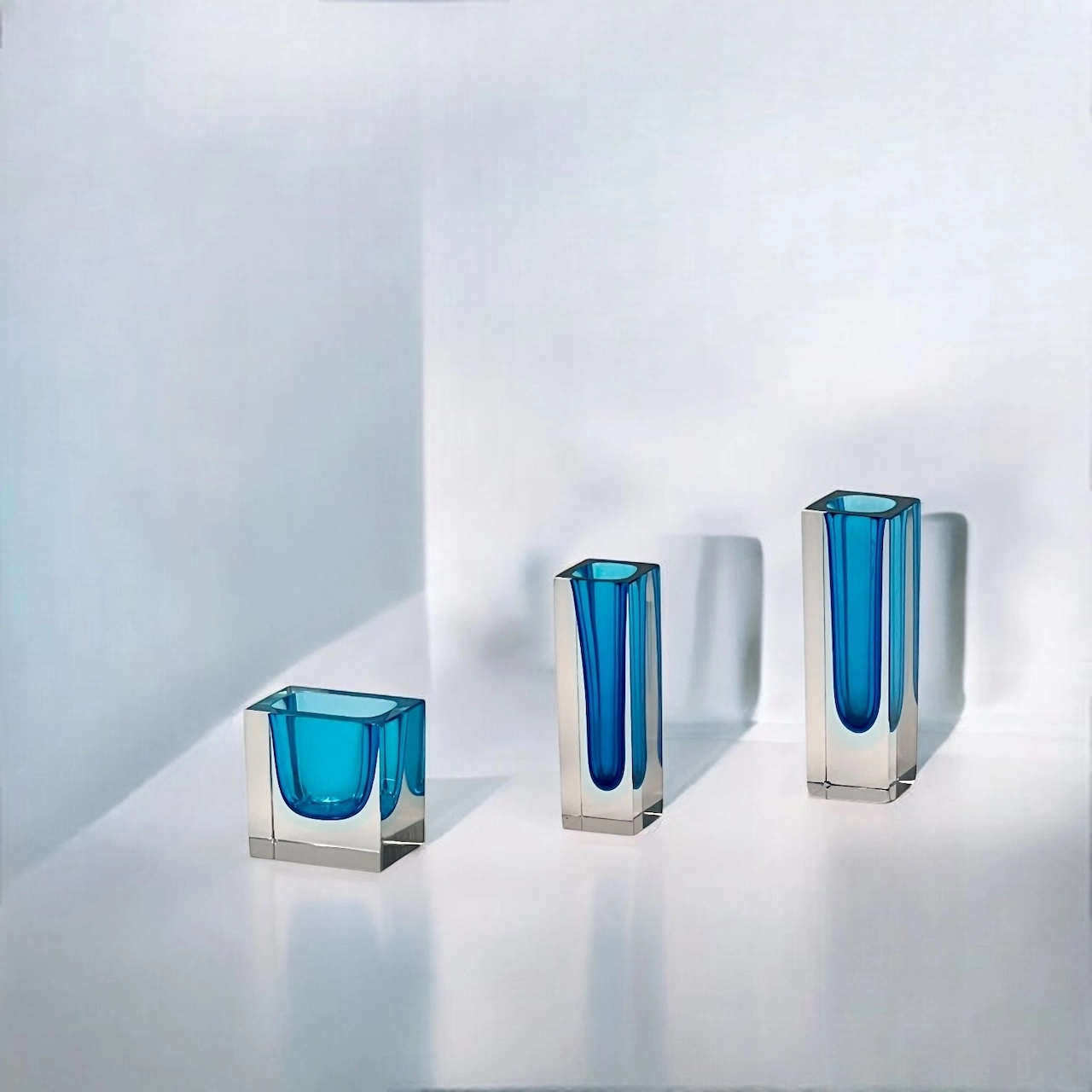 Beautiful trio of Murano Sommerso glass block vases. These vintage 1960s pieces feature stunning blue and pale azure tones, showcasing timeless Murano craftsmanship.