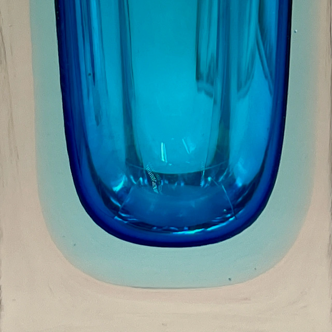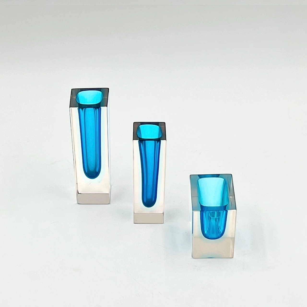 item. glass vasesperiod. 1960/70scountry. italymaterial. hand-blown murano sommerso glasscolor. blue / pale azure transitioning to cleardimensions (cm). small vase: 5 x 7 x 7 H; medium vase: 3.8 x 3.9 x 12.3 H; large vase x 4.5 x 4.3 x 14.3 Hcondition. excellent preservation with minimal minimal, almost imperceptible signs of wear.art. no. 1539
