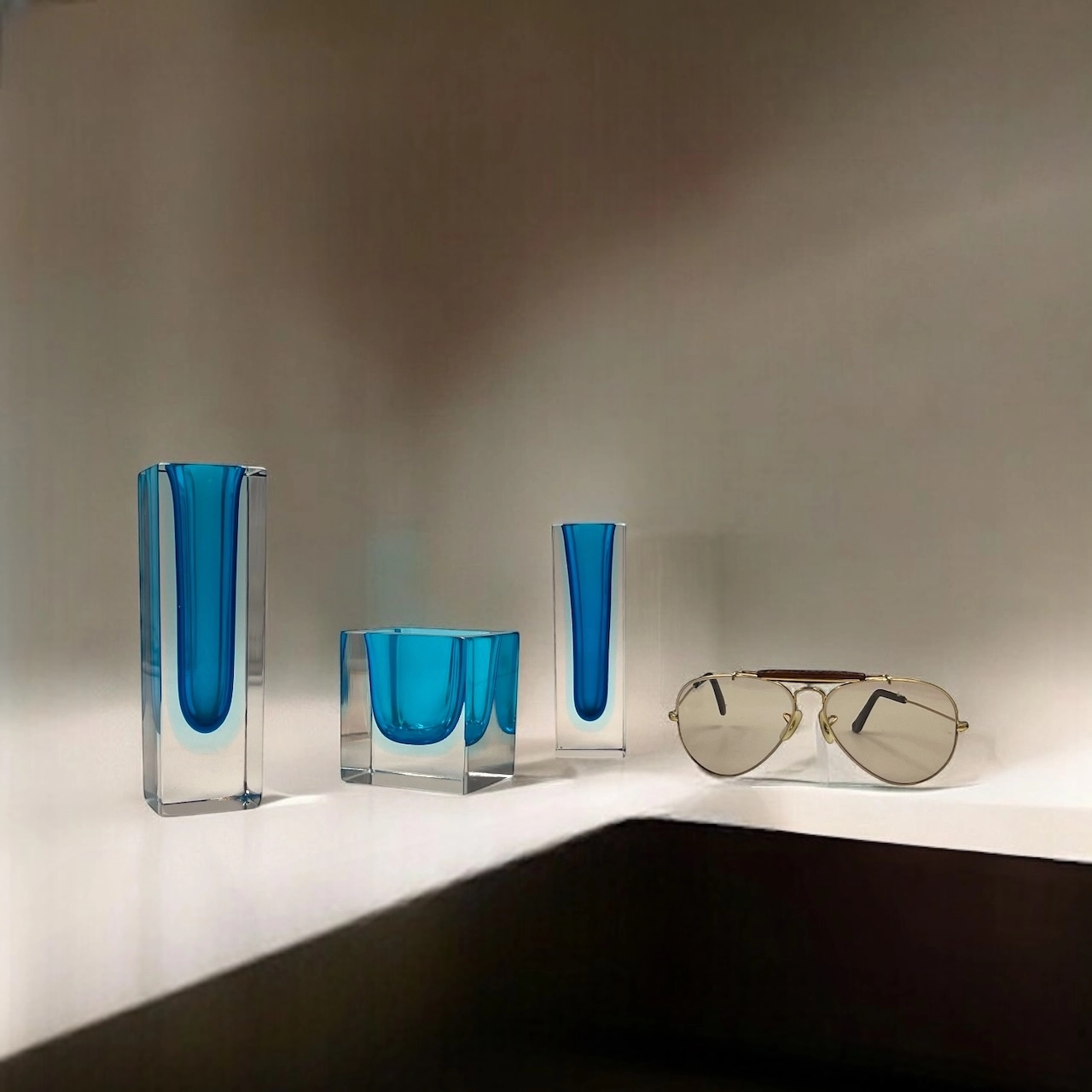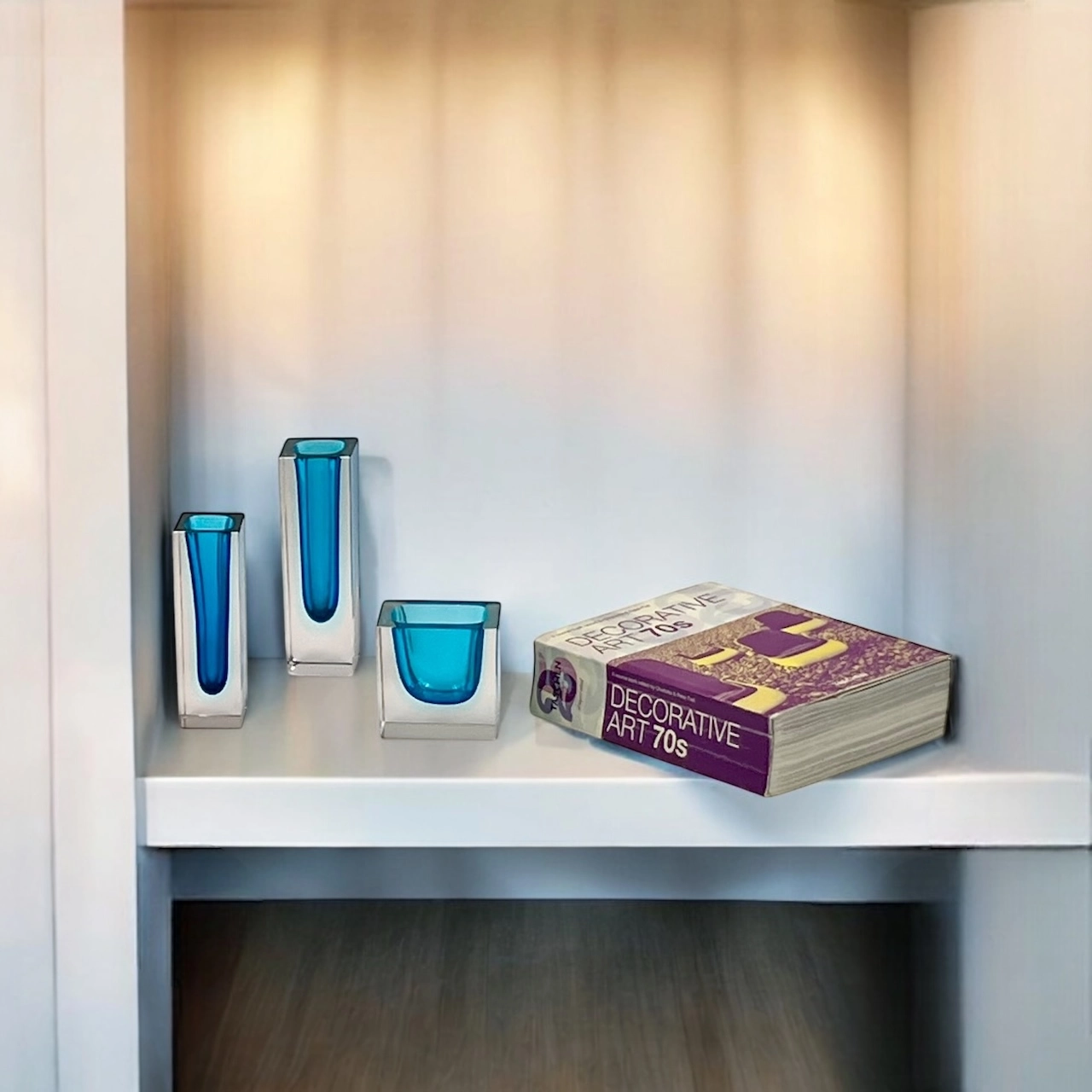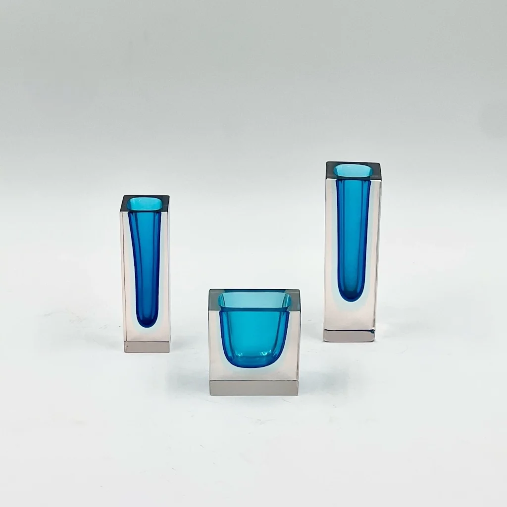 These vintage vases attributed to Alessandro Mandruzzato and created using the iconic Sommerso technique, display beautiful transitions from blue to pale azure and finally to clear glass, offering a captivating play of colours and light.