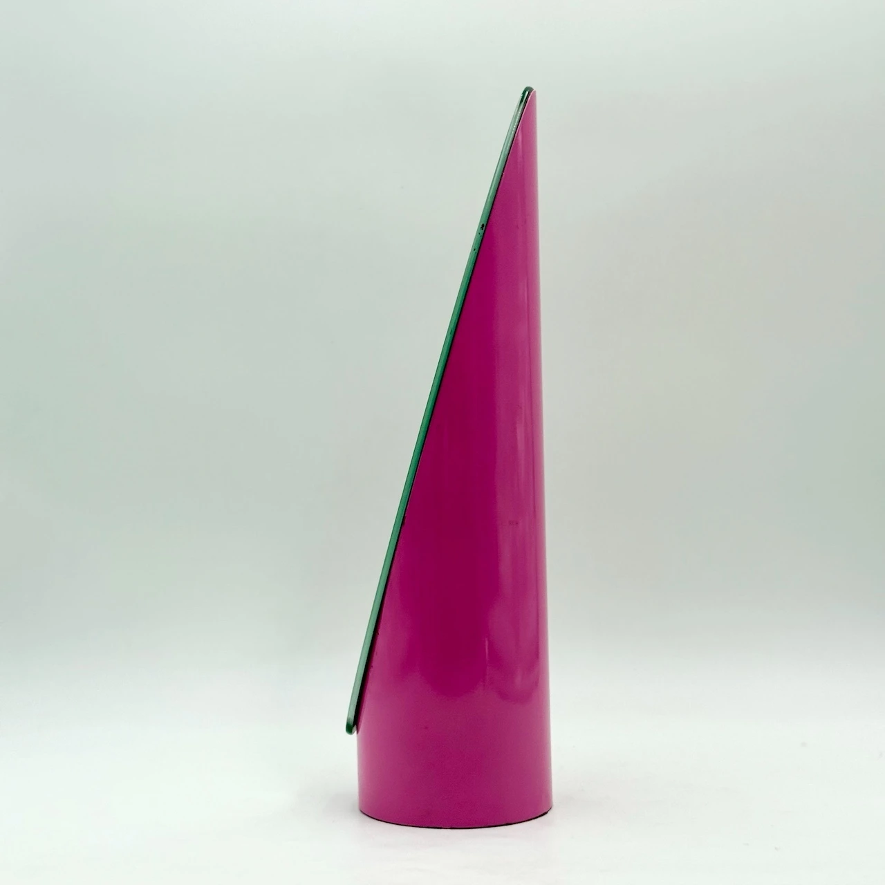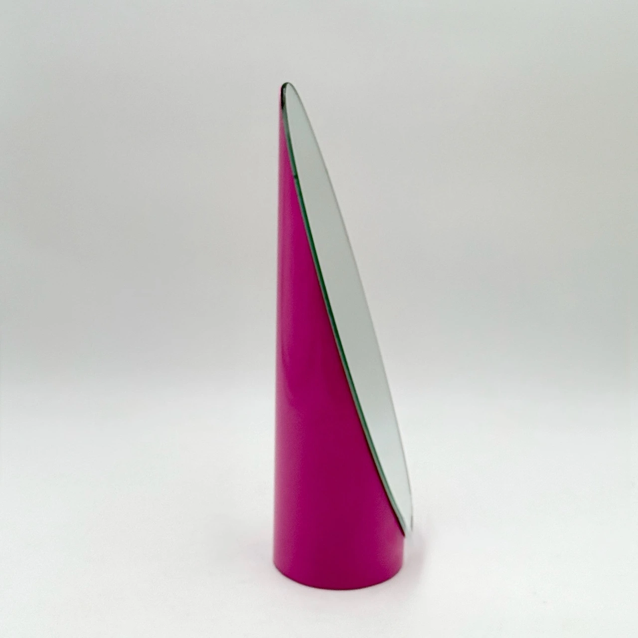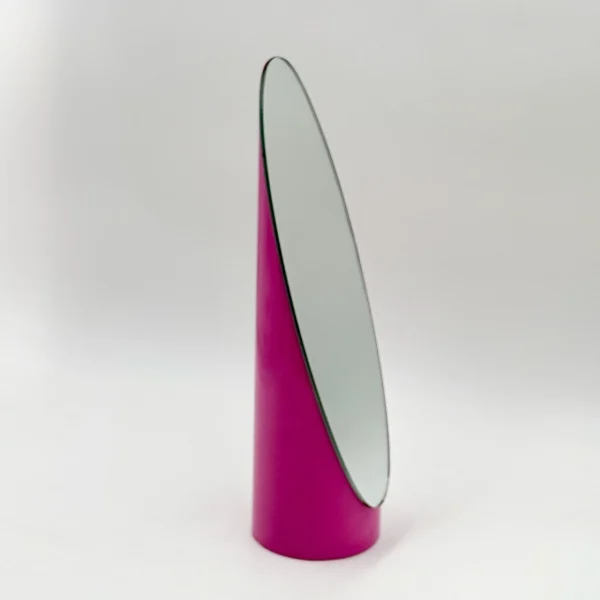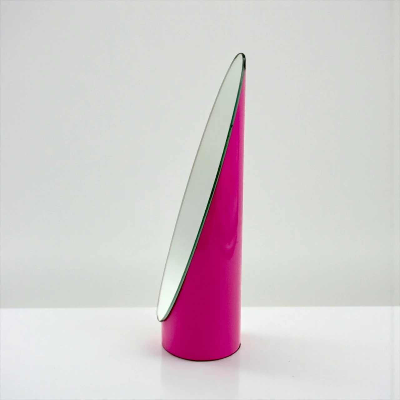 This striking 1970s tabletop mirror captures the playful radicalism of Italian Pop design in a clean, sculptural silhouette. Shaped like a stylized lipstick, it features a vivid fuchsia pink base with a cool magenta undertone, paired with a tilted oval mirror that feels both functional and expressive.