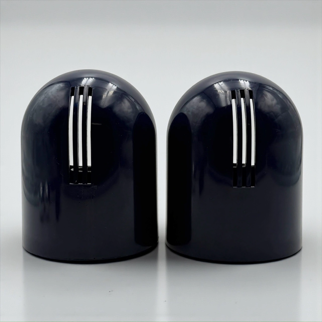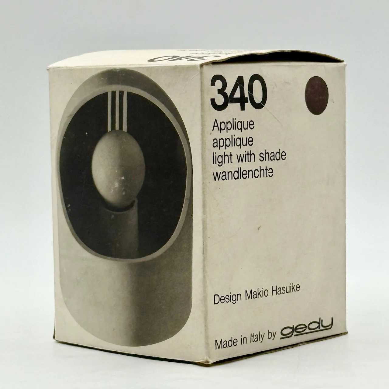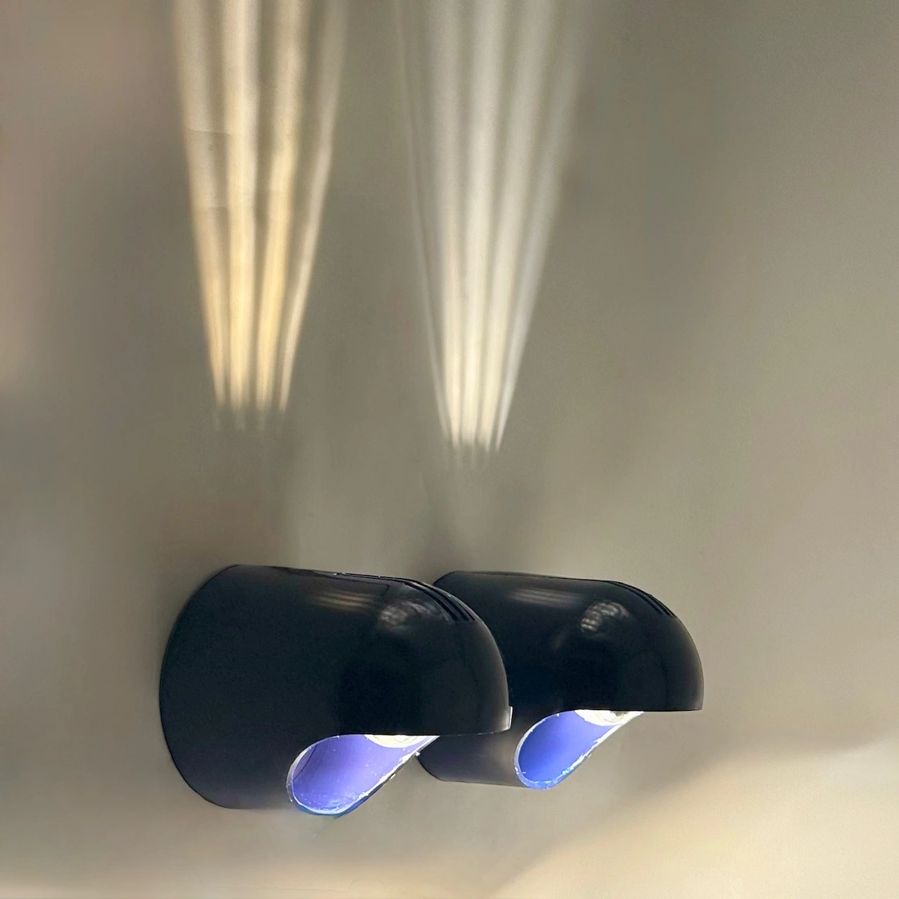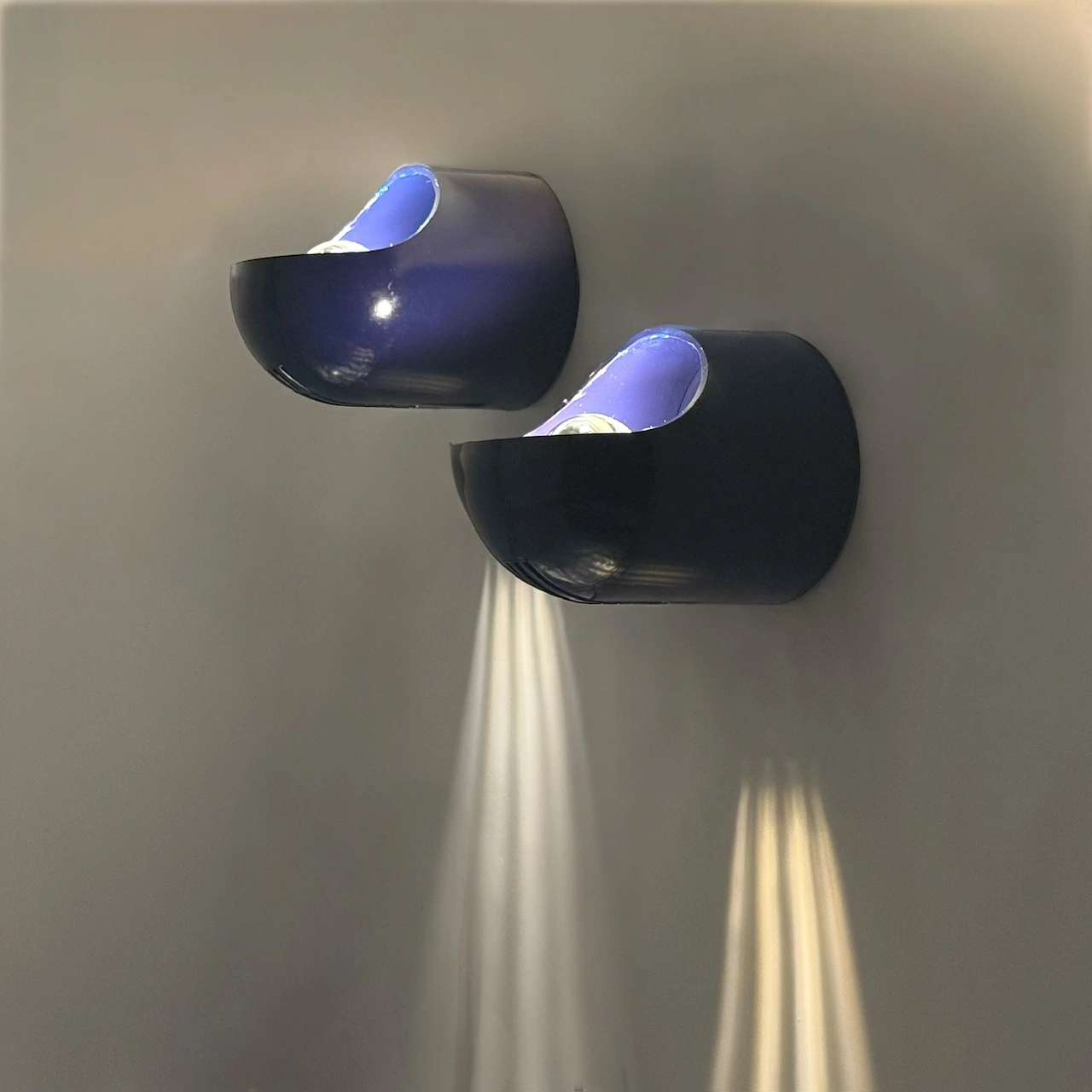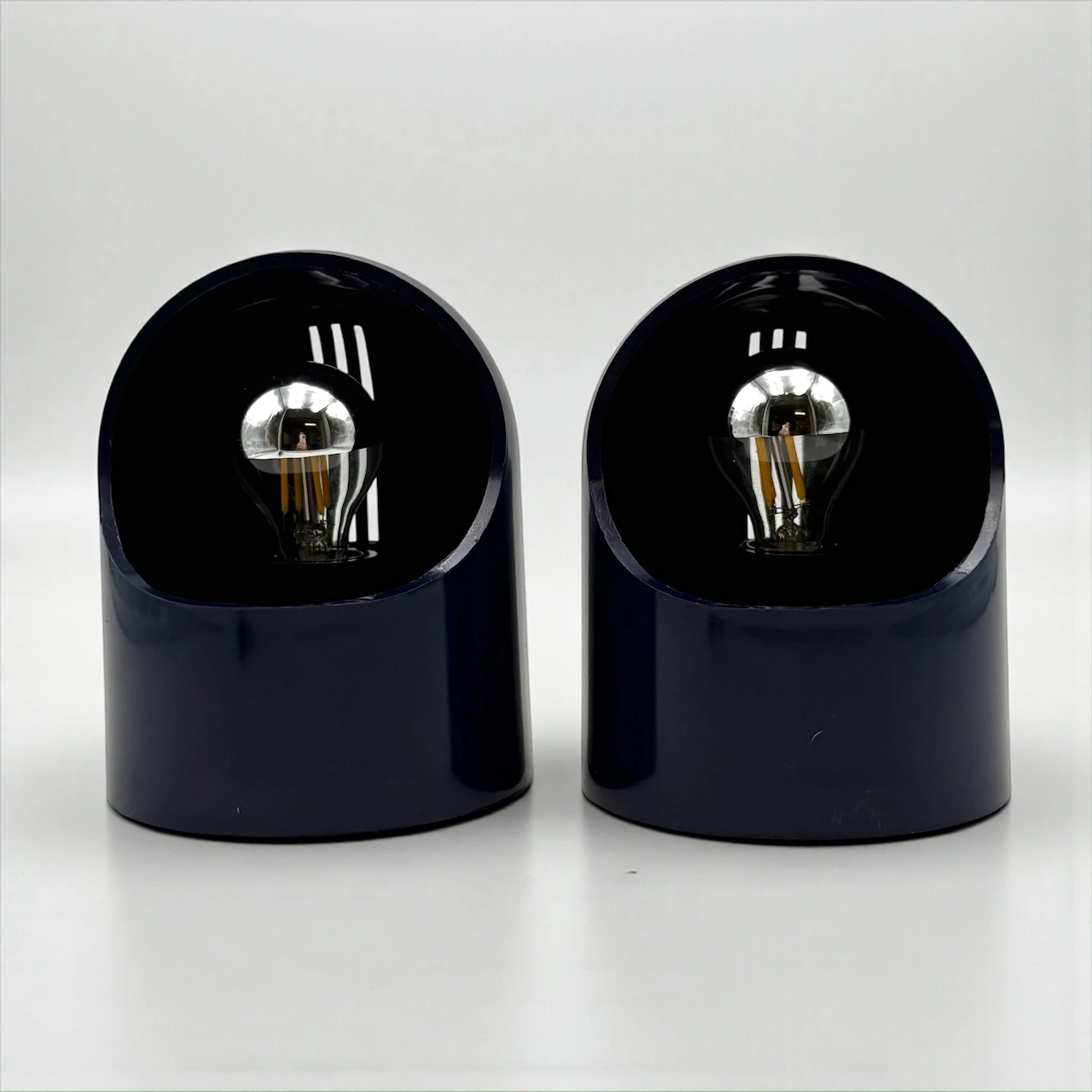These Gedy wall lamps were designed by Makio Hasuike in the 1970s. They show the spirit of Italian Space Age design, when lighting became a simple way to shape atmosphere. Each lamp, known as Model 340, has a smooth curved body made of glossy blue plastic. Its round opening spreads a soft beam of light, creating warmth and gentle reflections on the wall.