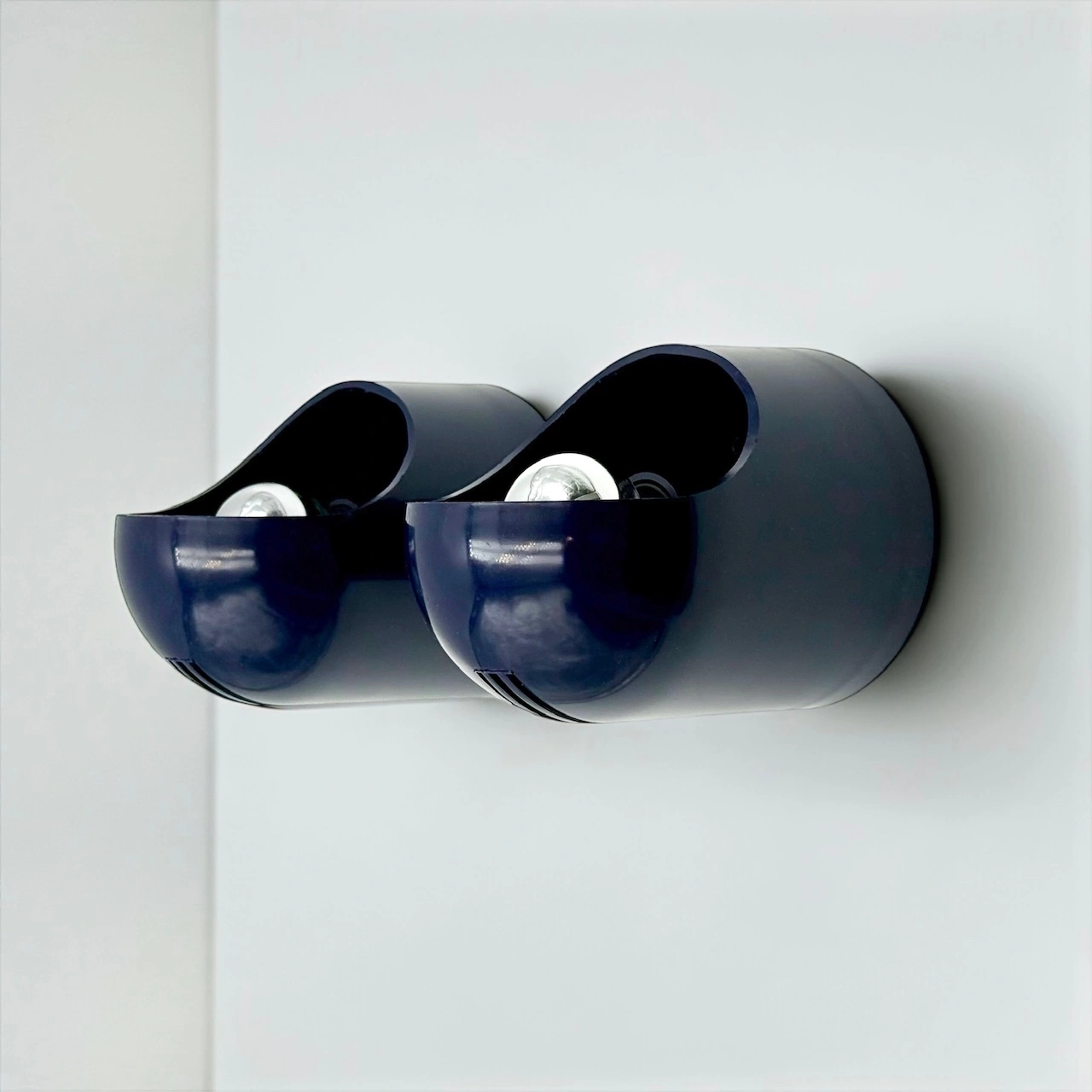 Pair of original 1970s Gedy wall lamps designed by Makio Hasuike. Glossy blue plastic, sculptural curves, and soft directional light. Rare Space Age design icons that blend Italian innovation and timeless form.