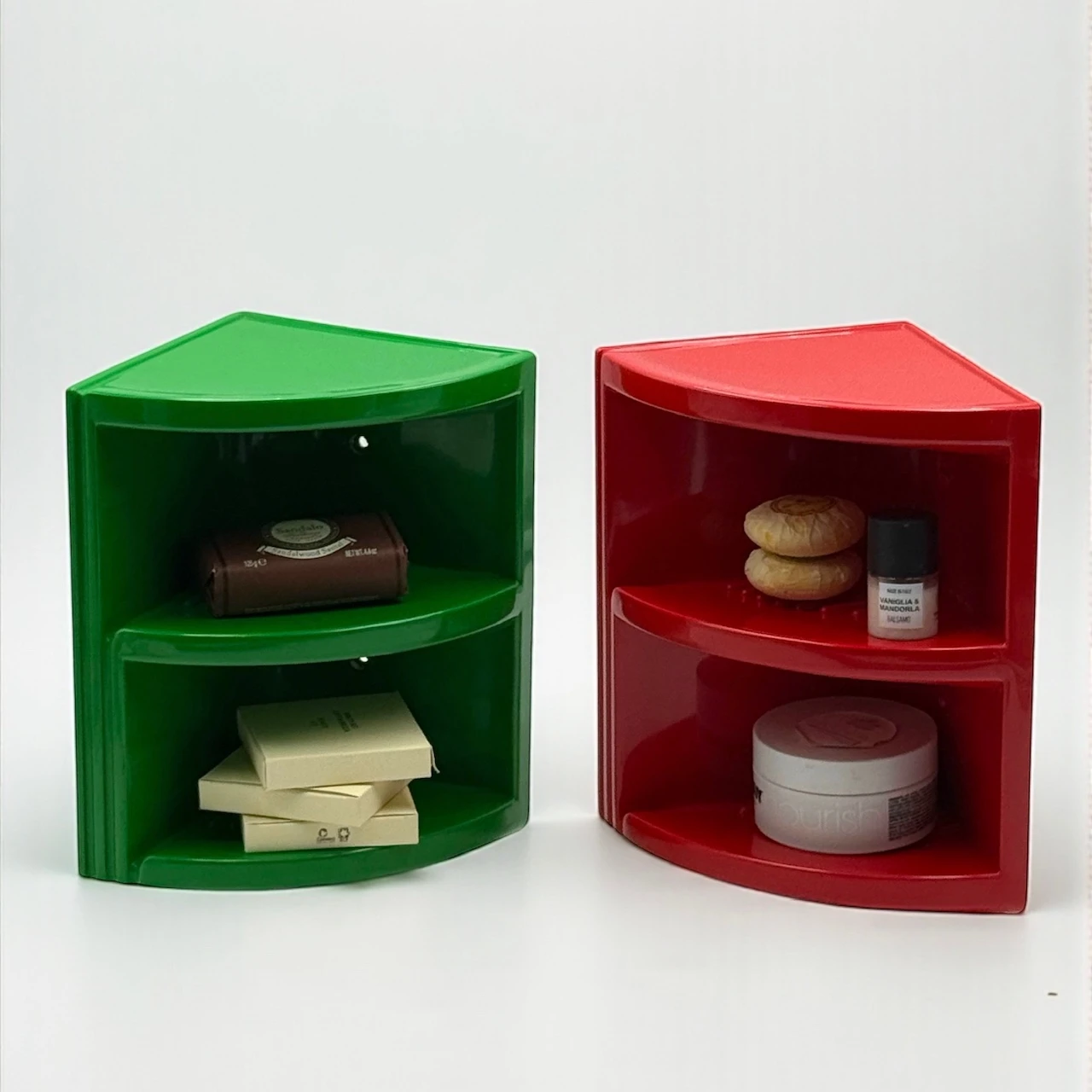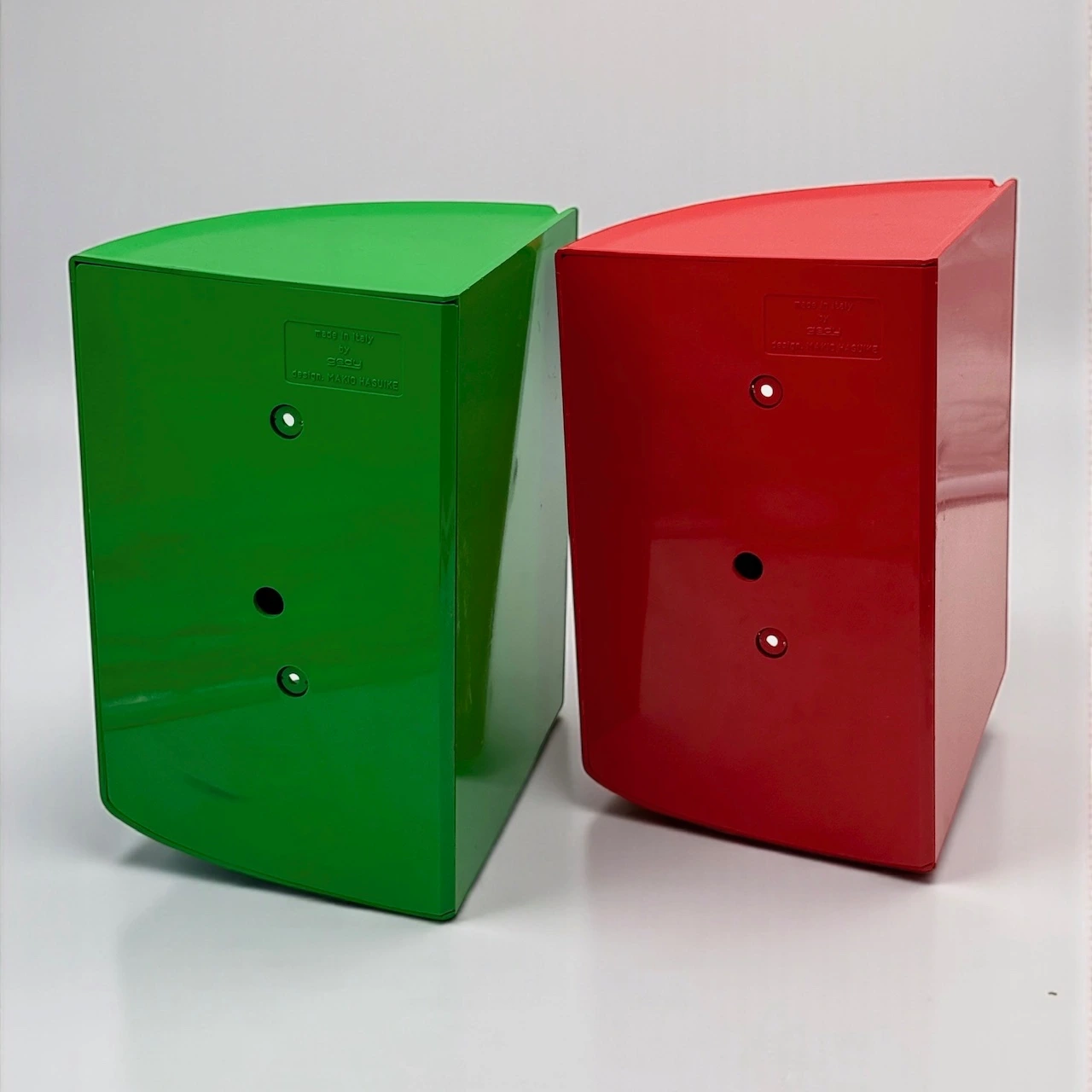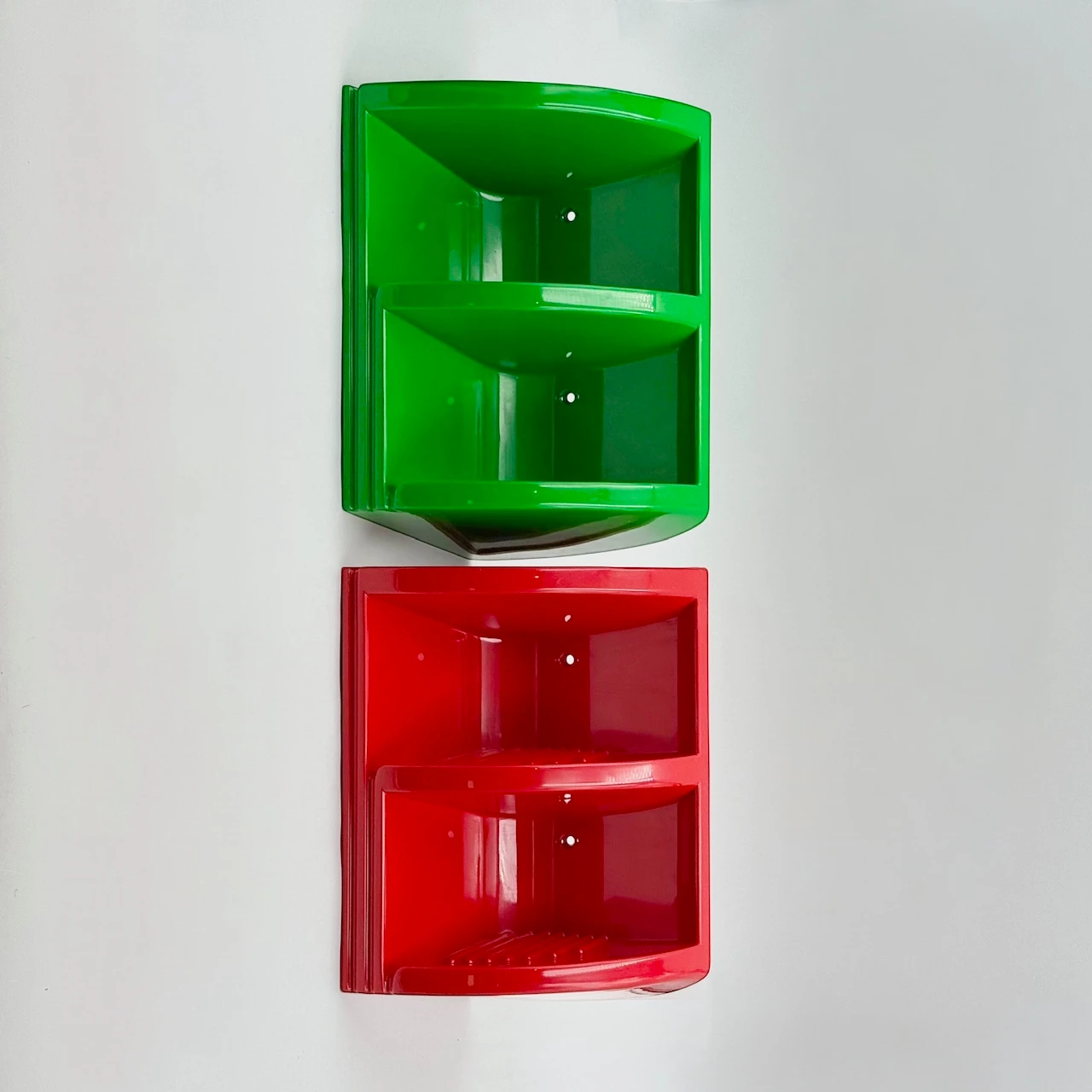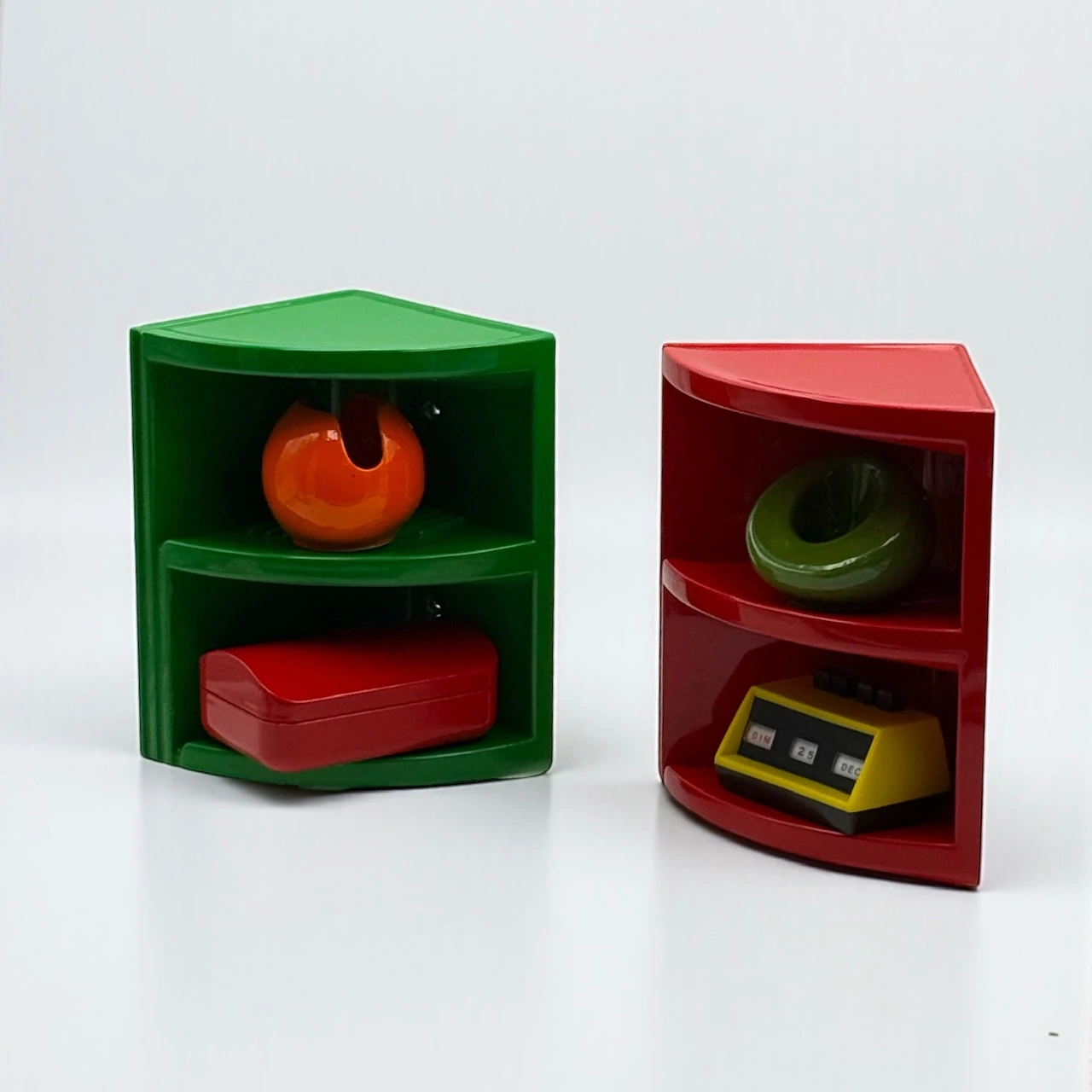 Rendered in vivid red and green plastic, the pair showcases Gedy’s research into colour, form, and durability at the time. Their glossy finish and sculptural geometry bring a lively, graphic accent to any interior, whether used in a bathroom, kitchen, studio, or as a decorative modular element in modern spaces.