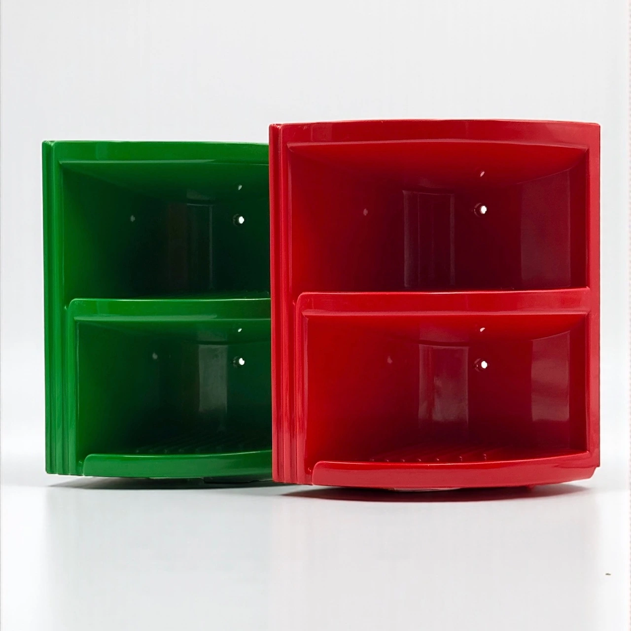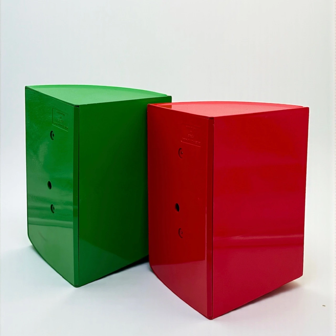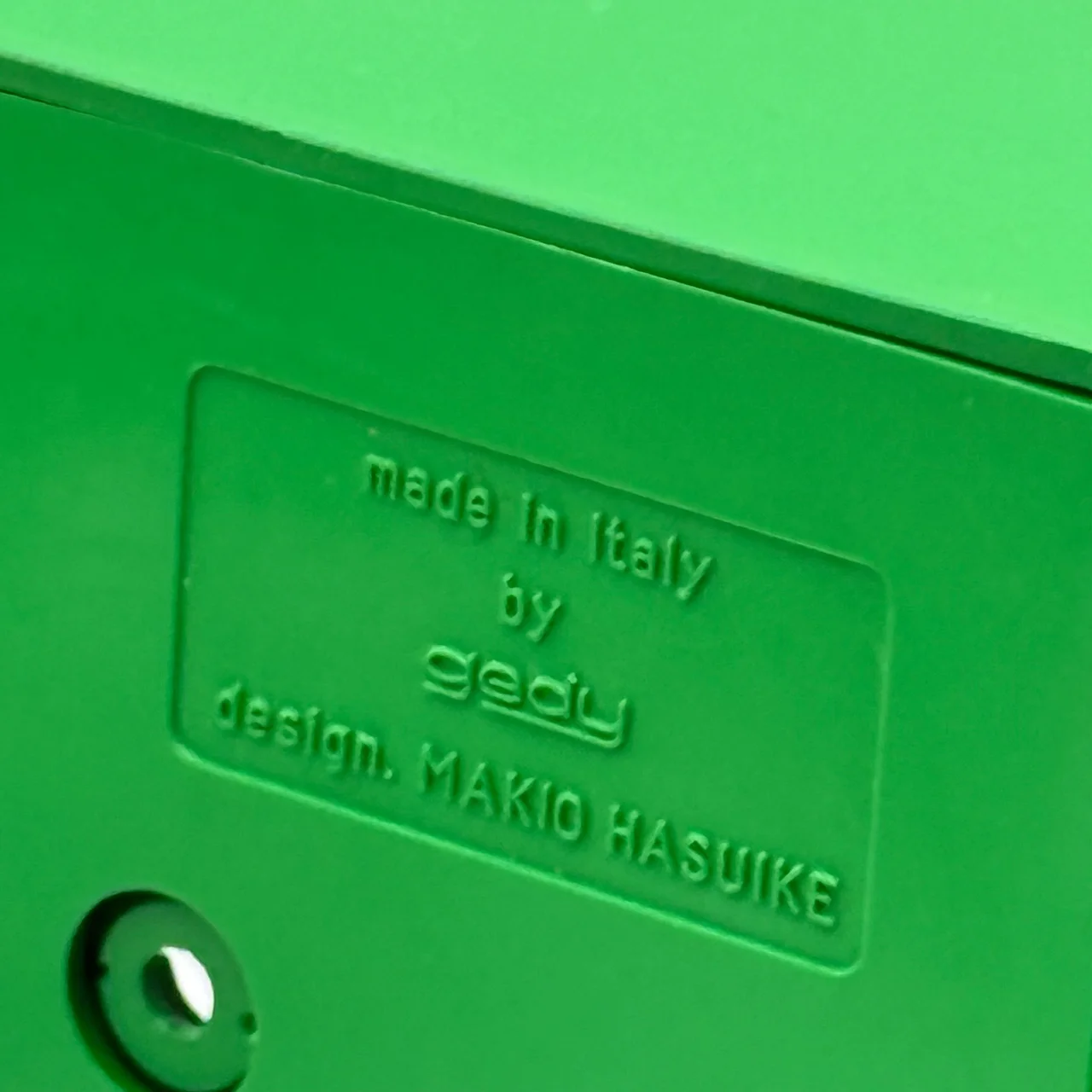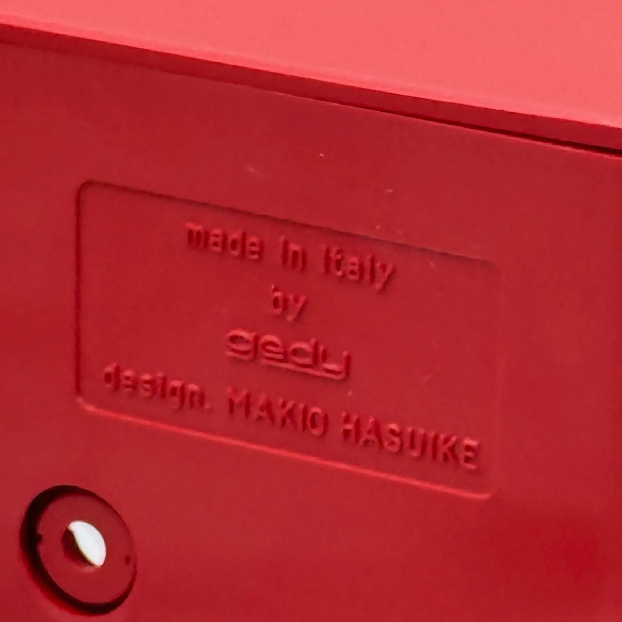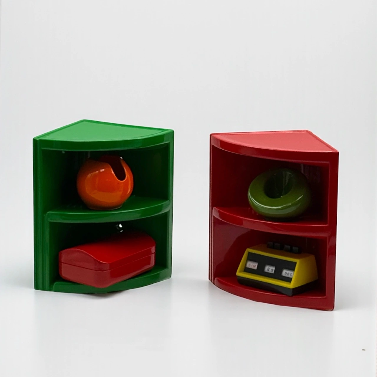 Rendered in vivid red and green plastic, the pair showcases Gedy’s research into colour, form, and durability at the time. Their glossy finish and sculptural geometry bring a lively, graphic accent to any interior, whether used in a bathroom, kitchen, studio, or as a decorative modular element in modern spaces.