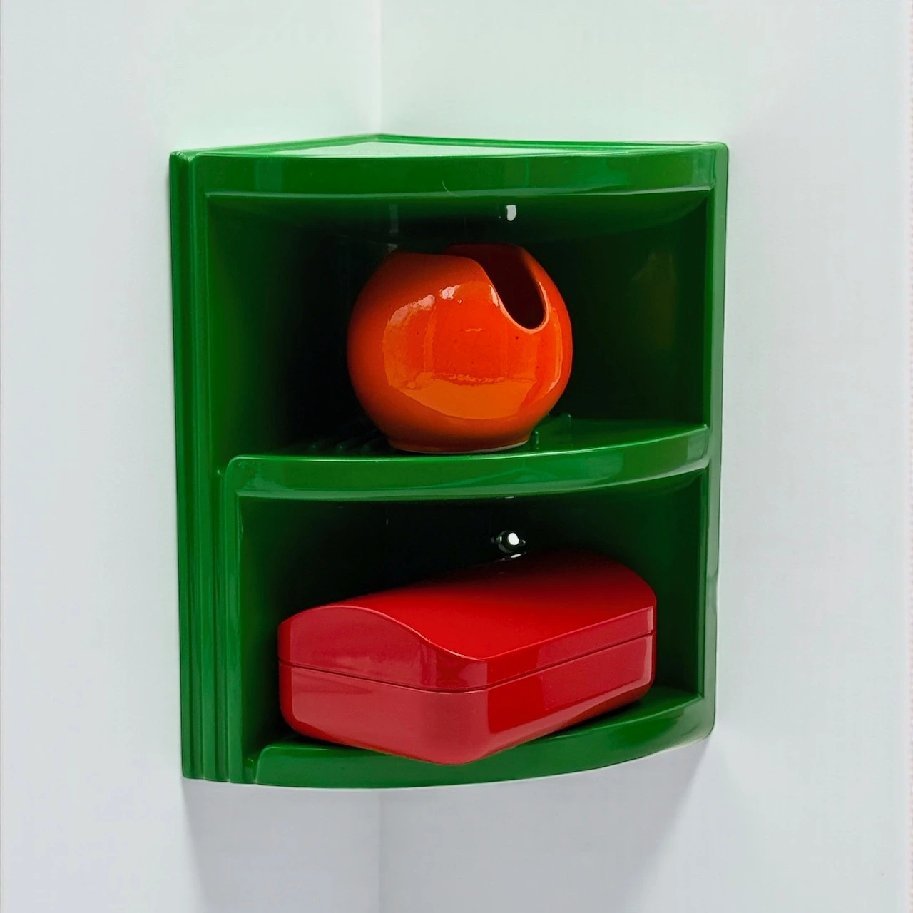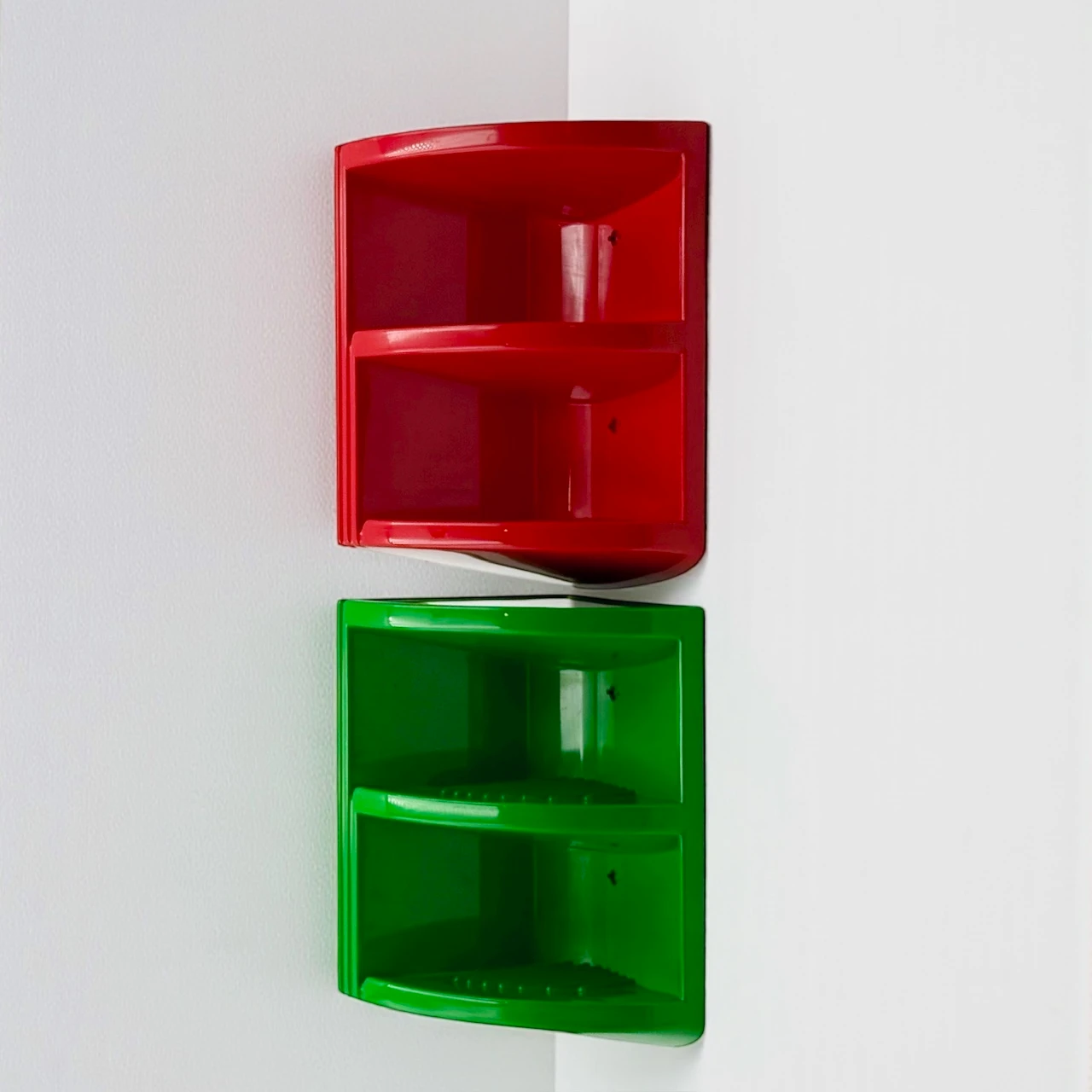 These Gedy Wall Shelves, designed by Makio Hasuike and produced in Italy during the 1970s, express the playful yet precise spirit of Italian Space Age design. Originally conceived for bathroom use, they were fixed to the wall — often inside the shower — to offer compact, practical storage through their curved, two-tier structure with anti slip shelves. Their triangular footprint makes them efficient and architectural, adding function without occupying visual space.