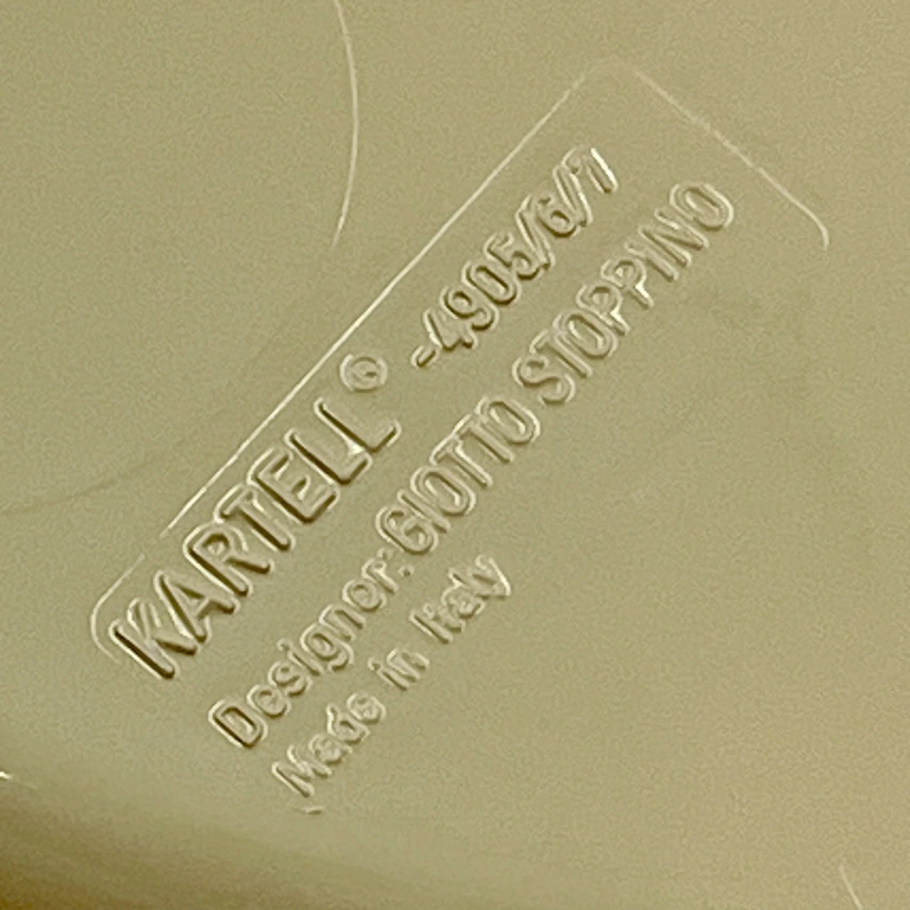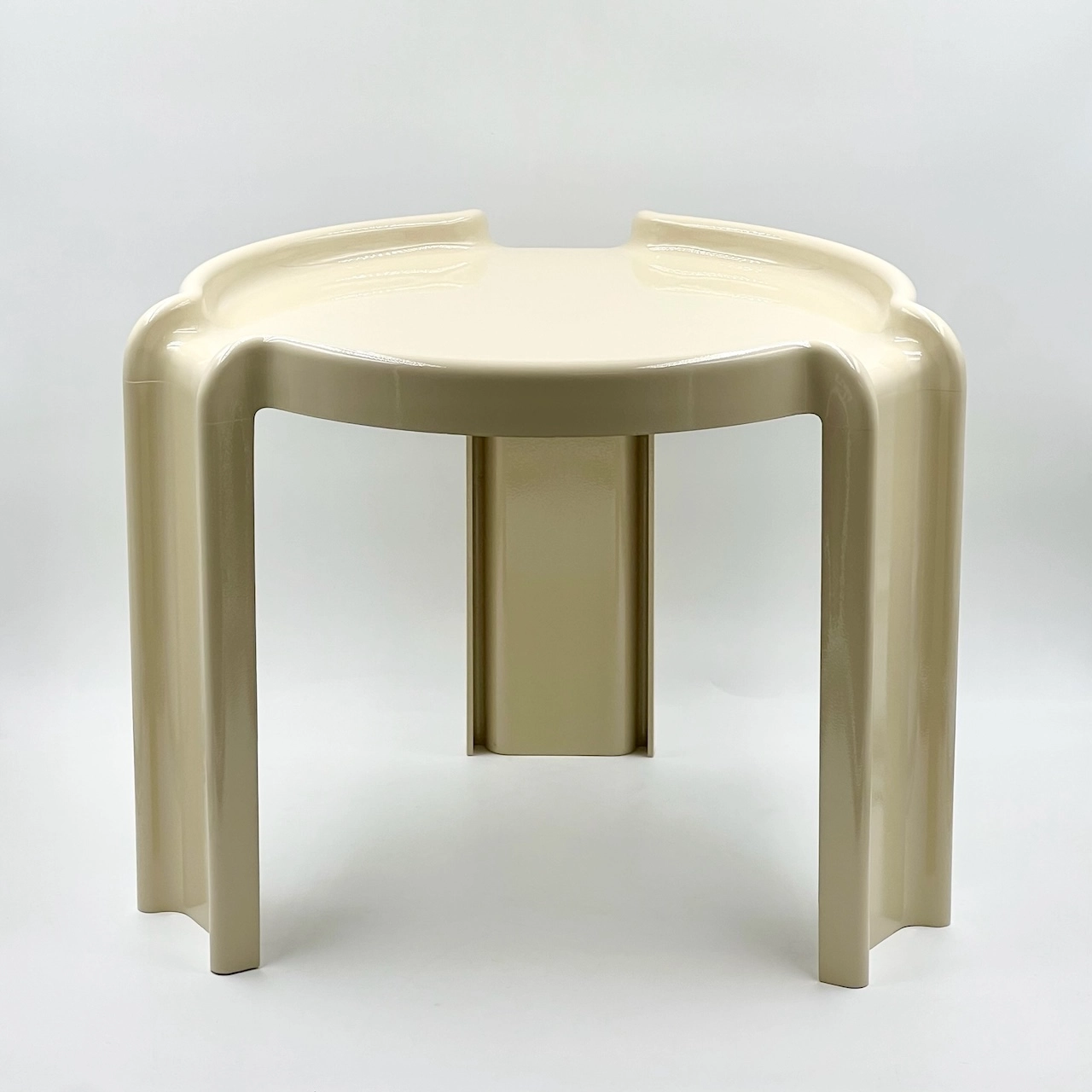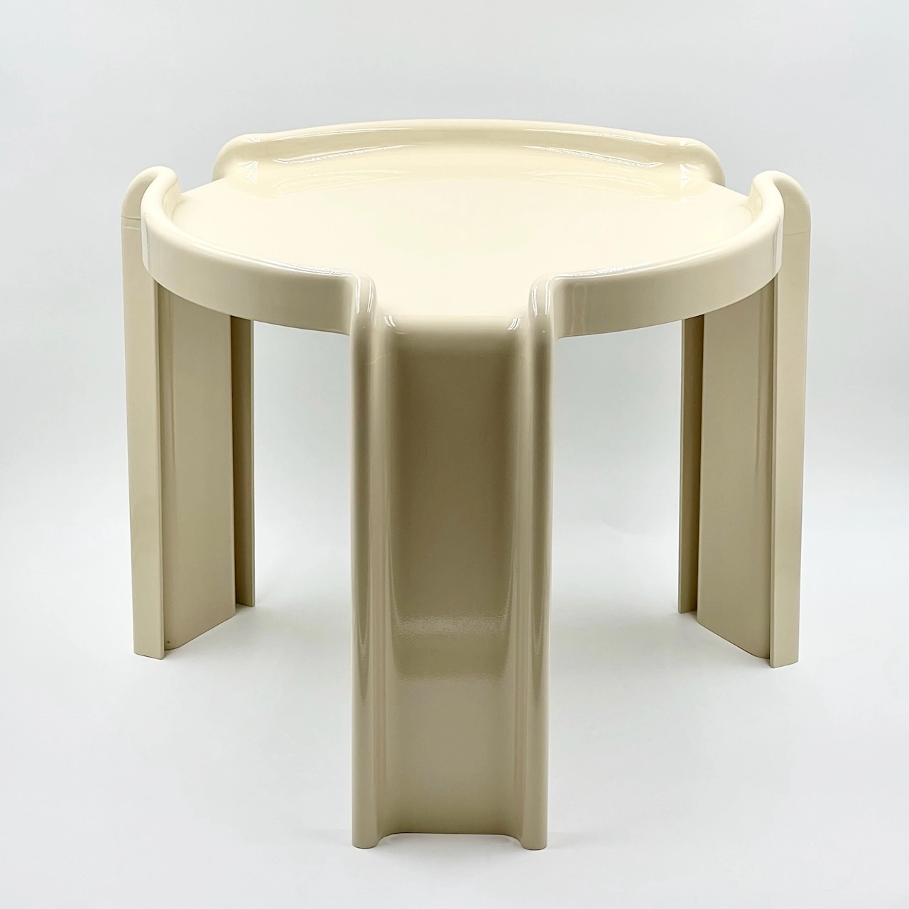item. coffee tablemodel. 4905/6/7designer. Giotto Stoppinomaker. Kartellperiod. 70scountry. Italymaterial. moulded plasticcolor. creamdimensions (cm). 45 x 45 x 37 (H)condition. excellent vintage condition, with the color professionally restored to its original glossy shine. small signs of wear, including minor smudges and a very faint hairline crack (see pictures).
