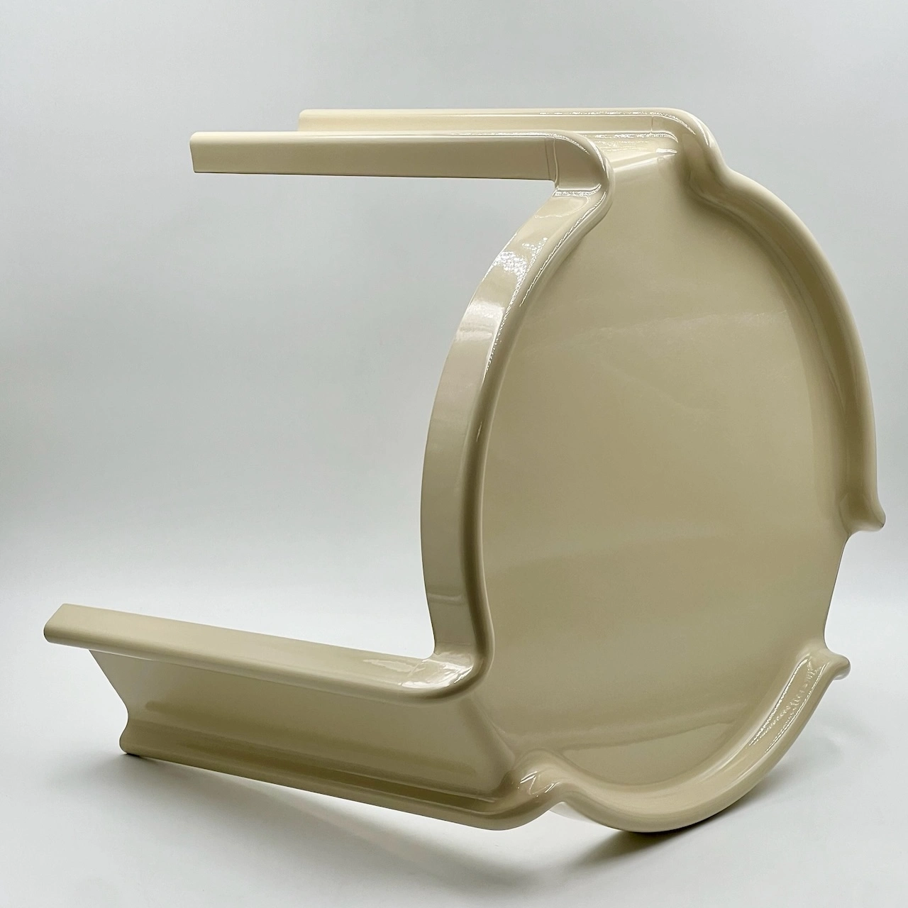 Originally intended as a set of nesting tables, this Giotto Stoppino creation reflects the essence of Space Age creativity with its rounded, curving forms and smooth edges. Crafted from high-quality molded plastic, the table’s circular structure showcases Kartell’s commitment to blending durability with a futuristic, avant-garde look. Its unique elevated edge design, apart from enhancing the table’s visual appeal, adds a practical touch by helping to secure items placed on it. At 37 cm in height and 45 cm in diameter, it’s a versatile piece that brings a distinct vintage charm to any interior setting, effortlessly enhancing both modern and retro spaces.