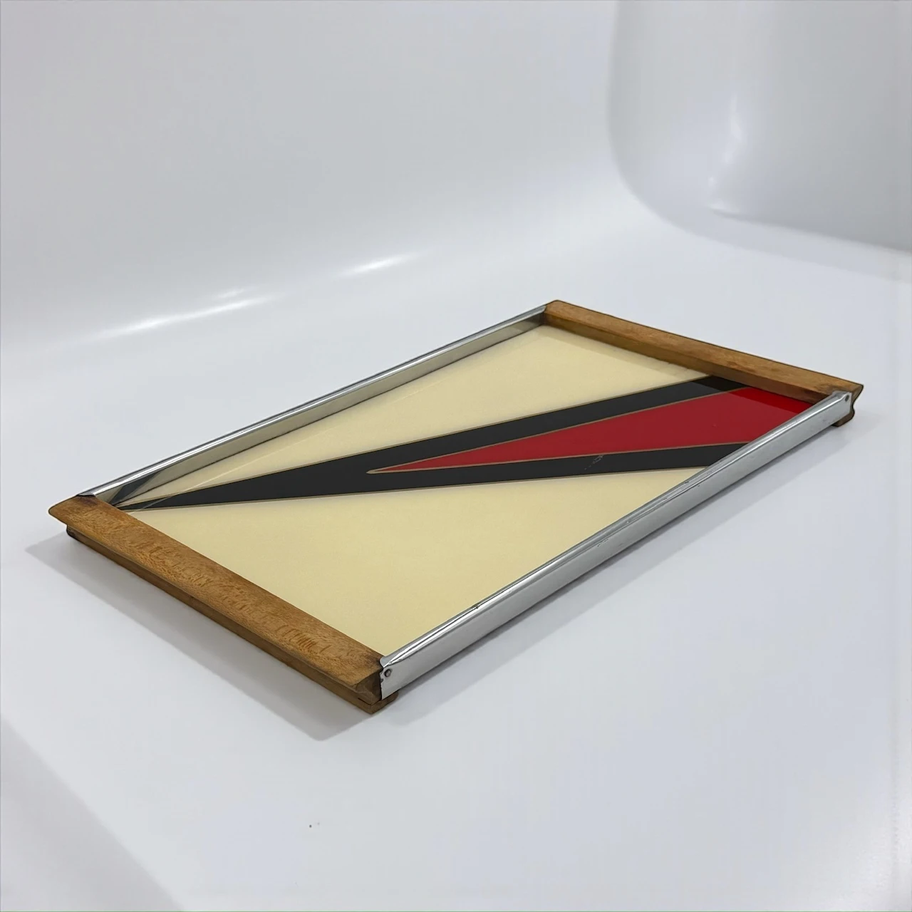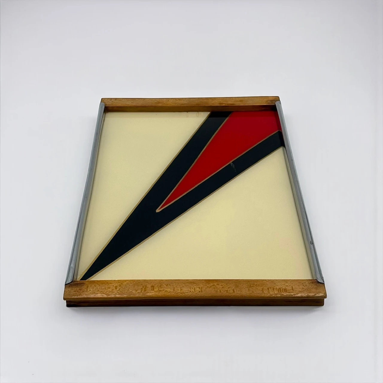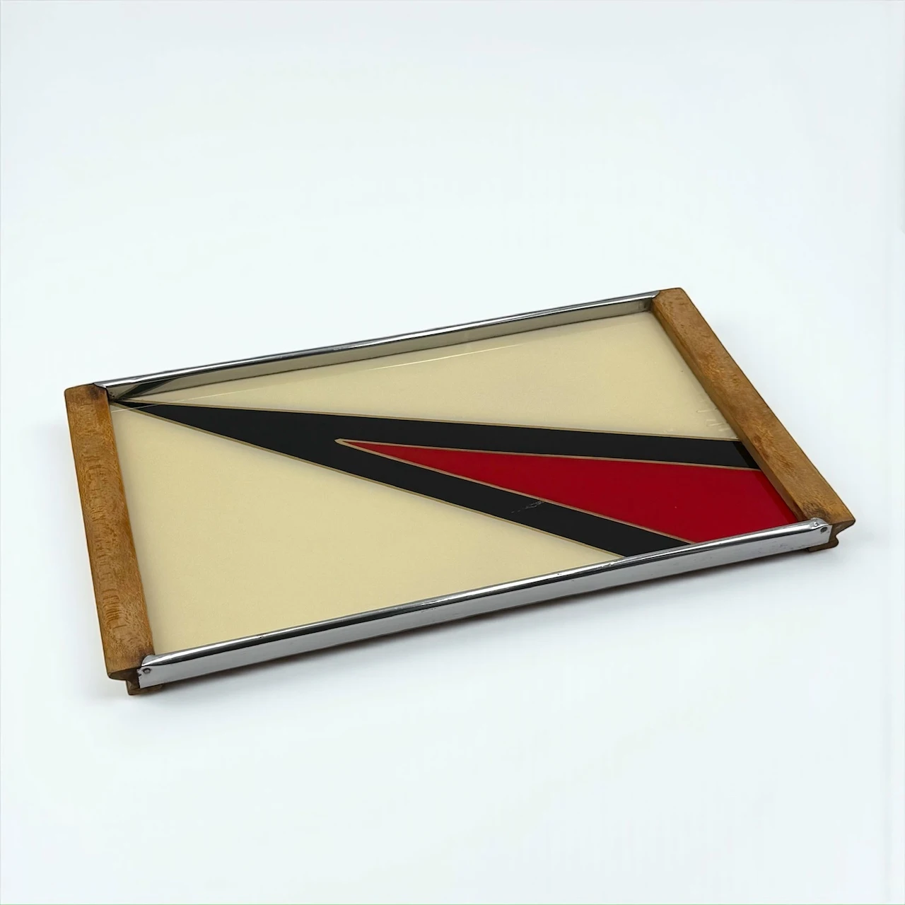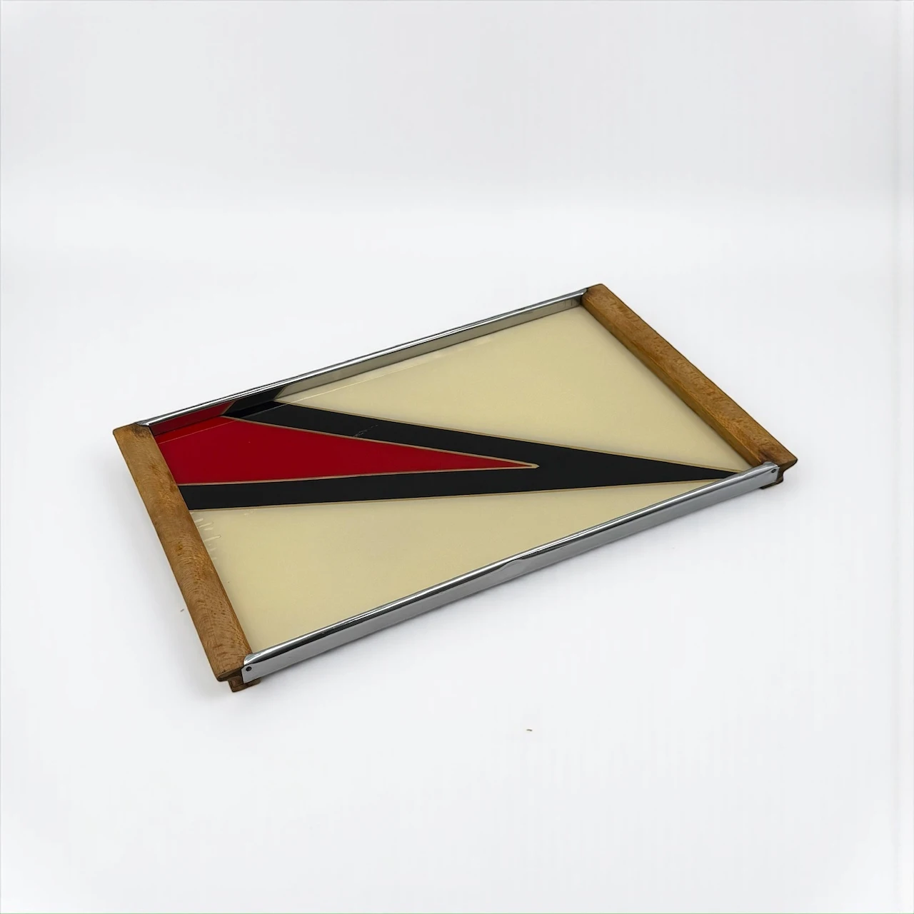 The rectangular structure features a glass top protecting a geometric composition arranged beneath the surface. The design is articulated through diagonal planes in cream, black and red, creating contrast, rhythm and directional movement typical of 1970s European interiors. The metal perimeter frame provides structural balance, while the wooden handles introduce warmth and tactile presence.