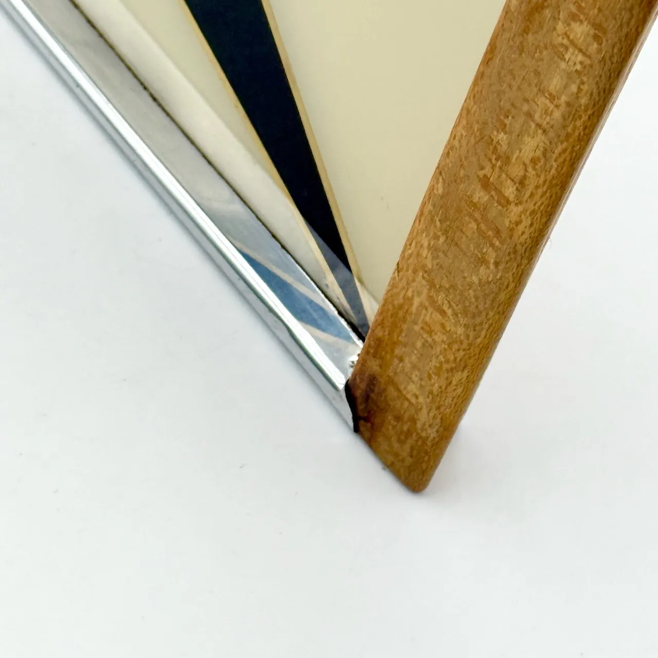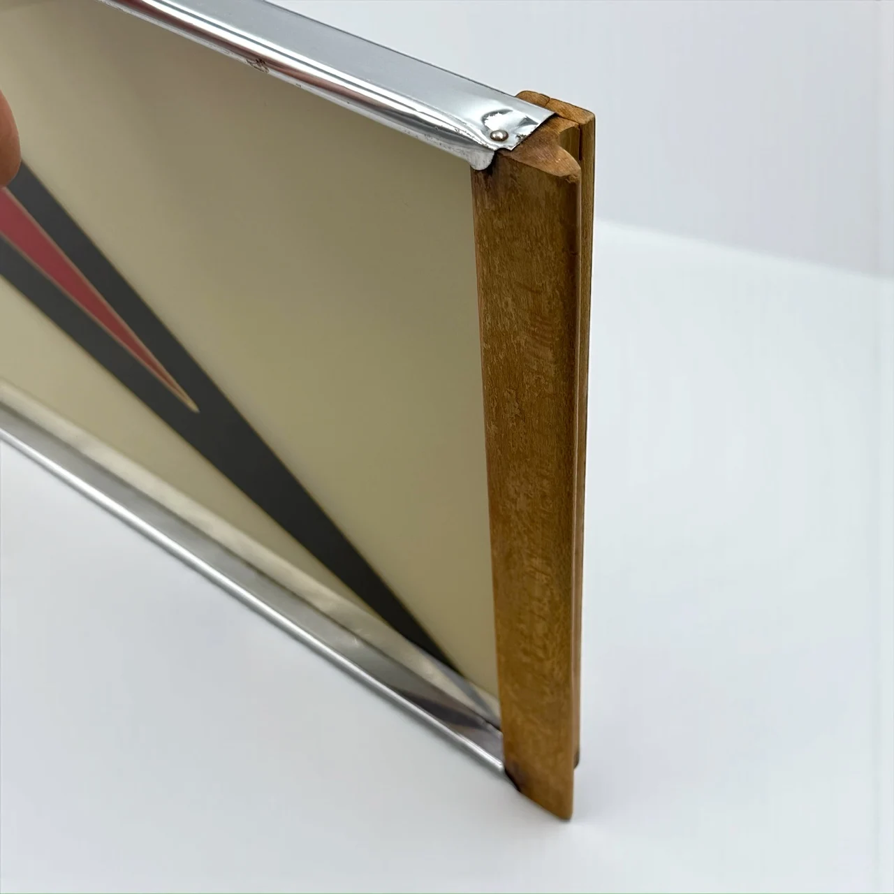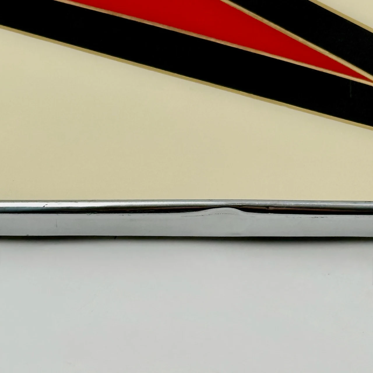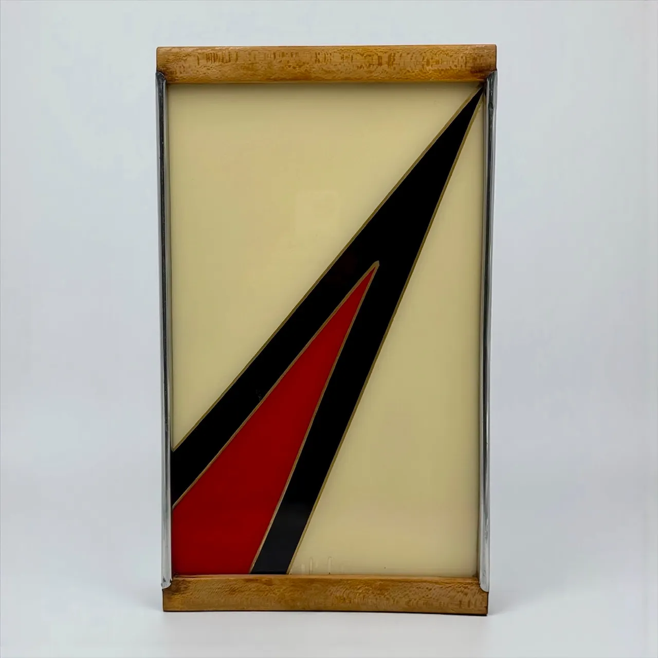 The rectangular structure features a glass top protecting a geometric composition arranged beneath the surface. The design is articulated through diagonal planes in cream, black and red, creating contrast, rhythm and directional movement typical of 1970s European interiors. The metal perimeter frame provides structural balance, while the wooden handles introduce warmth and tactile presence.
