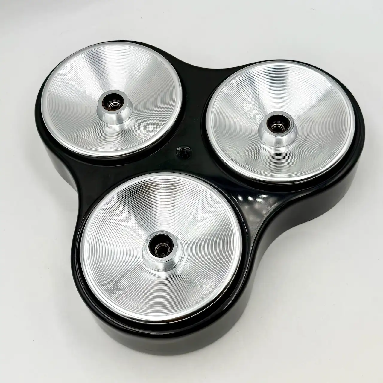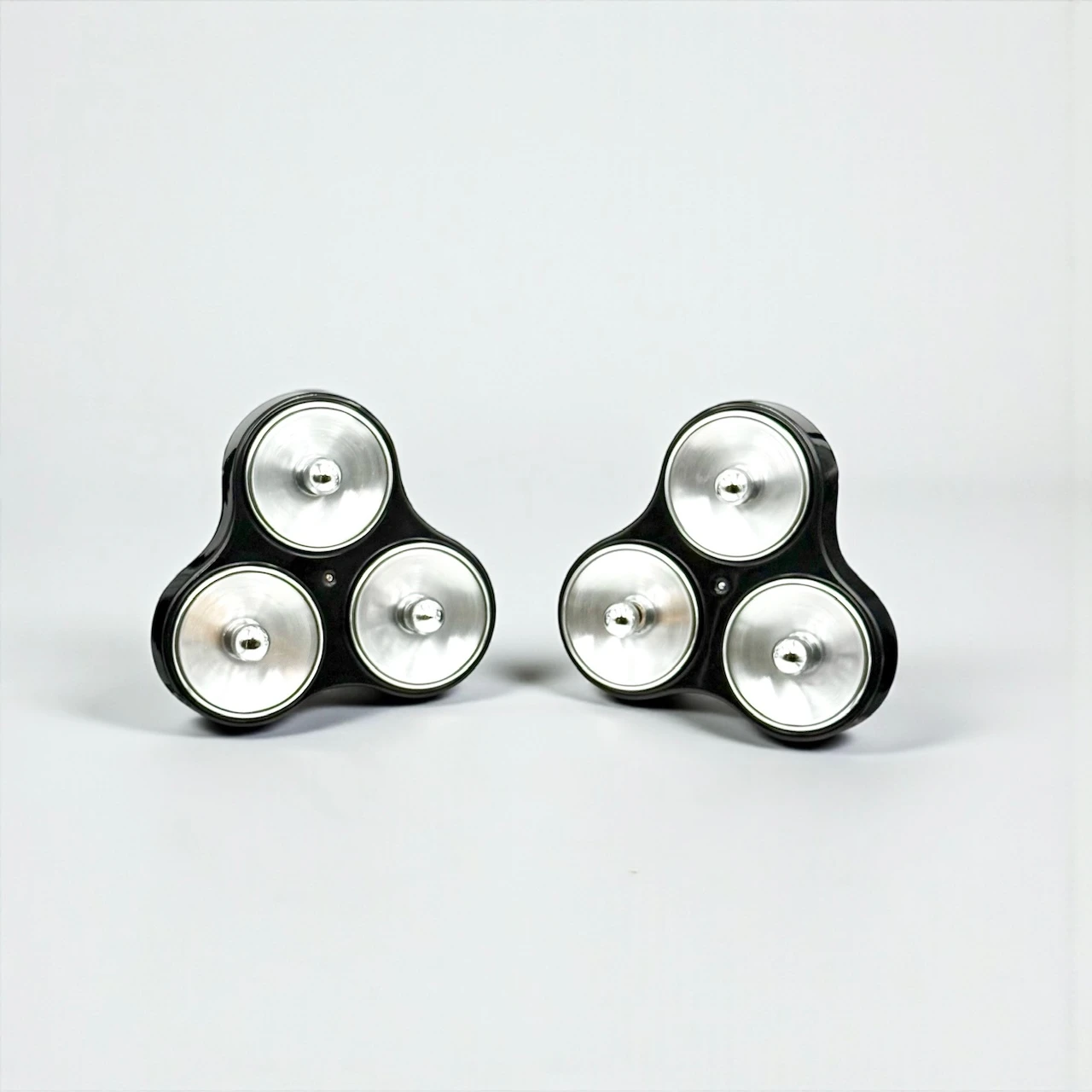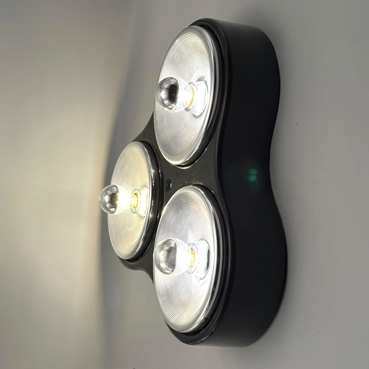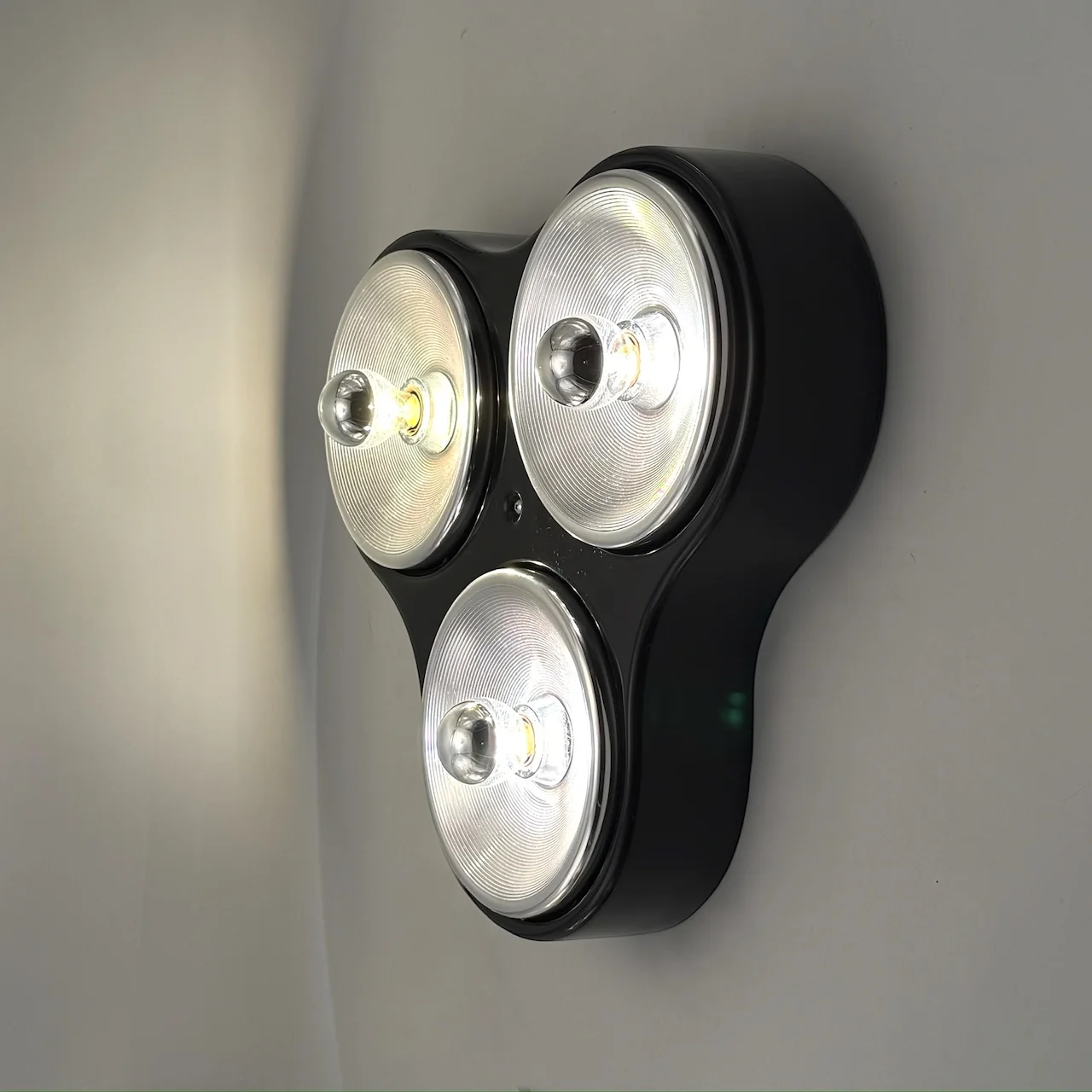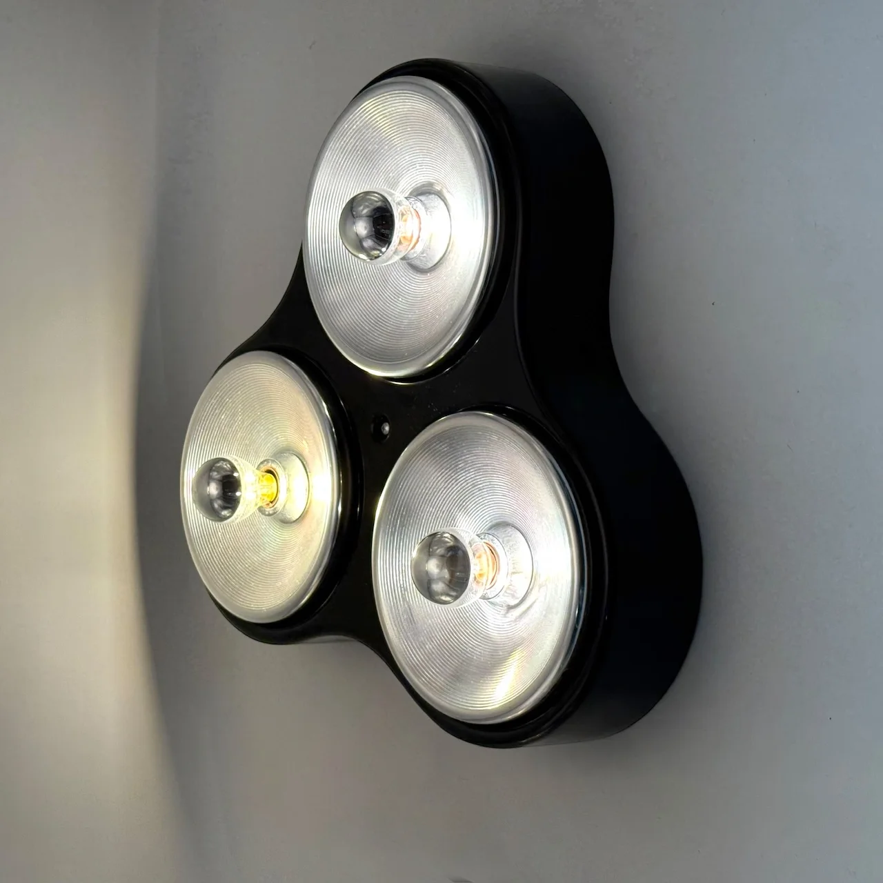 Each lamp features a distinctive clover shaped body made of glossy black ABS plastic, housing three chromed light diffusers arranged in a balanced triangular composition. The contrast between the dark plastic shell and the reflective metal elements enhances the graphic impact of the design and reinforces its futuristic character.