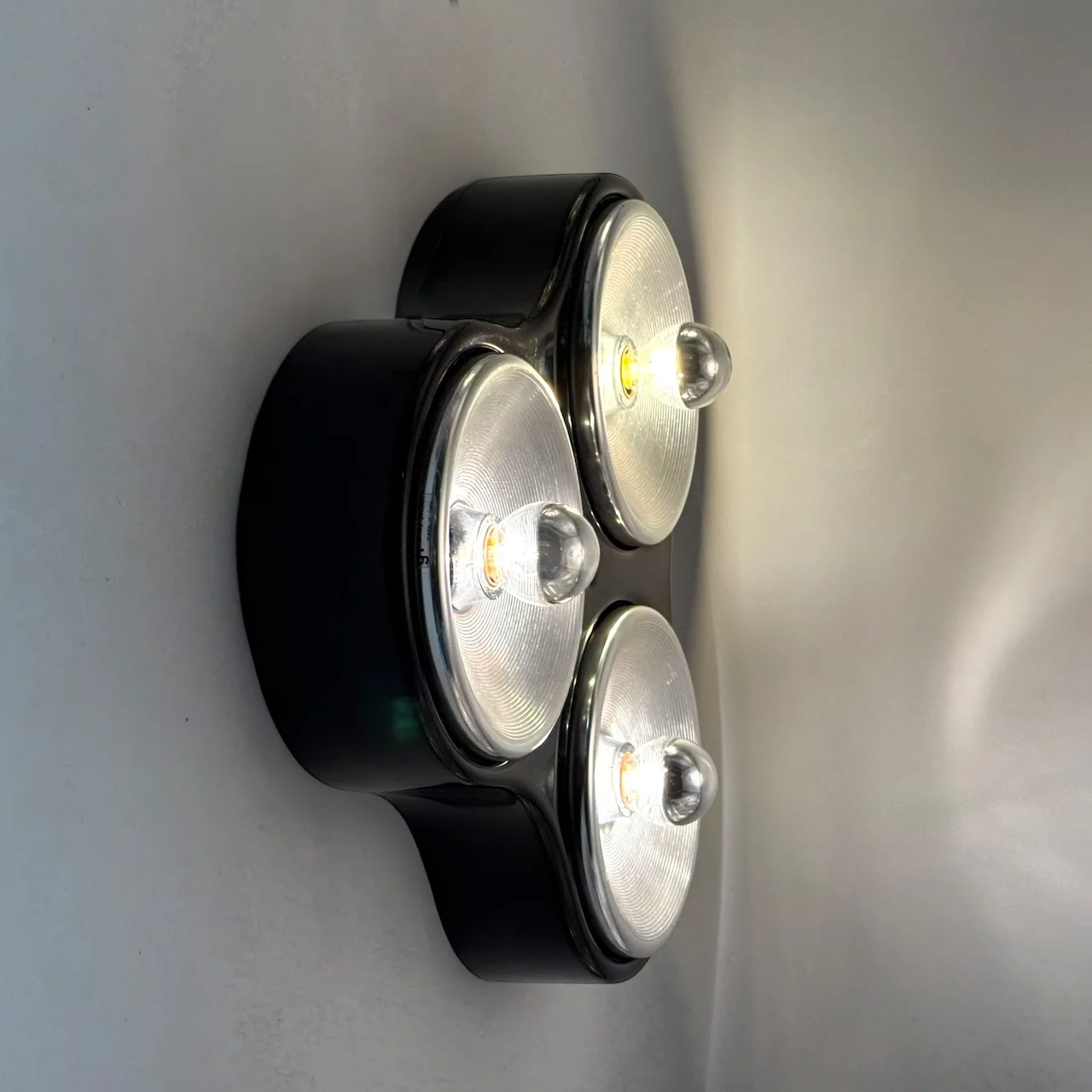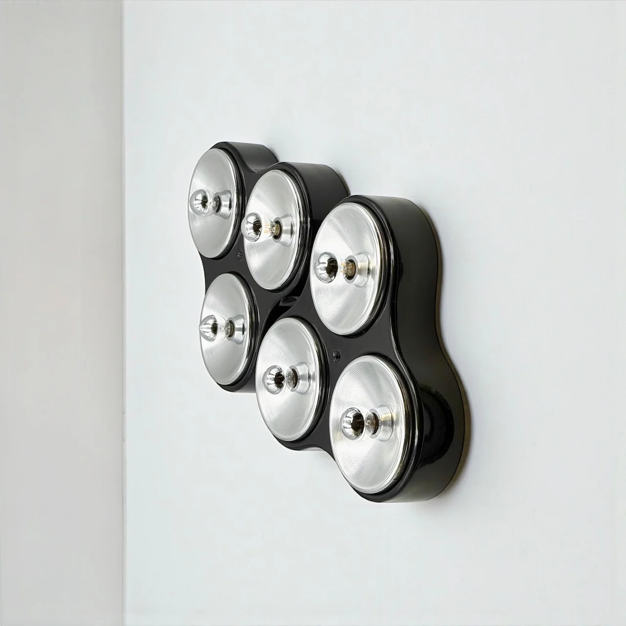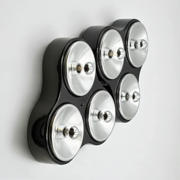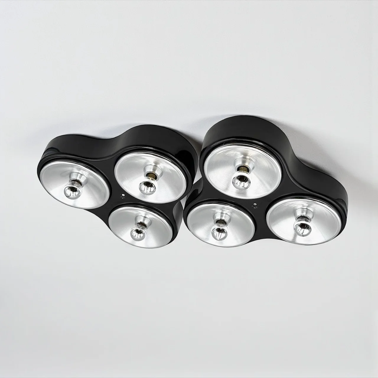 The shallow depth and symmetrical layout allow the lamps to integrate seamlessly into a wide range of interiors, from bold space age environments to contemporary settings where they function as sculptural accents. When illuminated, the chrome diffusers create a refined interplay of light and reflection, emphasizing rhythm and depth.