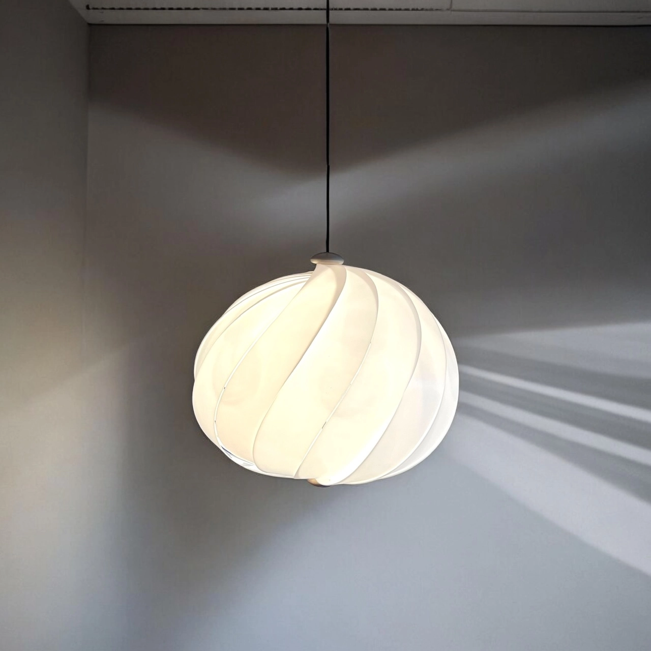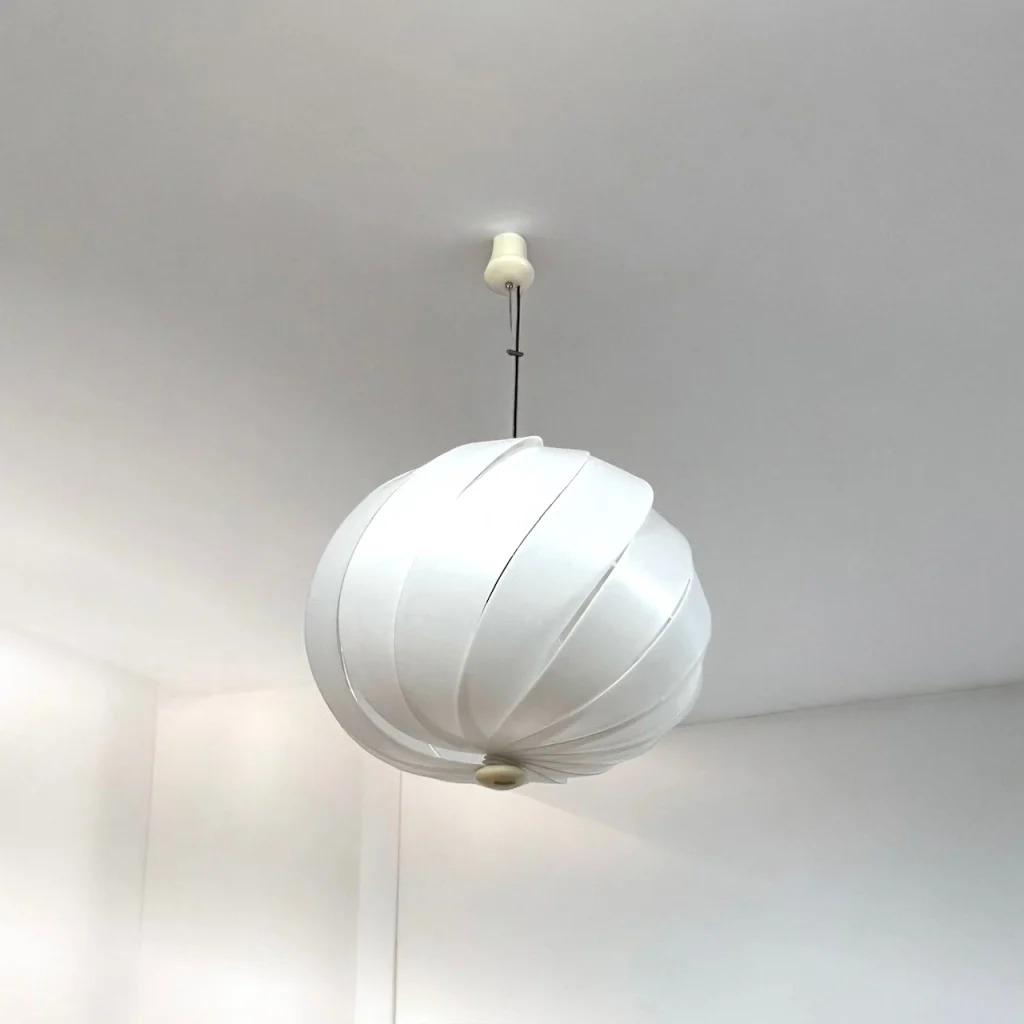 The Harvey Guzzini Alicante pendant lamp, designed by Emanuele Ponzio in the 1960s, is a breathtaking example of Space Age Italian lighting. Featuring a design based on 15 intersecting acrylic wings, this rare piece resembles a large, elegant shell, creating a truly spectacular visual effect. Produced from the 1960s to the early 1980s, the Alicante model is highly sought after, especially when, like this one, it retains all 15 wings and remains in excellent condition.