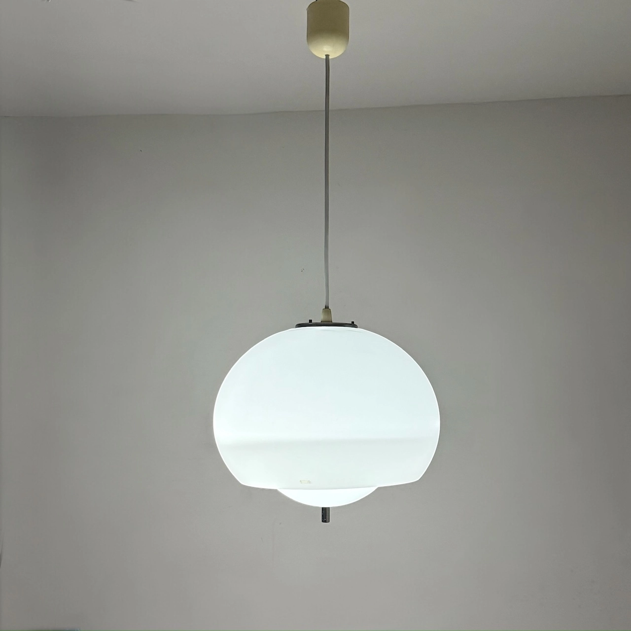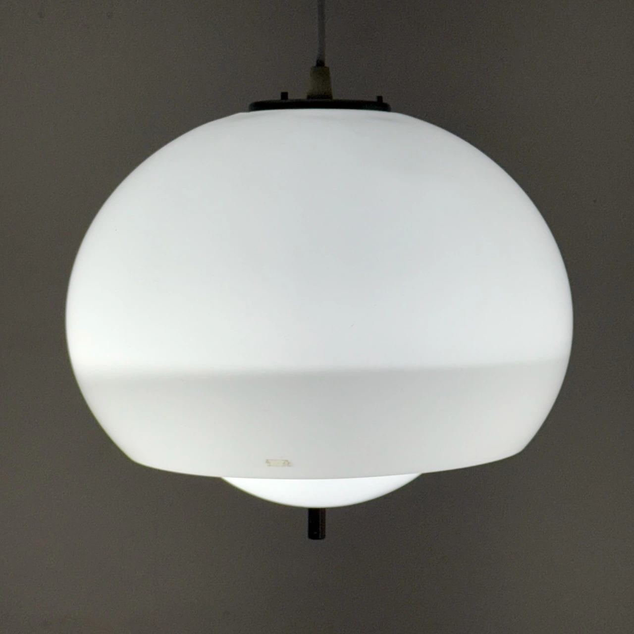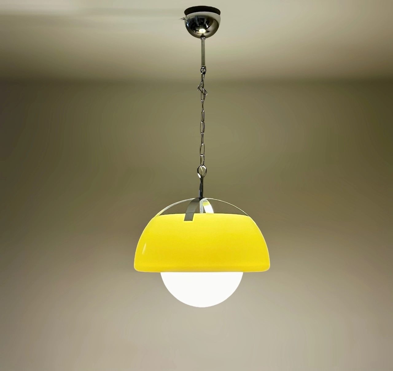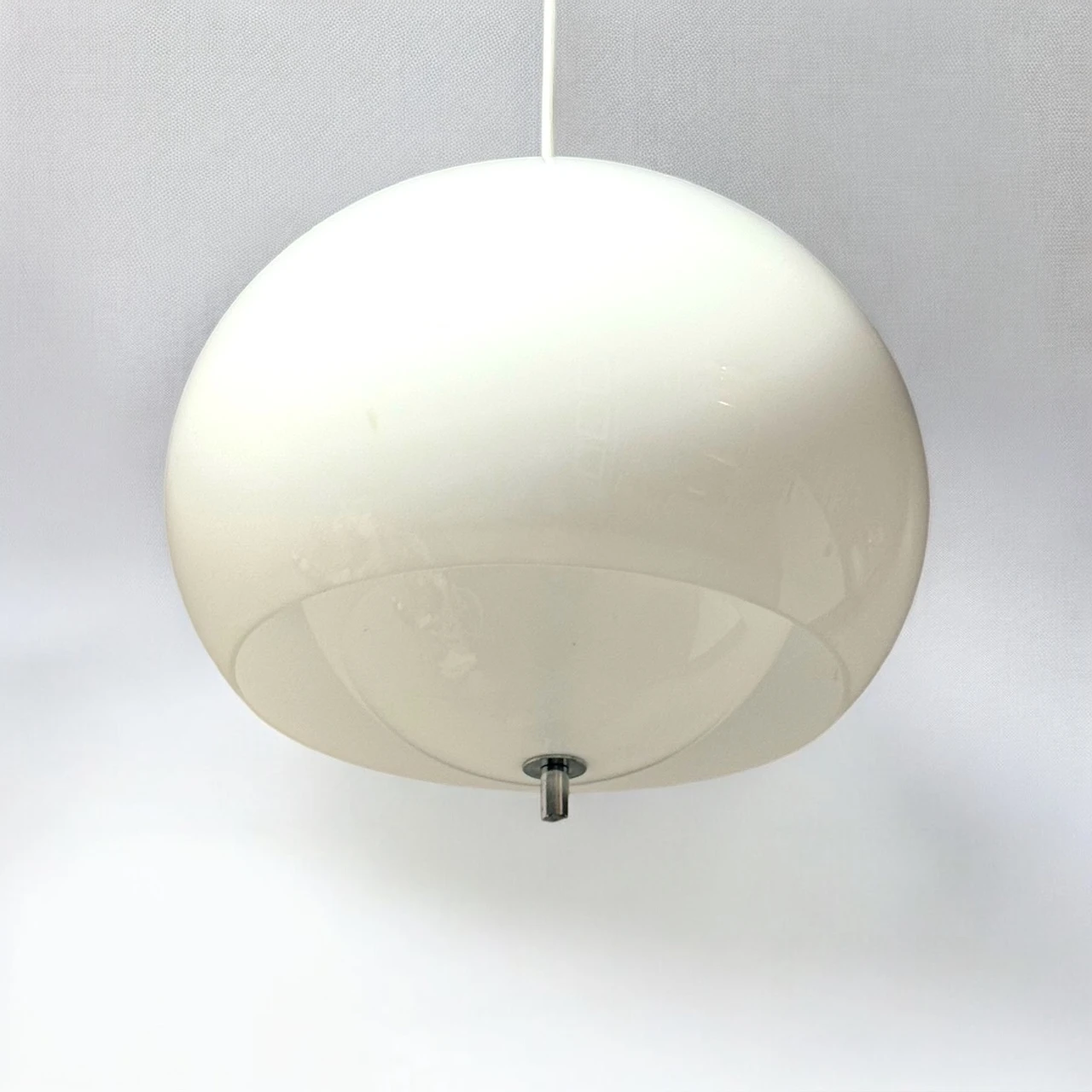 Elevate your interior with the Harvey Guzzini Burgos Space Age Lamp, a stunning vintage ceiling light from the late 60s to early 70s. Designed by the Harvey Guzzini design team and produced in Recanati, this lamp embodies the futuristic aesthetic of the Space Age era. It was also sold under the name Marika for Meblo, further cementing its status as an icon of retro lighting design.