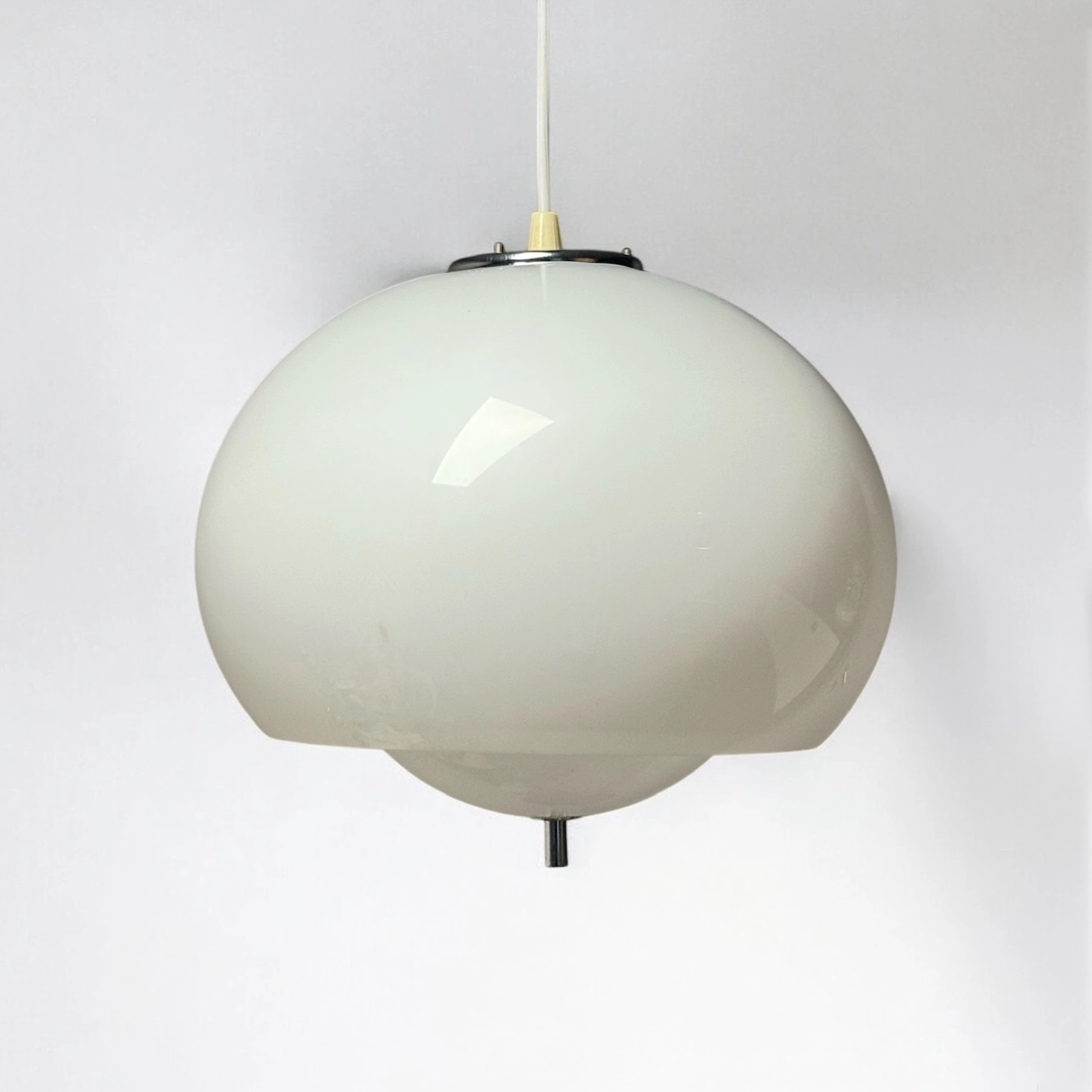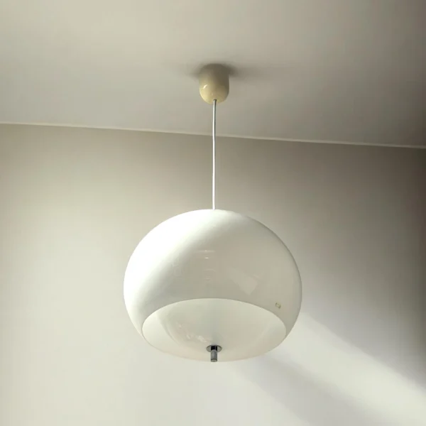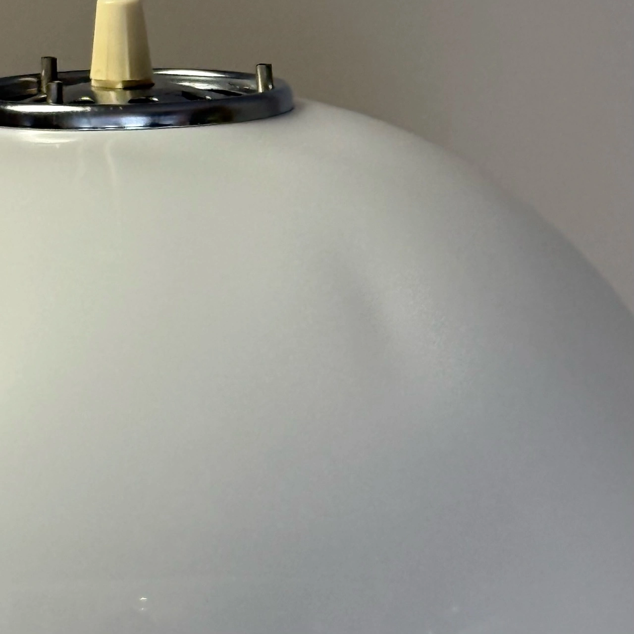 With its elegant white acrylic shade and chrome-plated metal details, the Burgos lamp exudes a soft, diffused glow, perfect for creating a warm and sophisticated atmosphere. Its spherical form, combined with a sleek, minimalistic structure, reflects the fascination with futuristic and organic shapes that defined the Space Age movement. The ornamental chrome nut beneath the shade adds a distinctive finishing touch.
