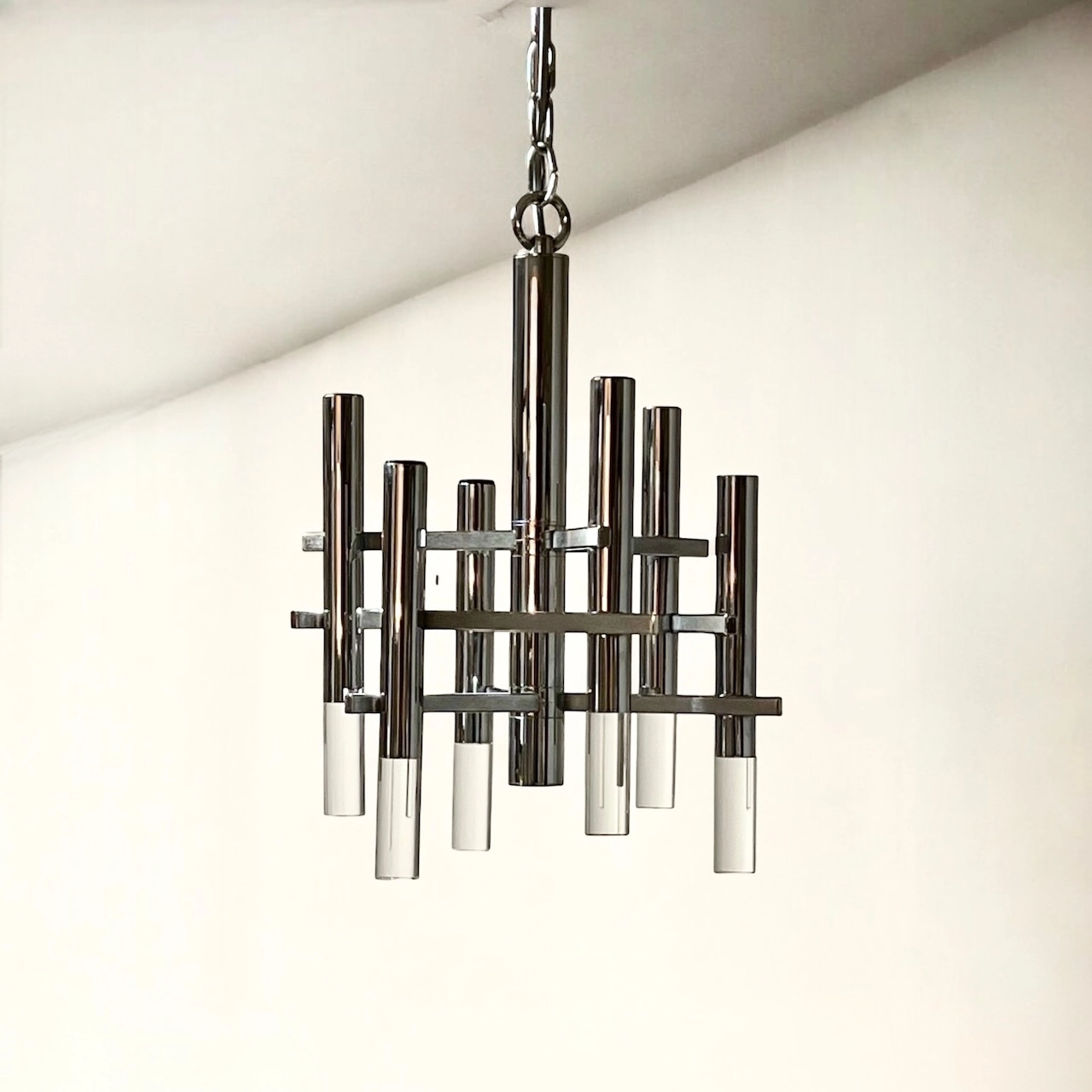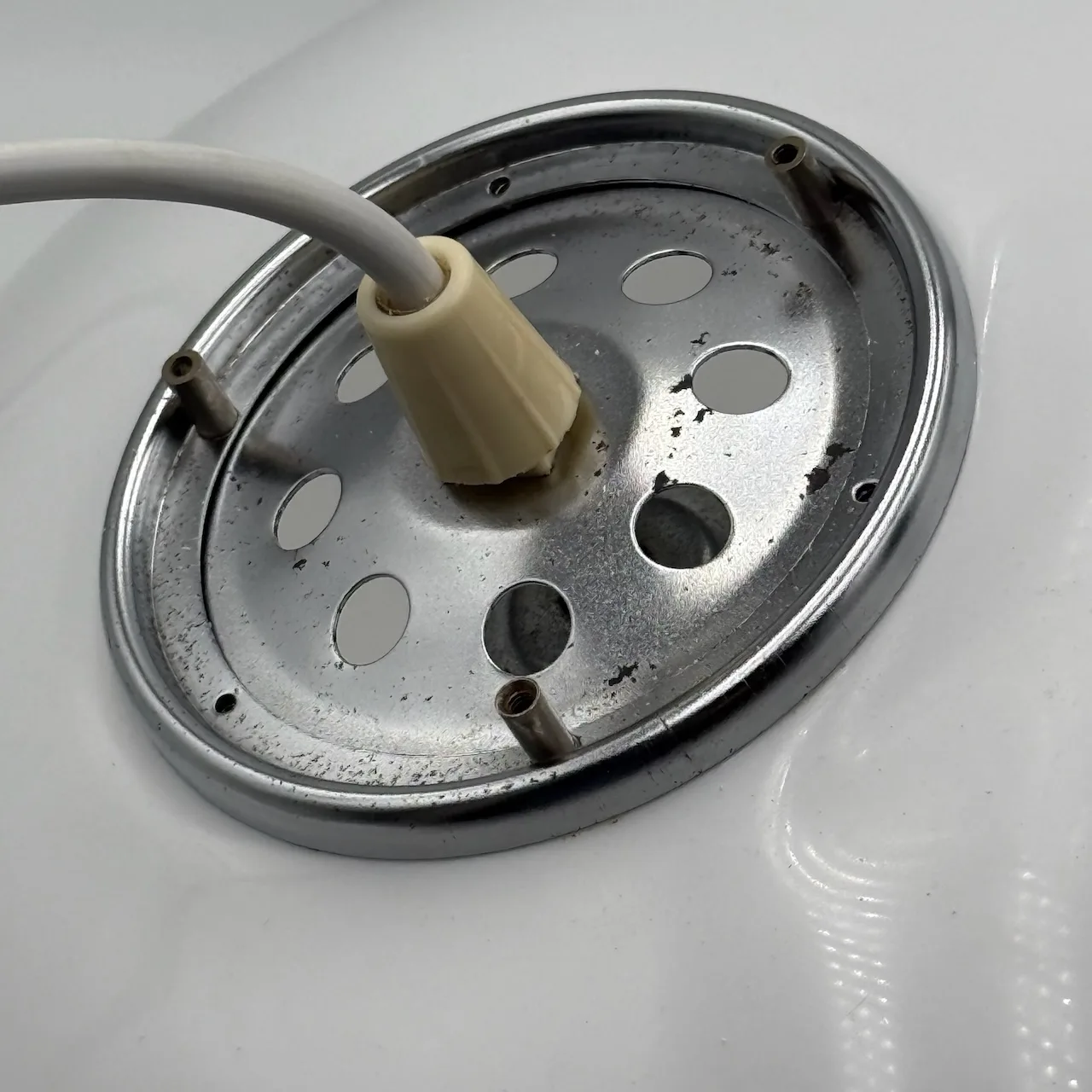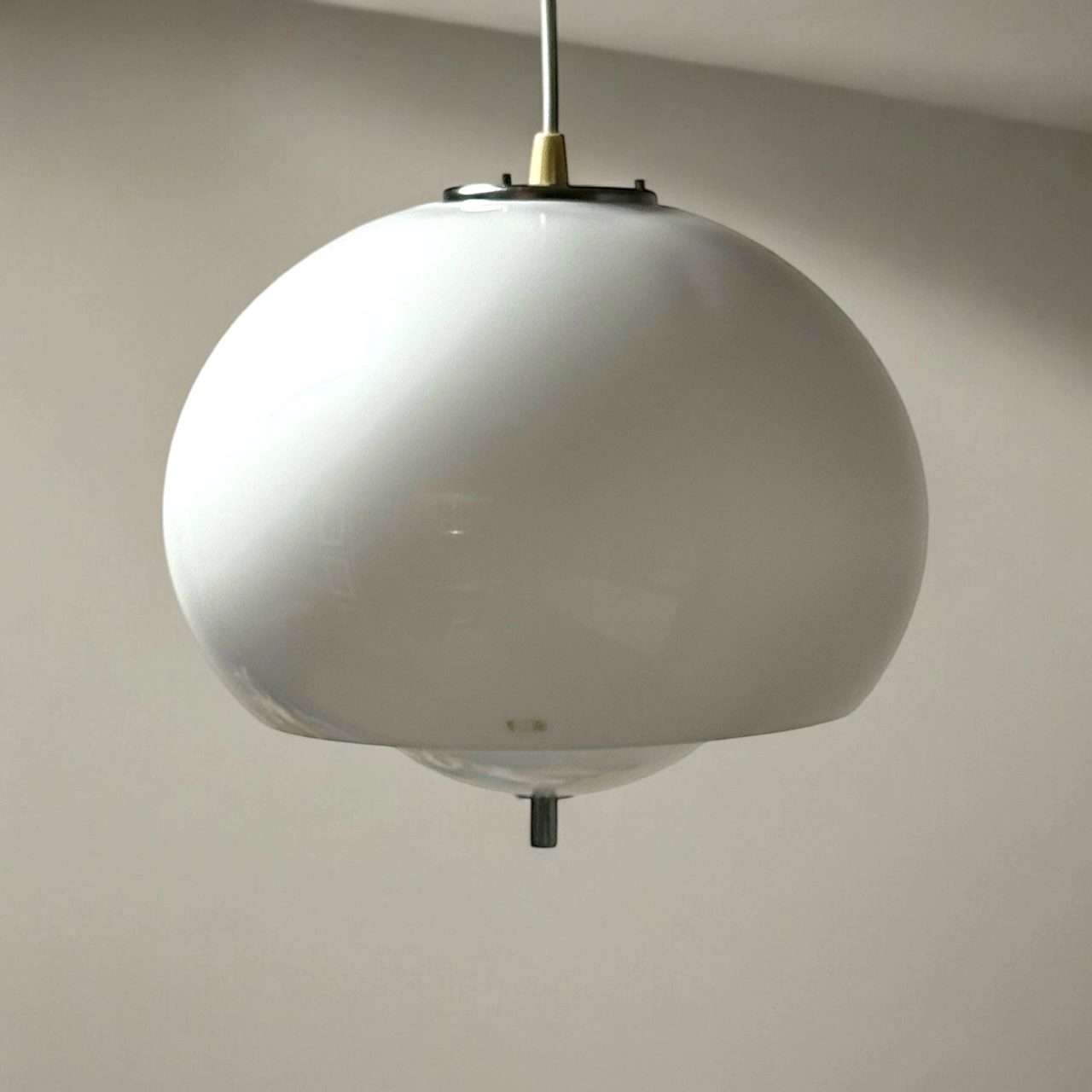 With its elegant white acrylic shade and chrome-plated metal details, the Burgos lamp exudes a soft, diffused glow, perfect for creating a warm and sophisticated atmosphere. Its spherical form, combined with a sleek, minimalistic structure, reflects the fascination with futuristic and organic shapes that defined the Space Age movement. The ornamental chrome nut beneath the shade adds a distinctive finishing touch.