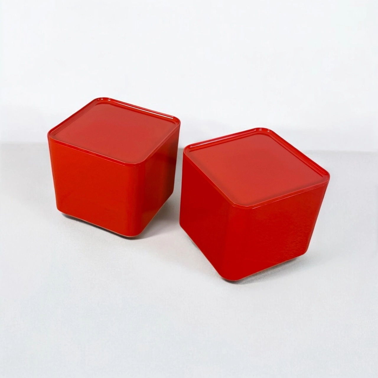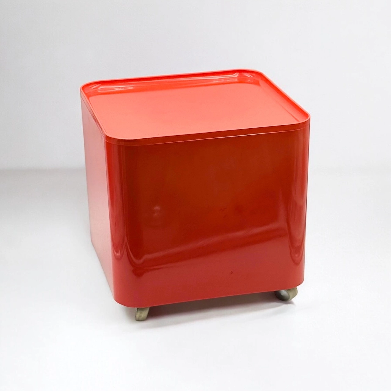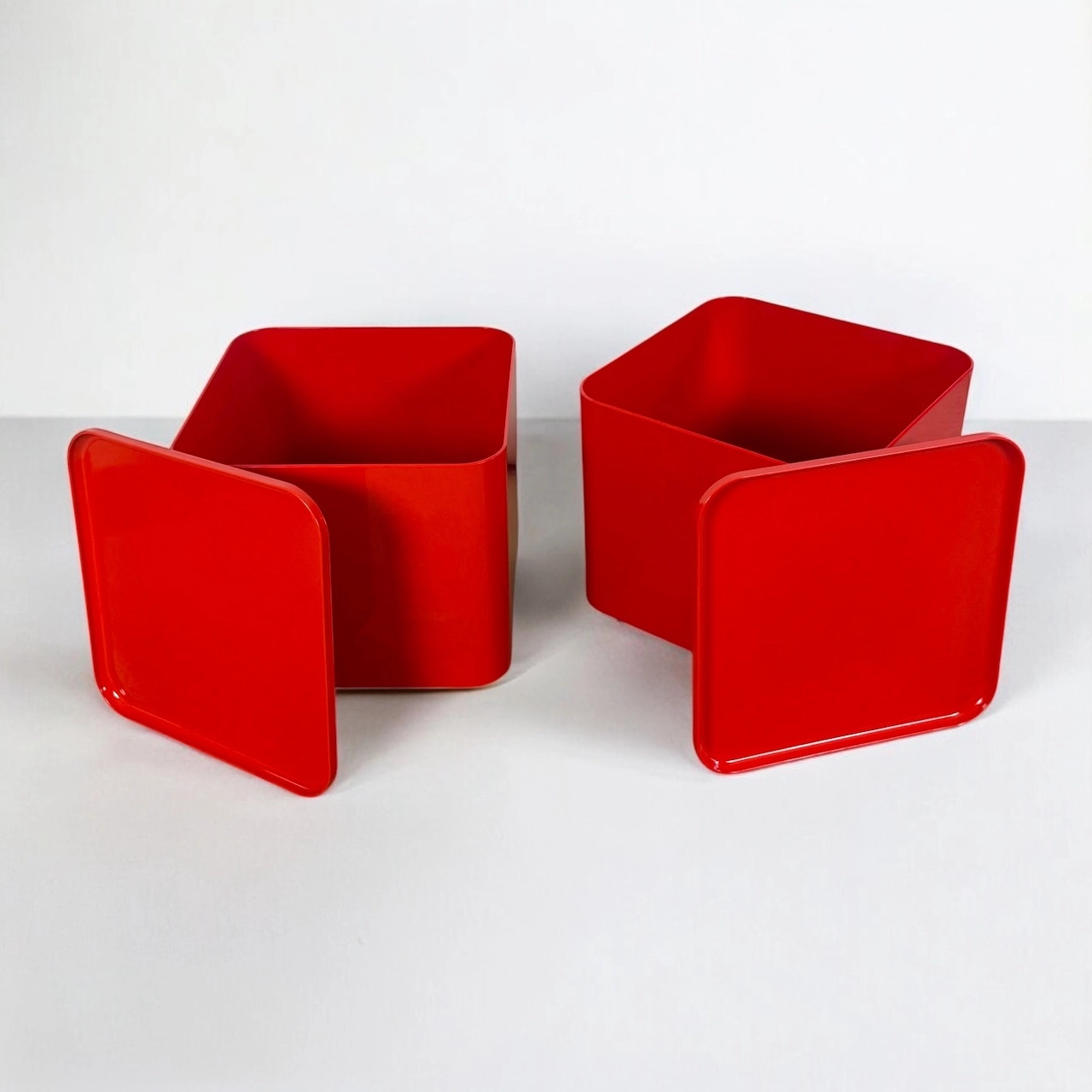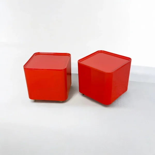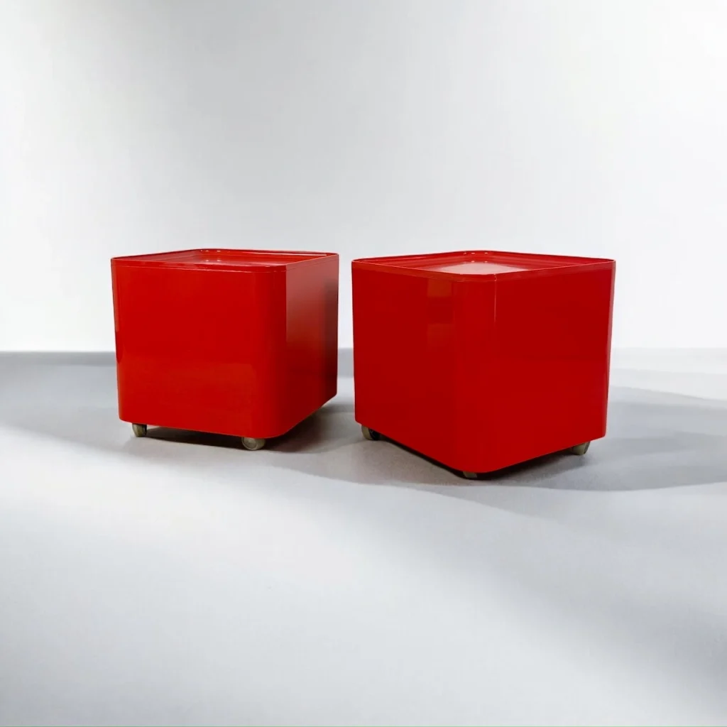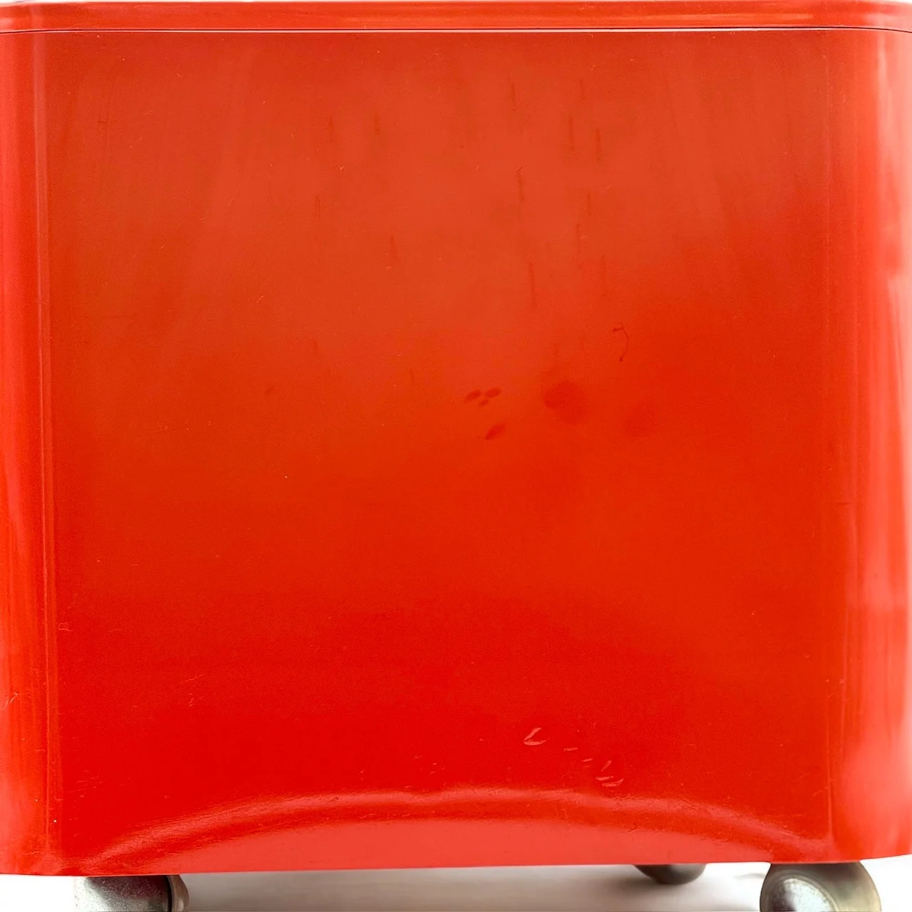 Amazing pair of Vintage 70s rolling table by Marcello Siard for Longato. Bold red plastic, sleek design, and built-in storage – an iconic Space Age Furniture Design piece offering both practicality and retro charm.