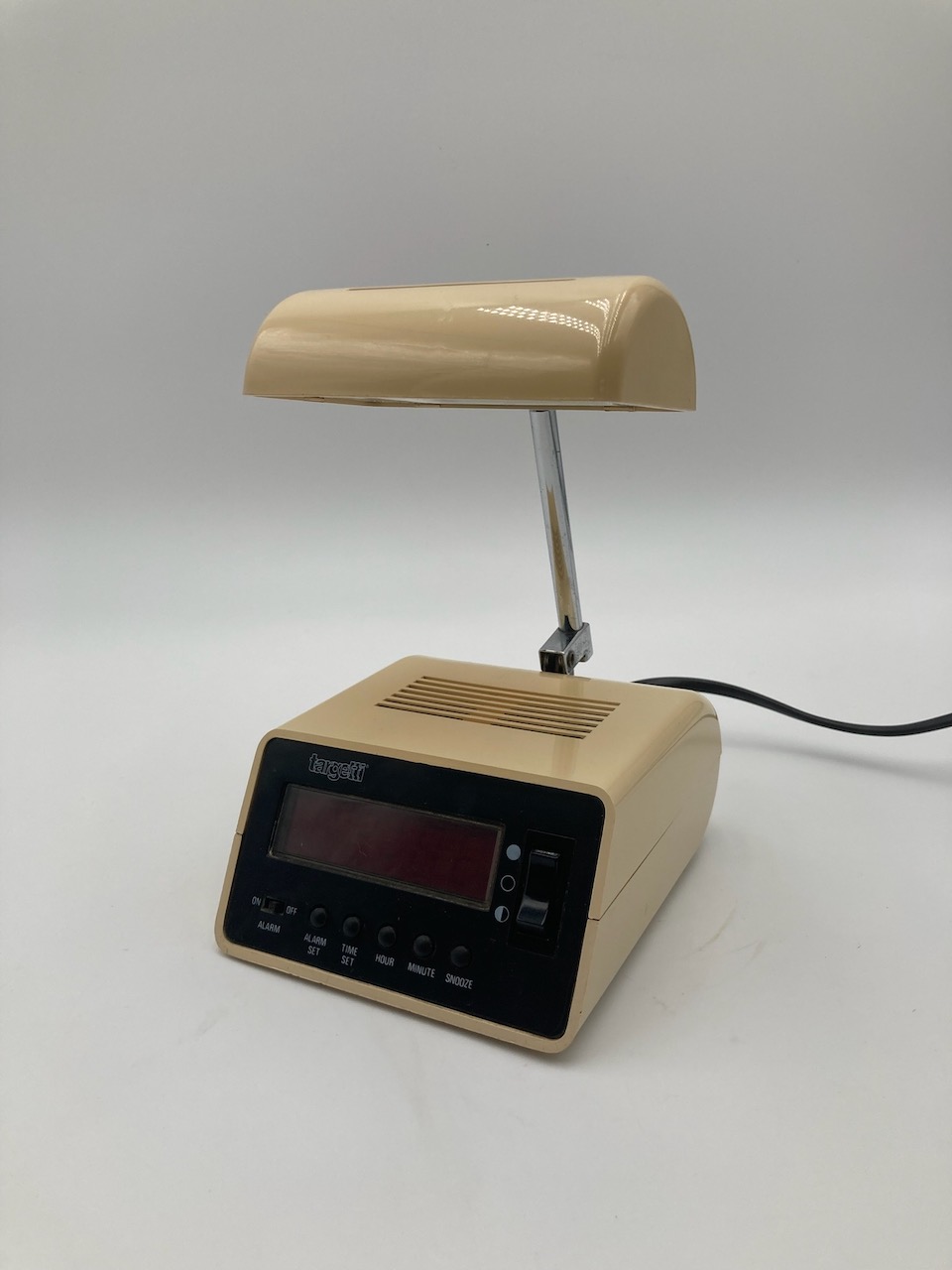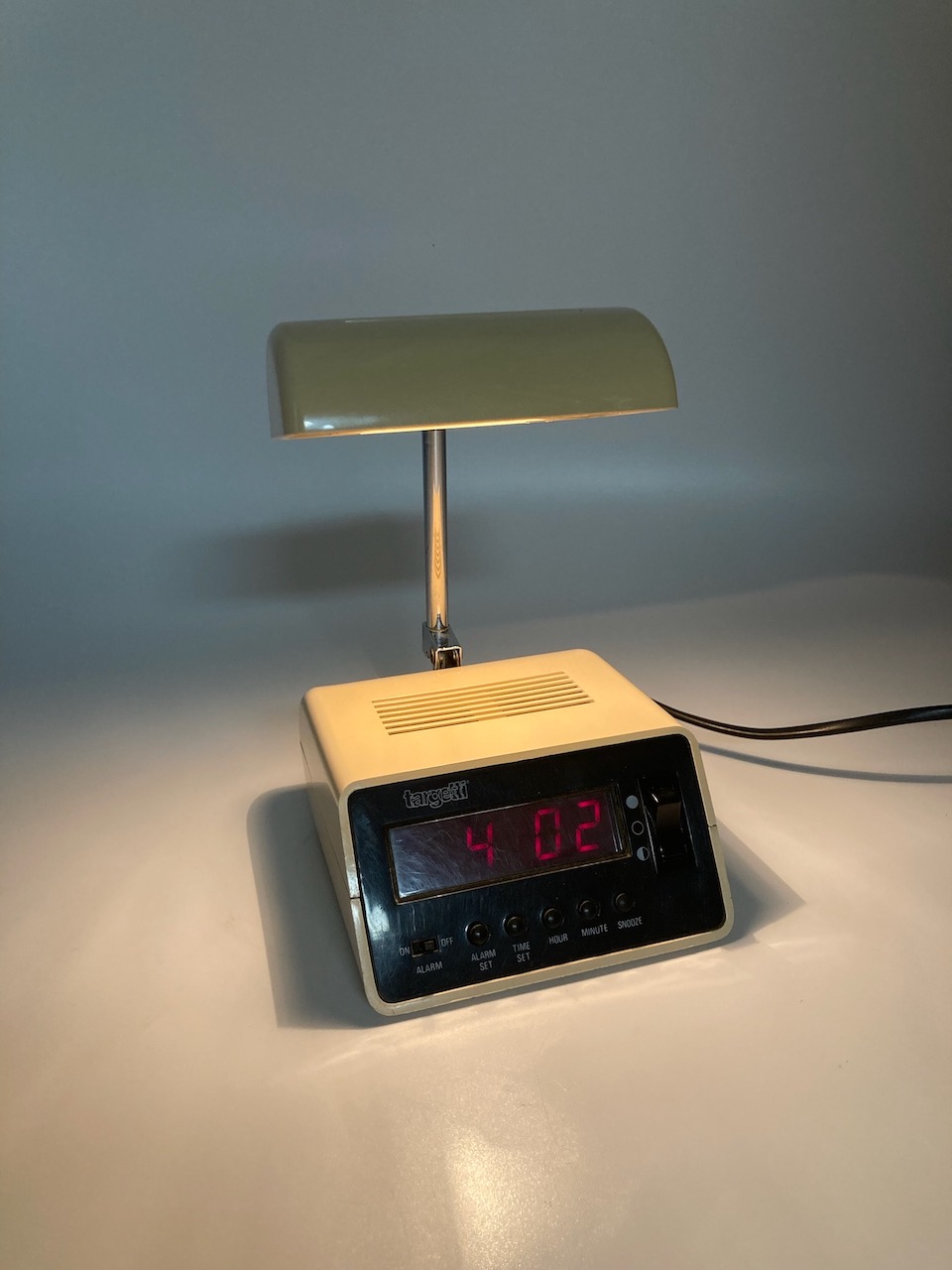 Iconic portable desk lamp with alarm clock produced by Targetti Sankey in the 70s. An ingenious design that combines the functionality of a digital alarm clock, with a nice two-tone light.