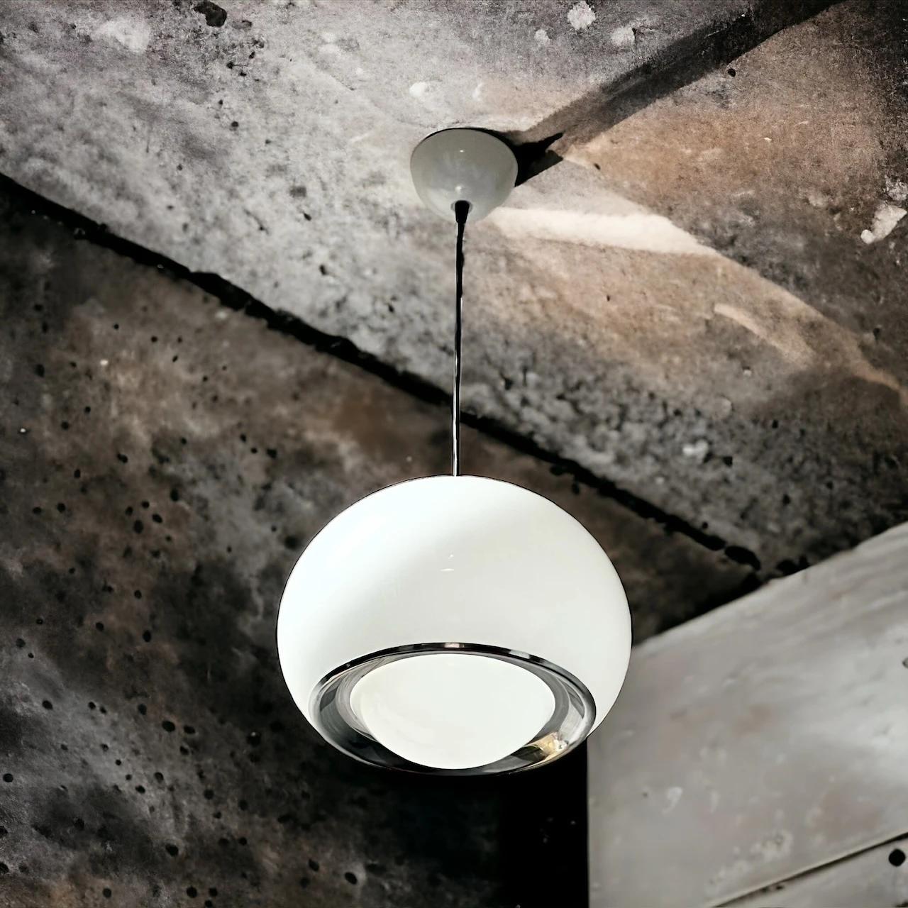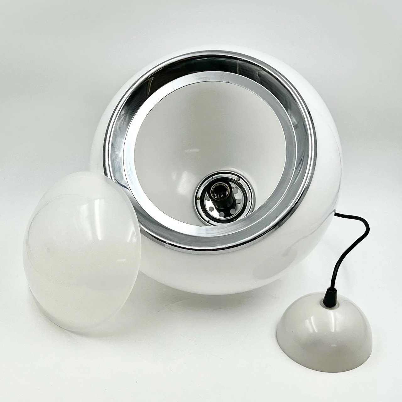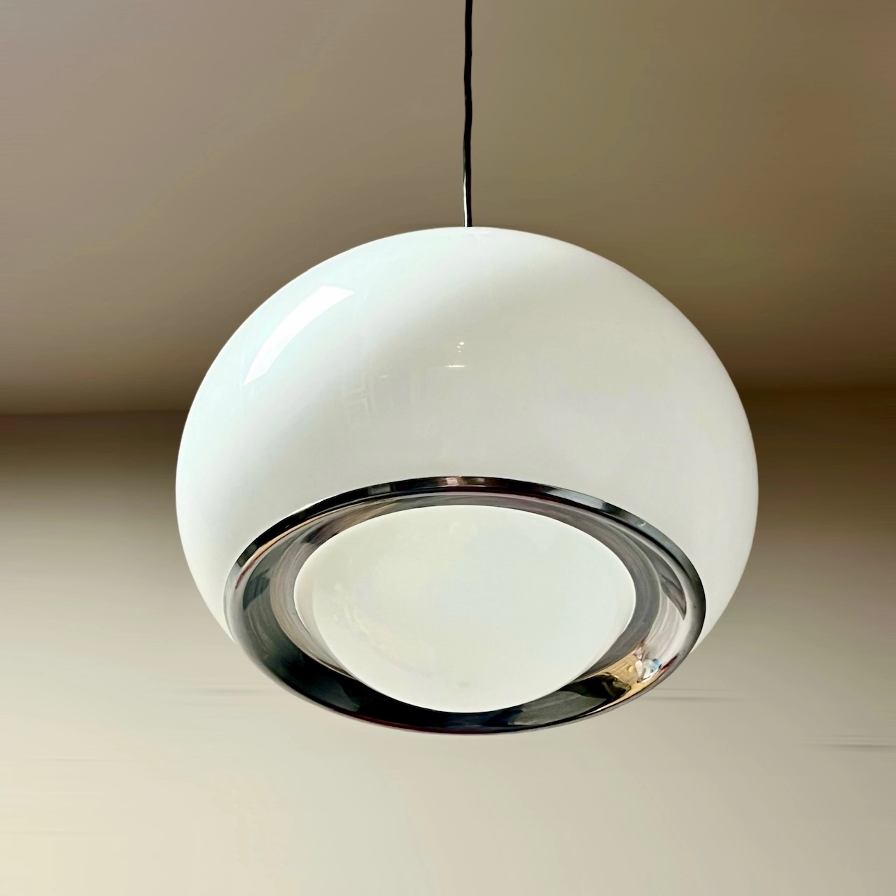item. hanging lampdesigner. Studio 6G – Harvey Guzzinis internal design teammaker. Harvey Guzzinimodel. BUD 3029period. 1960s/70scountry. Italymaterial. white pearl acrylic globe, chrome lamp socket holder, chromed metal ring, white acrylic diffusercolor. white, chromed silverdimensions (cm). 35 x 35 x 31. cord length: 130 cm.condition. excellent vintage condition with slight, almost imperceptible oxidation on the lower ring.art. no. 1479