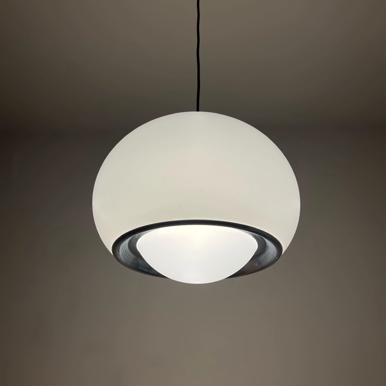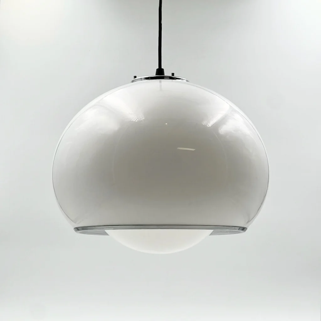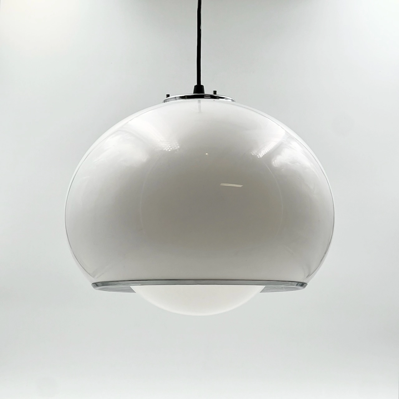 item. hanging lampdesigner. Studio 6G – Harvey Guzzinis internal design teammaker. Harvey Guzzinimodel. BUD 3029period. 1960s/70scountry. Italymaterial. white pearl acrylic globe, chrome lamp socket holder, chromed metal ring, white acrylic diffusercolor. white, chromed silverdimensions (cm). 35 x 35 x 31. cord length: 130 cm.condition. excellent vintage condition with slight, almost imperceptible oxidation on the lower ring.art. no. 1479