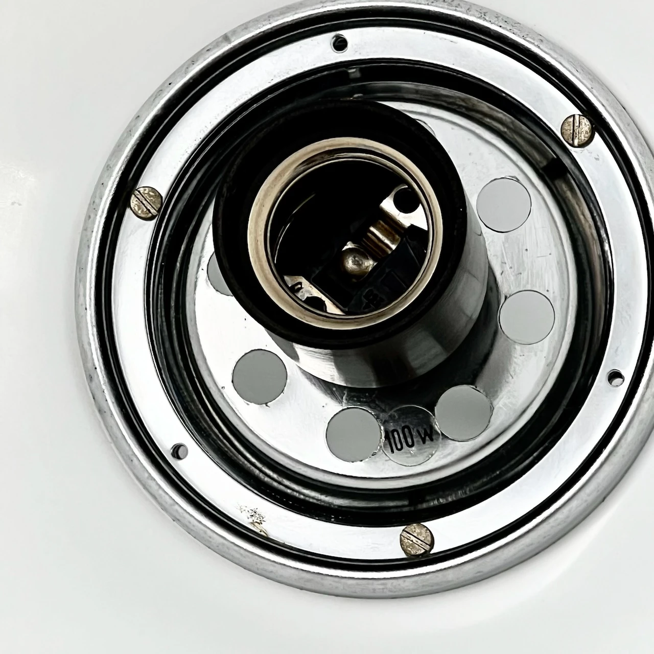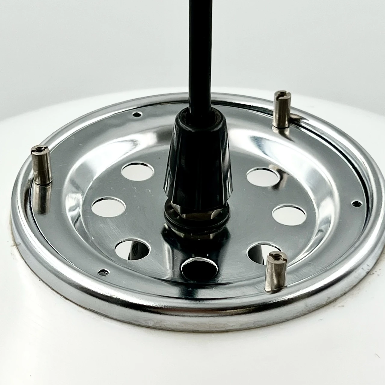 Supporting the globe is a chic chrome lamp socket holder and a chromed metal ring, elements that add a touch of modern sophistication while reflecting the eras fascination with shiny, reflective surfaces. The lower portion of the lamp features a white acrylic half-round diffuser that subtly directs the light downwards, ensuring a well-distributed, warm illumination.