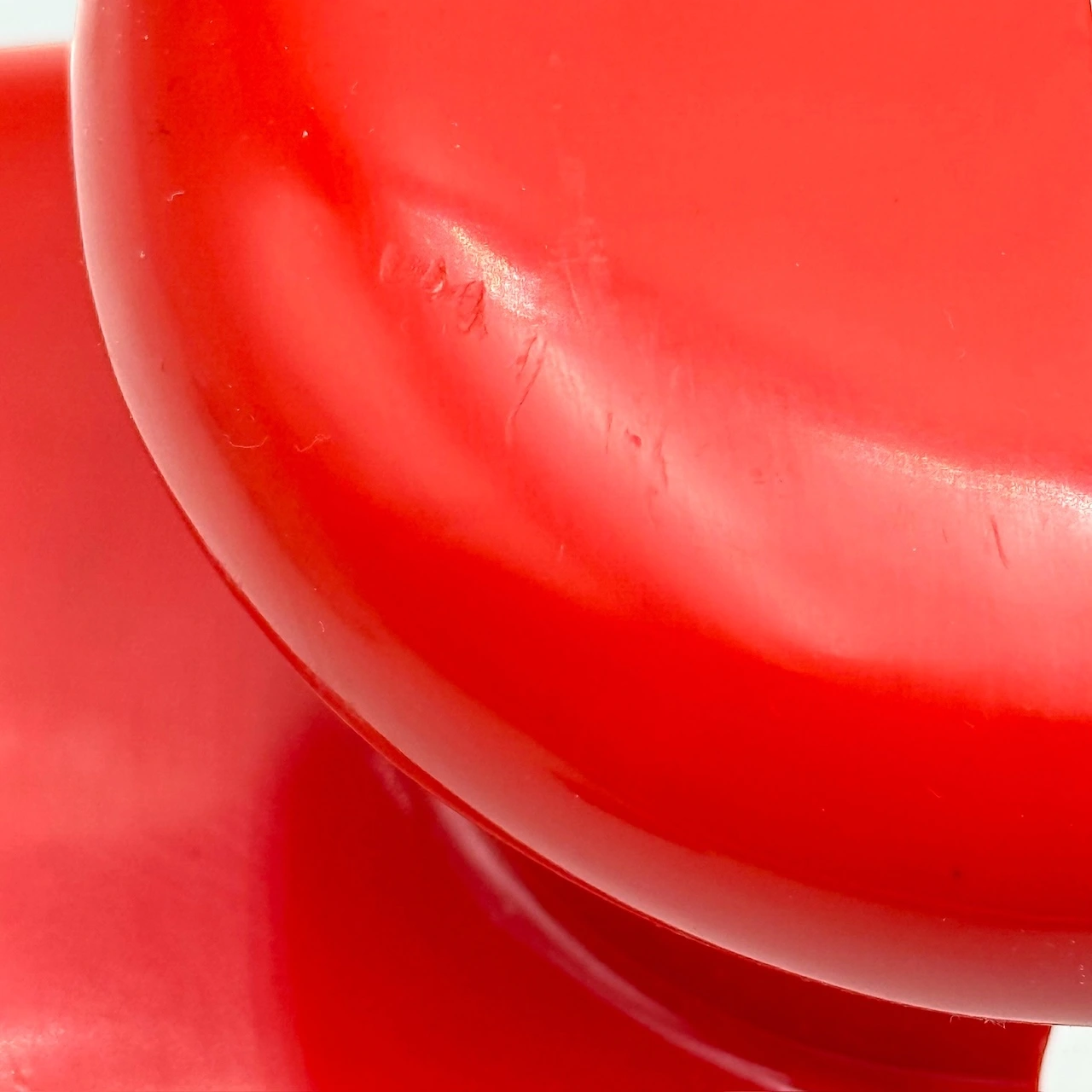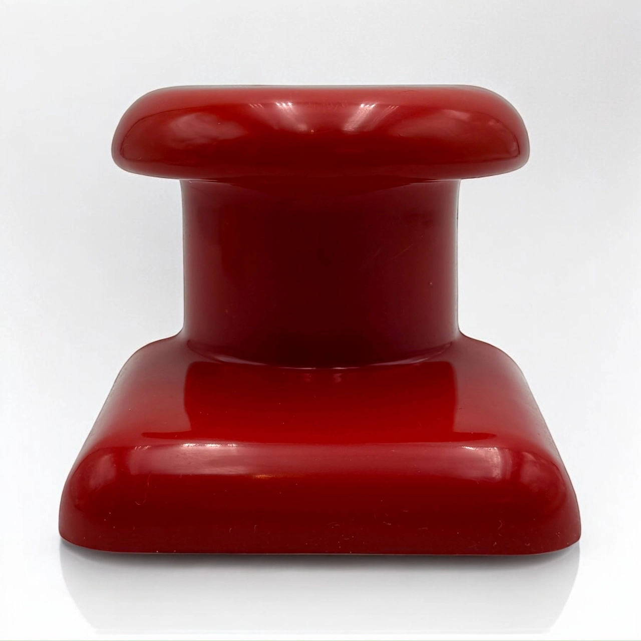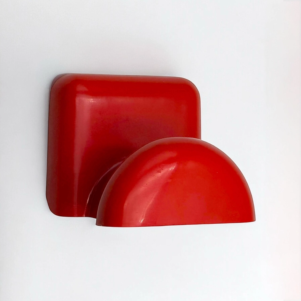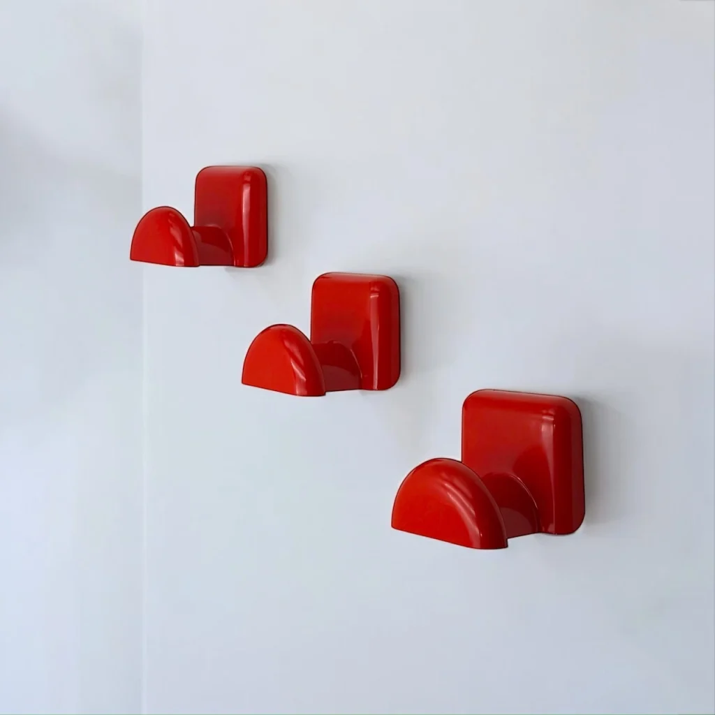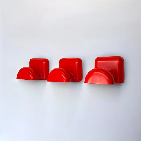 Crafted in the 1980s, these hooks are made of solid red polycarbonate—durable, glossy, and unmistakably bold. With their sculptural, semi-circular form and vibrant colour, they embody the functional yet expressive spirit of Italian design from that era.