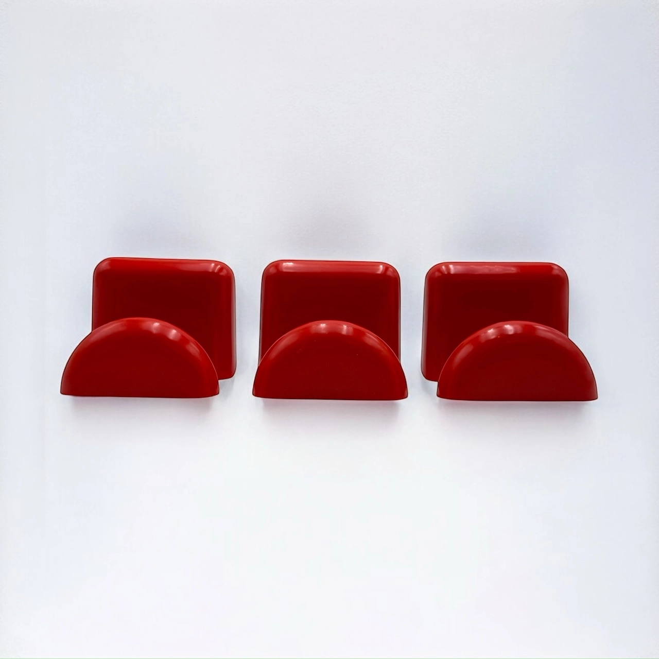 Vintage set of 3 red Italian design wall hooks by Bilumen. Bold 1980s industrial look in solid polycarbonate styled by Castigioni Gaviraghi & Lanza. Stylish, rare, and functional.