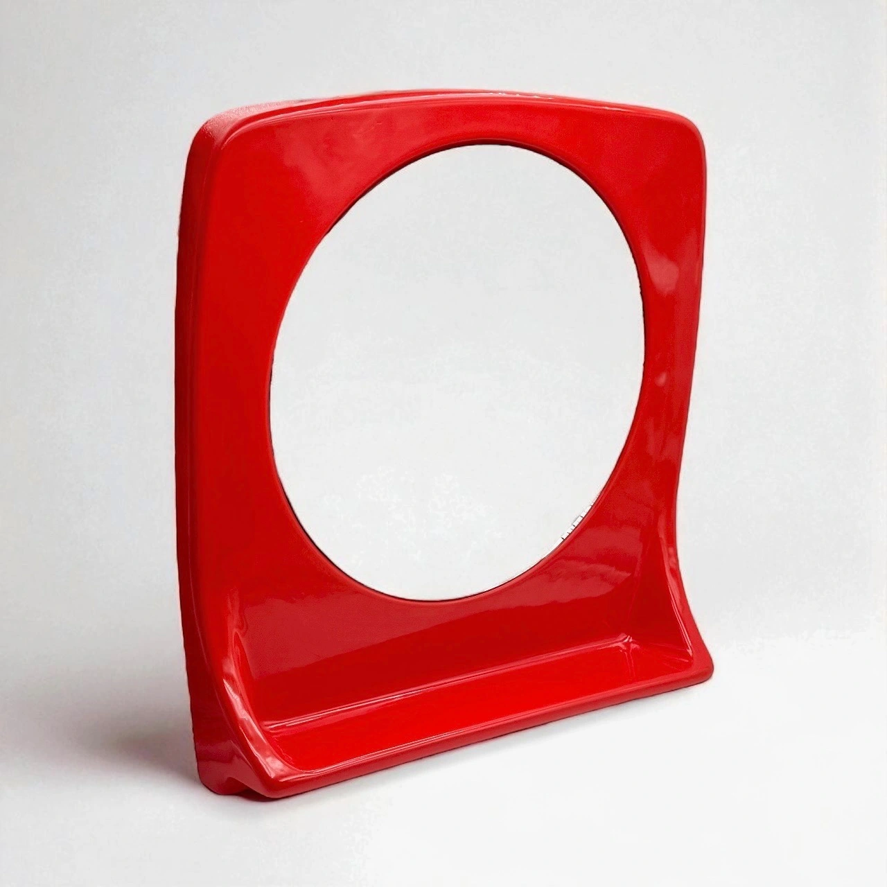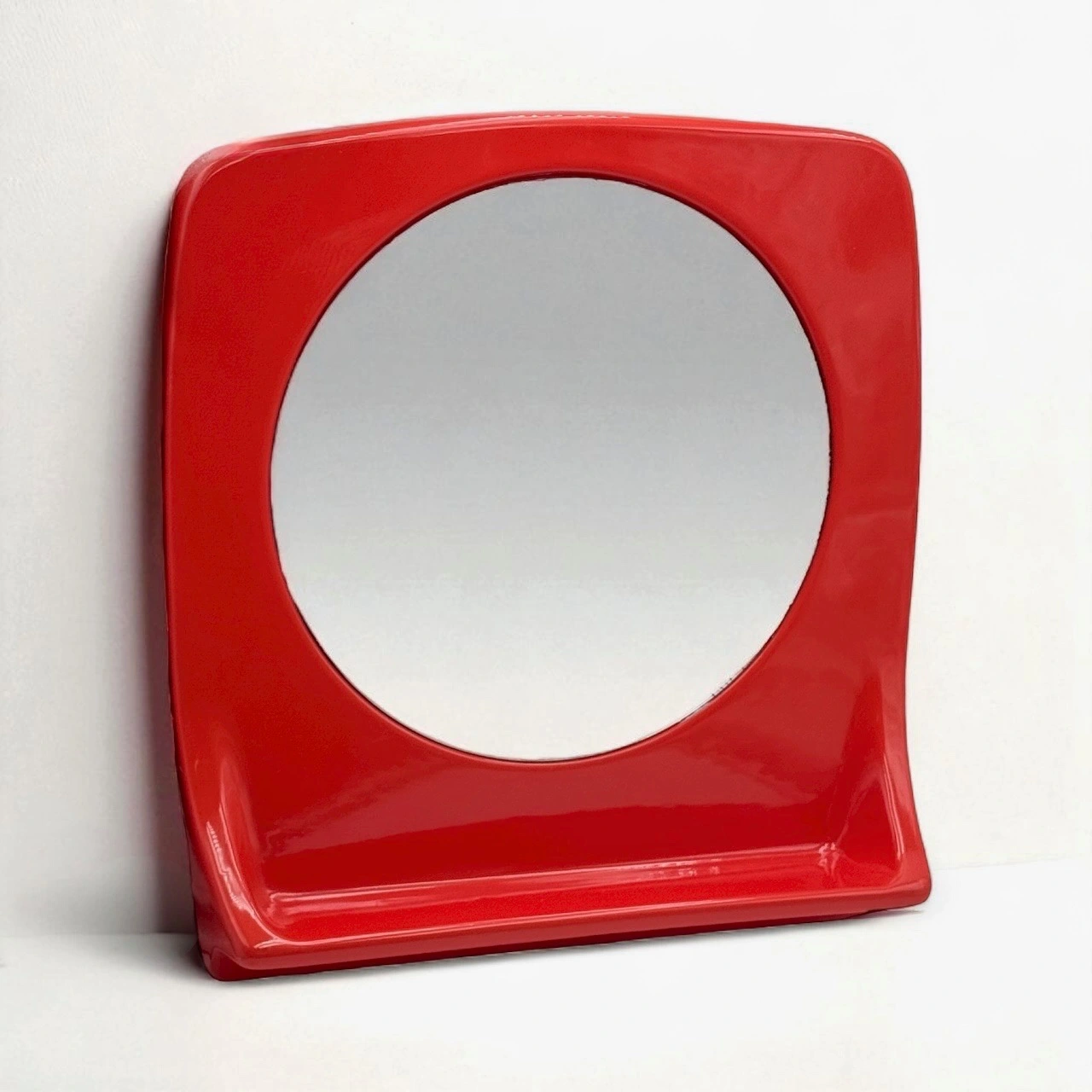 Authentic Italian Space Age mirror from the 1970s in bold red plastic. Featuring an integrated shelf and sculptural geometric form, this large wall mirror embodies the playful optimism of vintage Italian design.