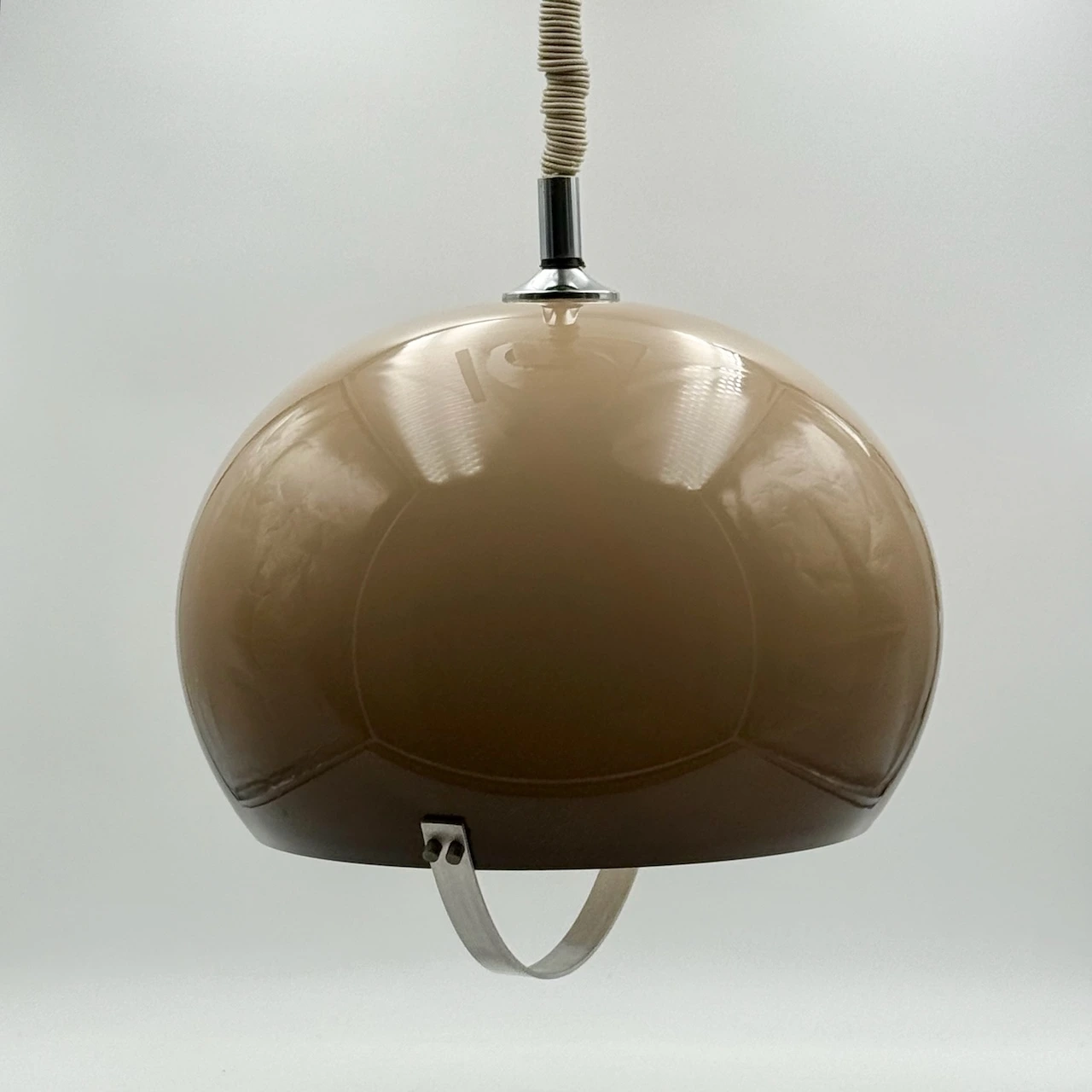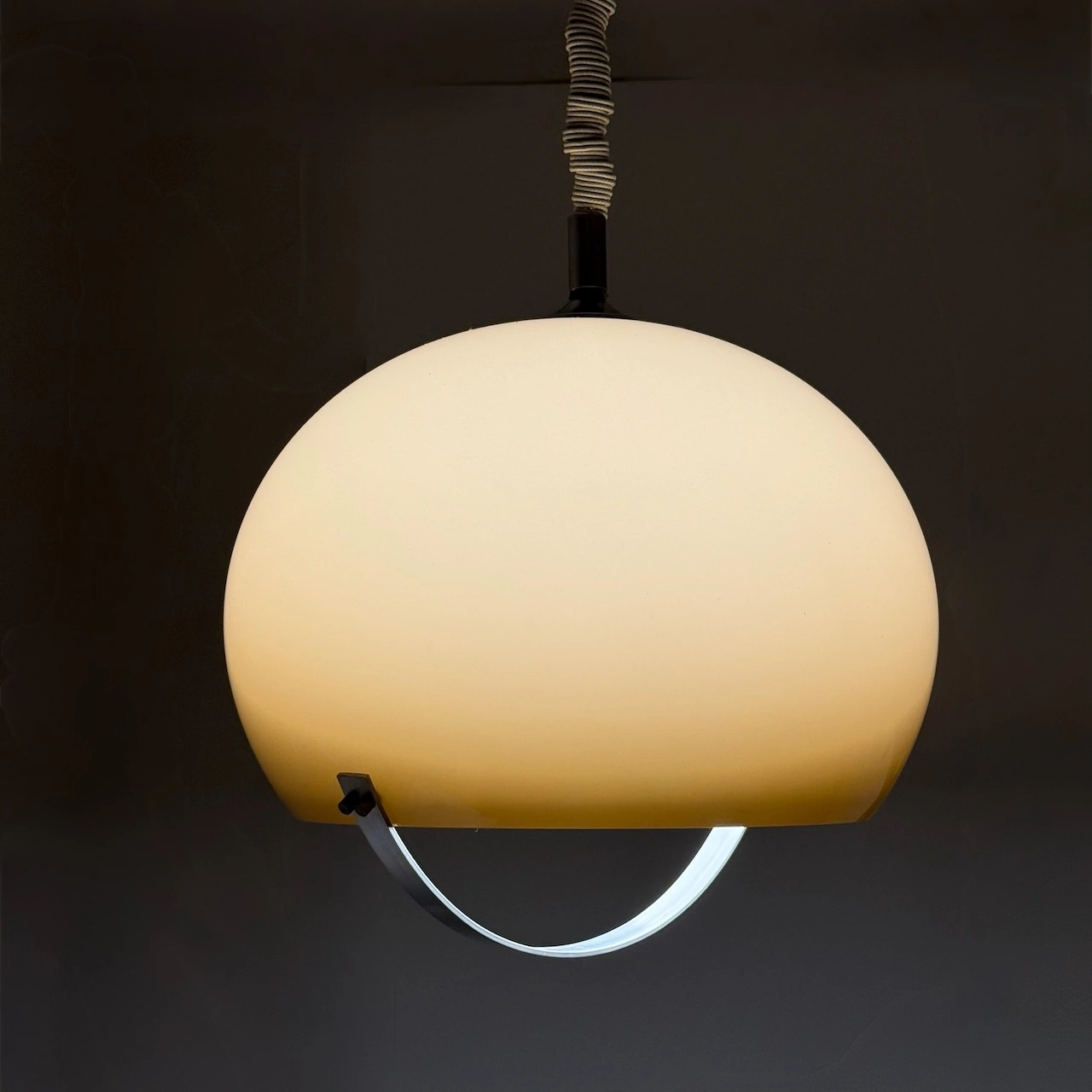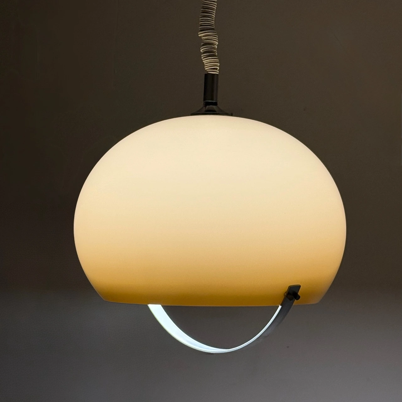 With its generous proportions (35 cm high, 37 cm diameter), this italian space age pendant immediately becomes a focal point. The curved steel handle accentuates the open lower section, giving the lamp its distinctive Space Age look. The ceiling cup shows some wear but can be replaced if desired. The pendant works with a standard E27 bulb and is in excellent vintage condition overall, with light surface marks compatible with its age.