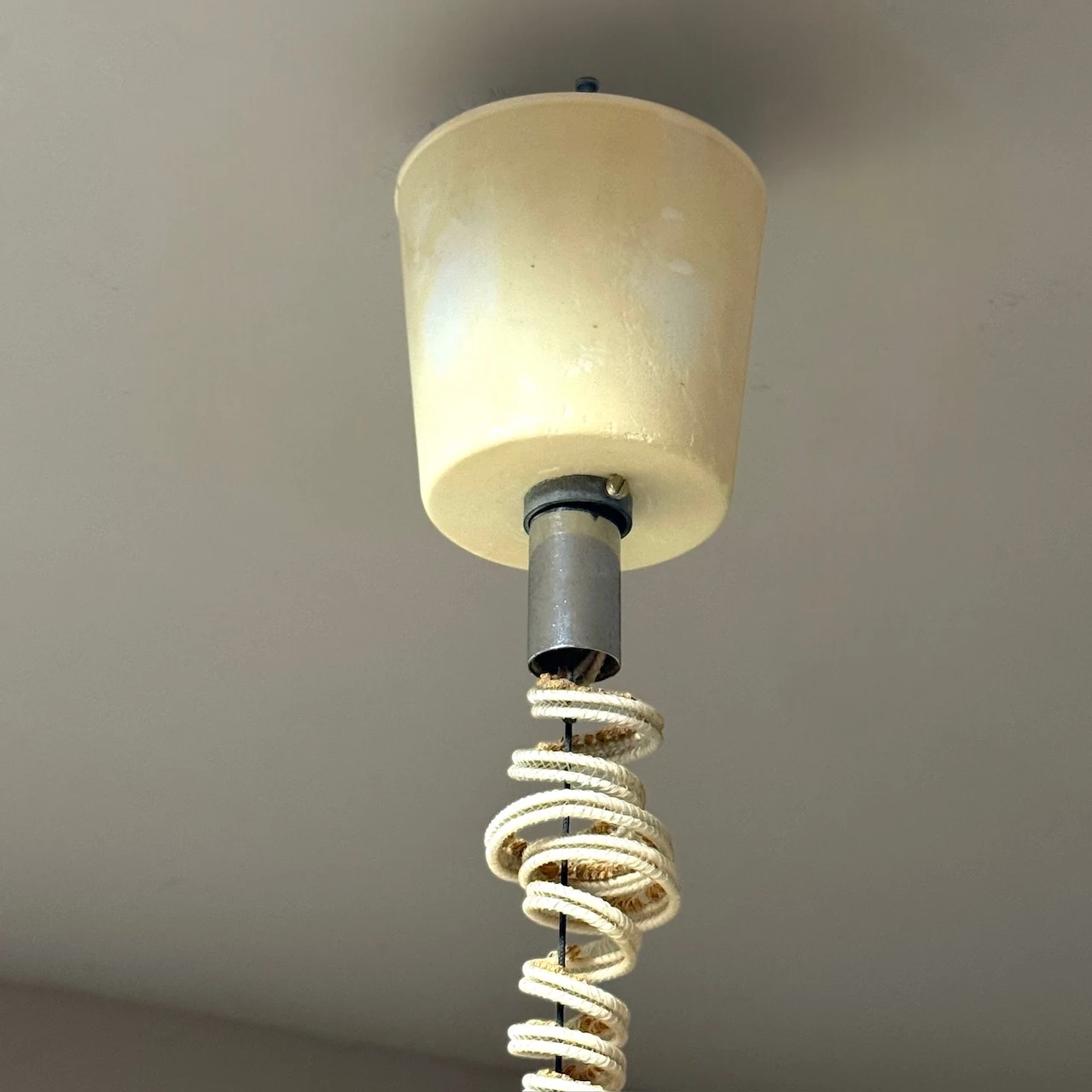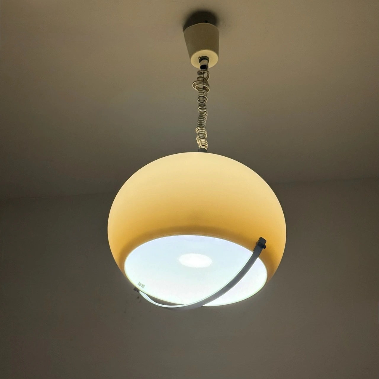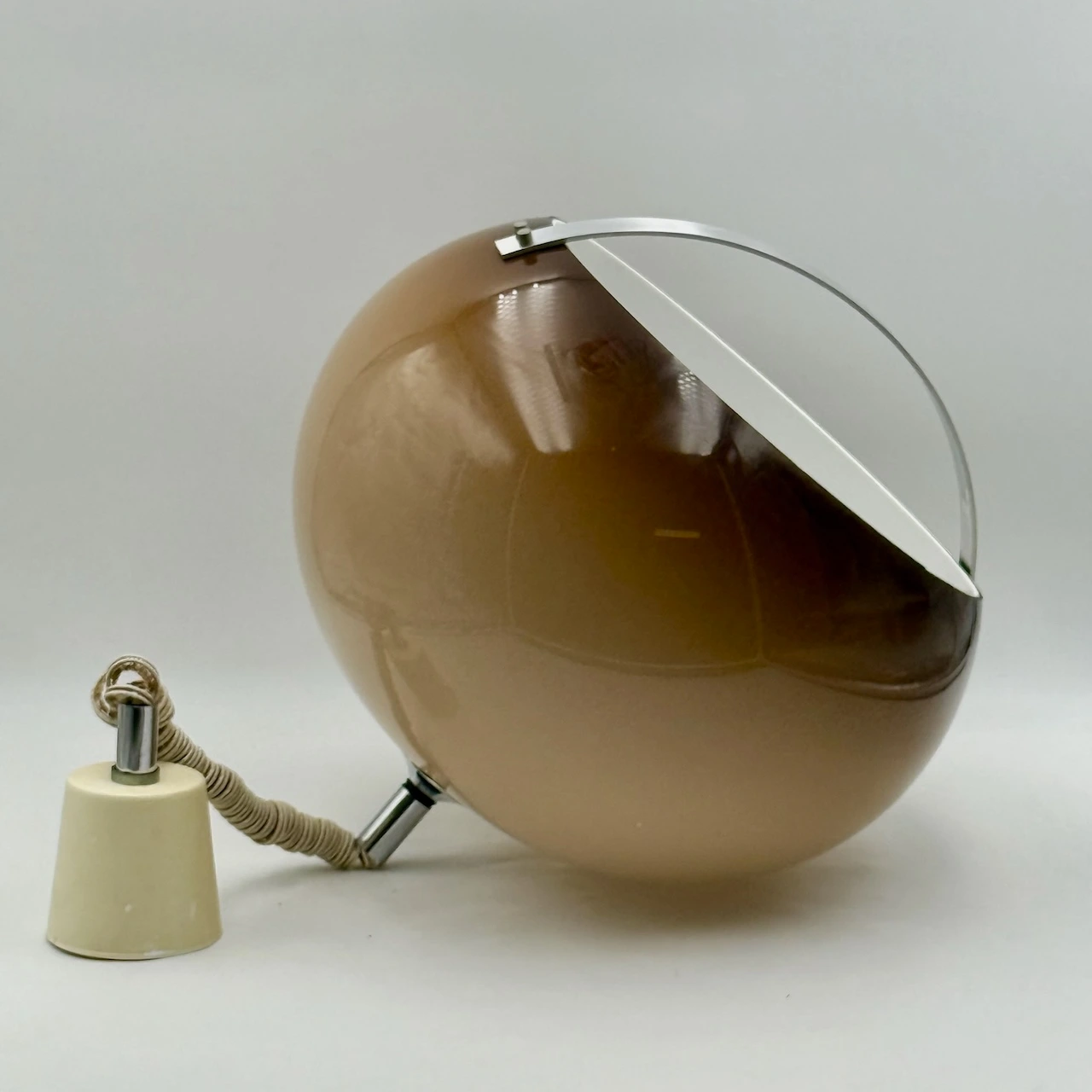 With its generous proportions (35 cm high, 37 cm diameter), this italian space age pendant immediately becomes a focal point. The curved steel handle accentuates the open lower section, giving the lamp its distinctive Space Age look. The ceiling cup shows some wear but can be replaced if desired. The pendant works with a standard E27 bulb and is in excellent vintage condition overall, with light surface marks compatible with its age.