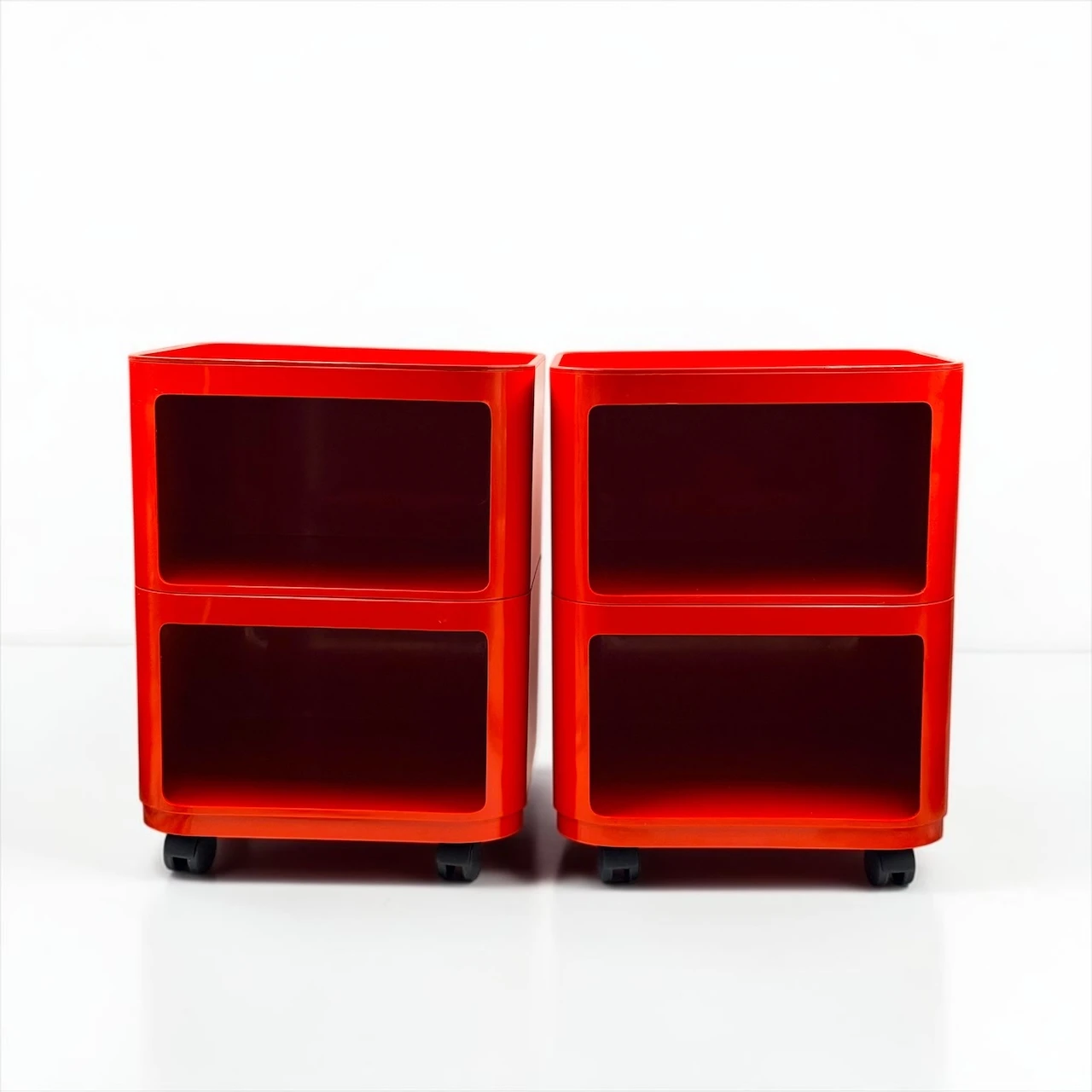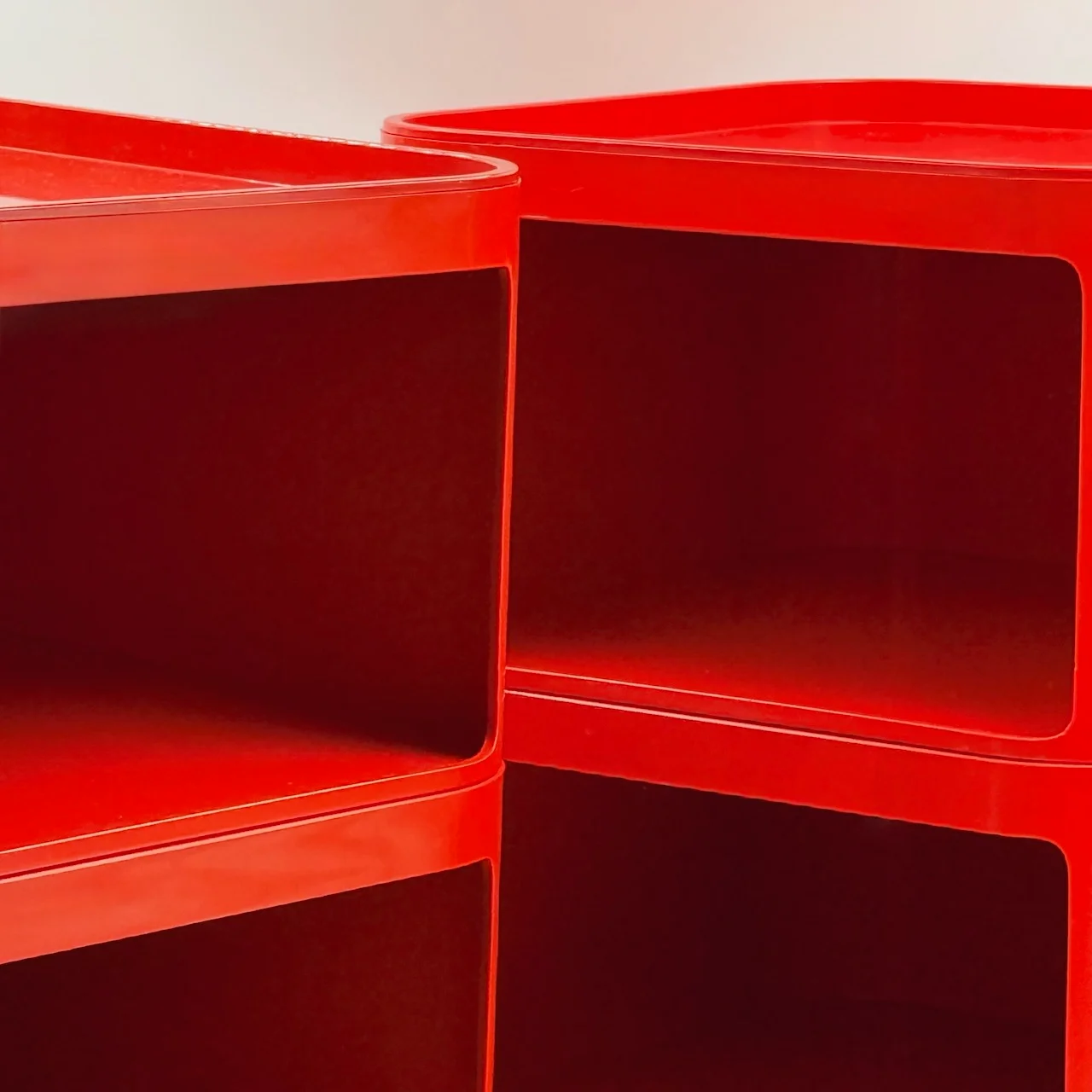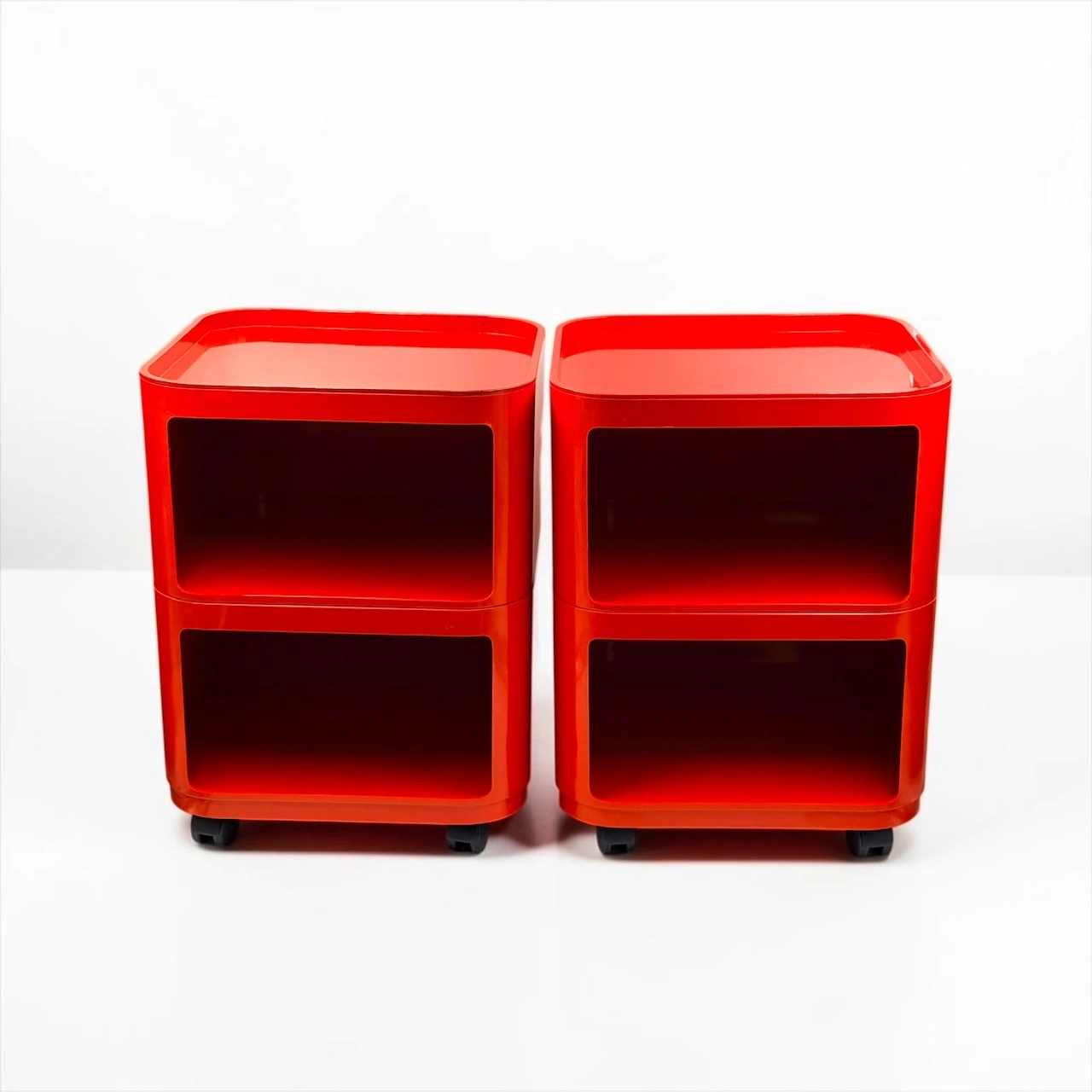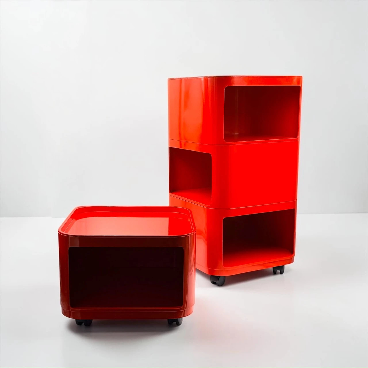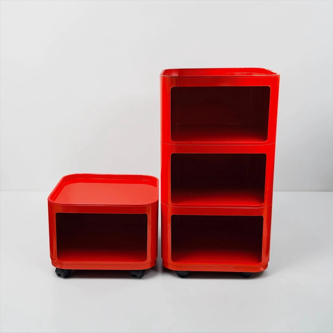 The red finish gives the composition a stronger visual impact than more neutral versions, turning a practical storage solution into a sculptural accent. Rounded edges, recessed openings and the glossy plastic surface create that unmistakable Space Age rhythm for which the Componibili became iconic. This Kartell Componibili red set works beautifully in a bedroom, studio, dressing area or living space, adding color, mobility and a distinctly architectural presence.
