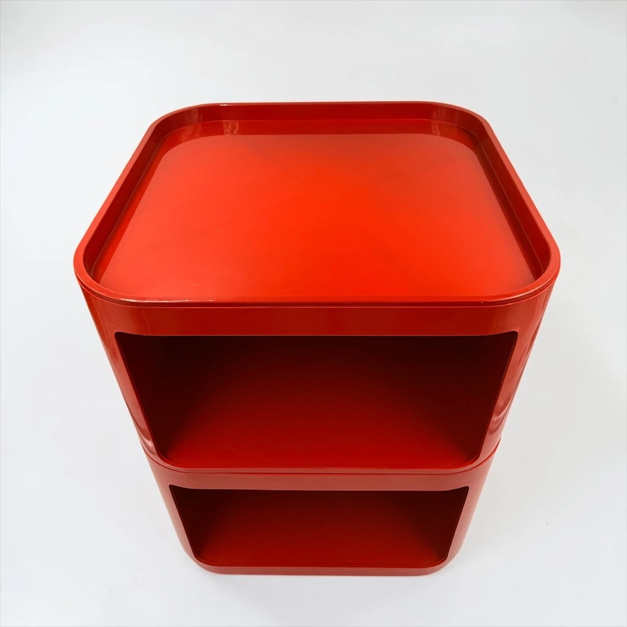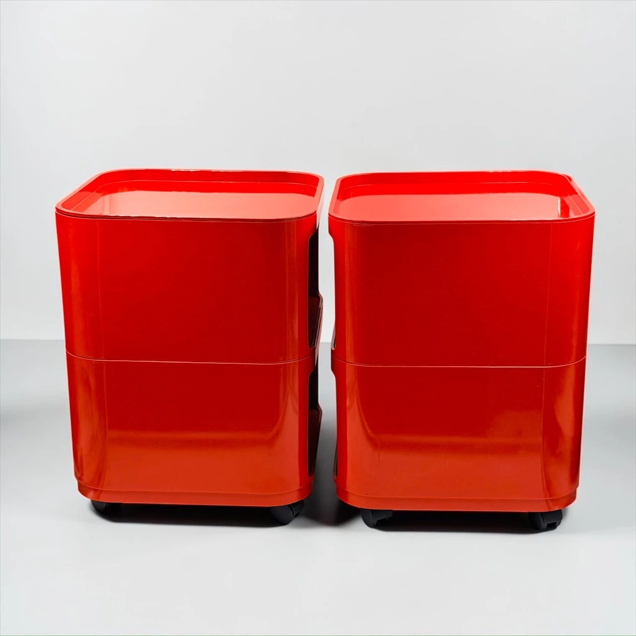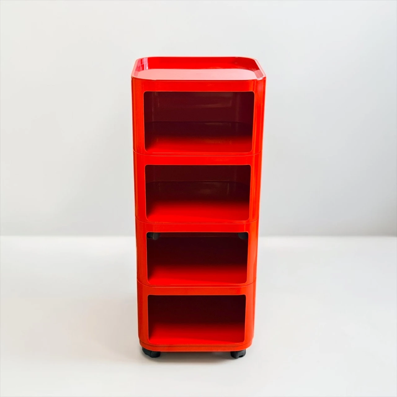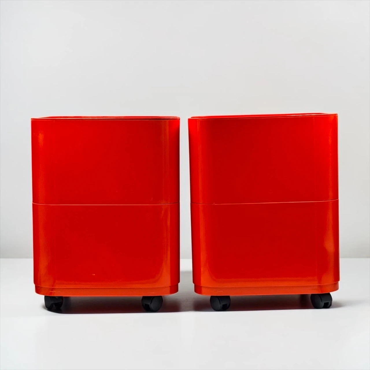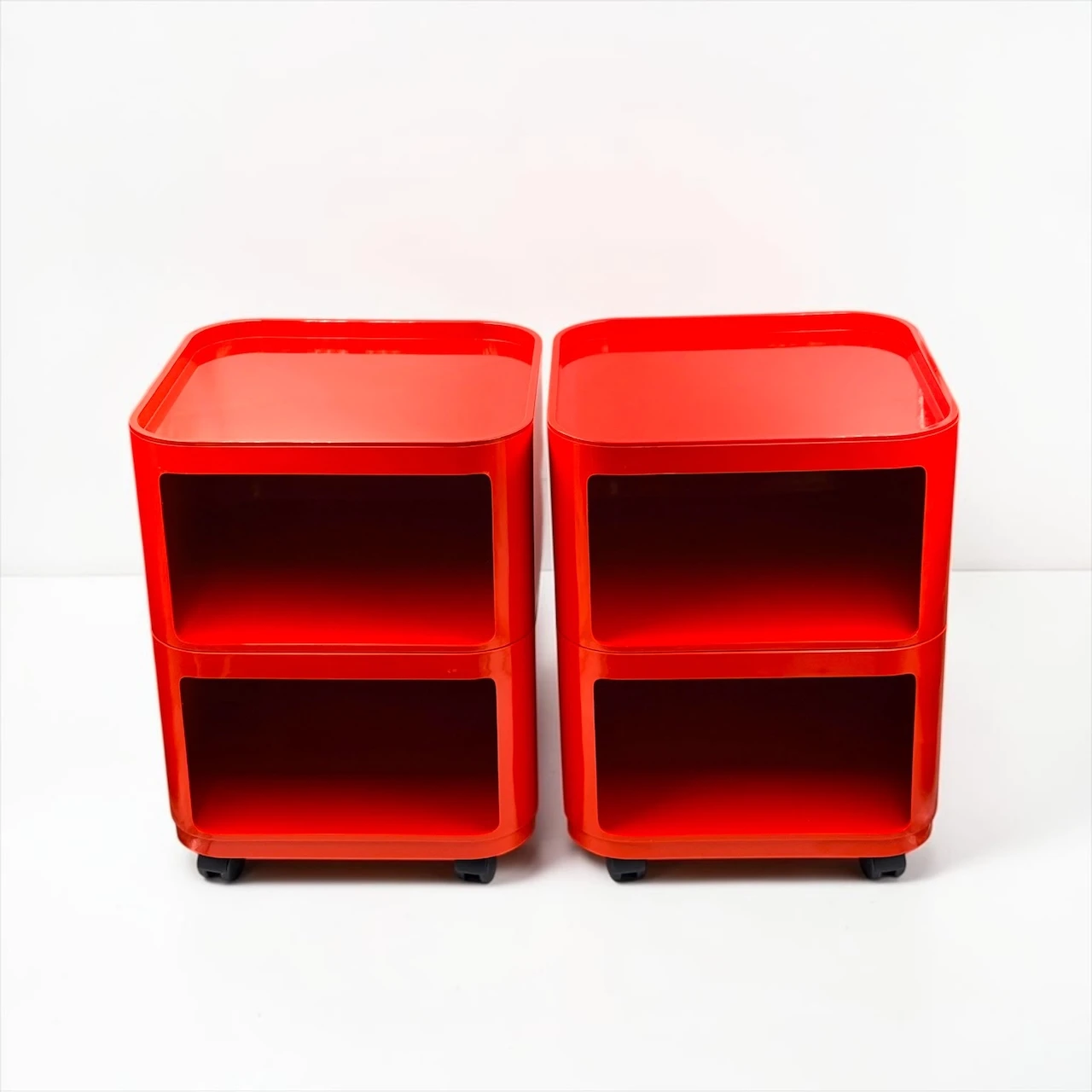 The red finish gives the composition a stronger visual impact than more neutral versions, turning a practical storage solution into a sculptural accent. Rounded edges, recessed openings and the glossy plastic surface create that unmistakable Space Age rhythm for which the Componibili became iconic. This Kartell Componibili red set works beautifully in a bedroom, studio, dressing area or living space, adding color, mobility and a distinctly architectural presence.