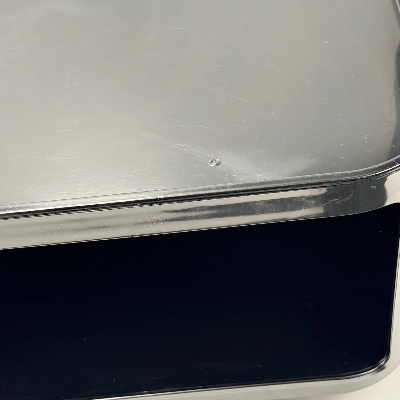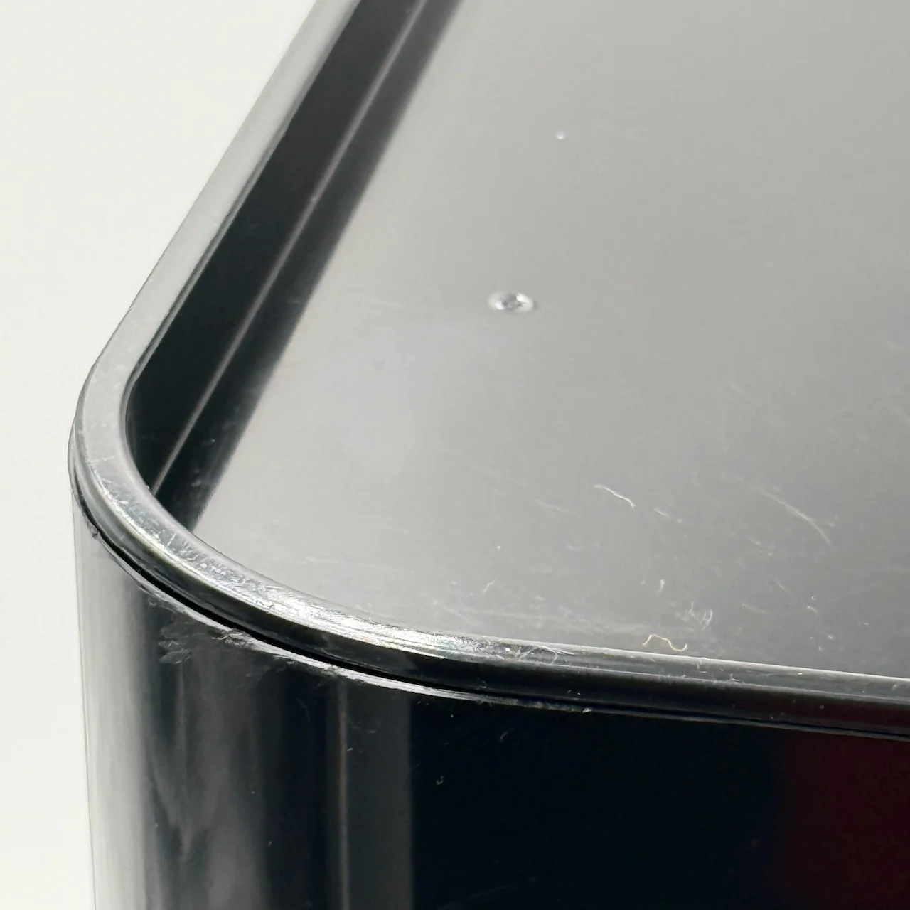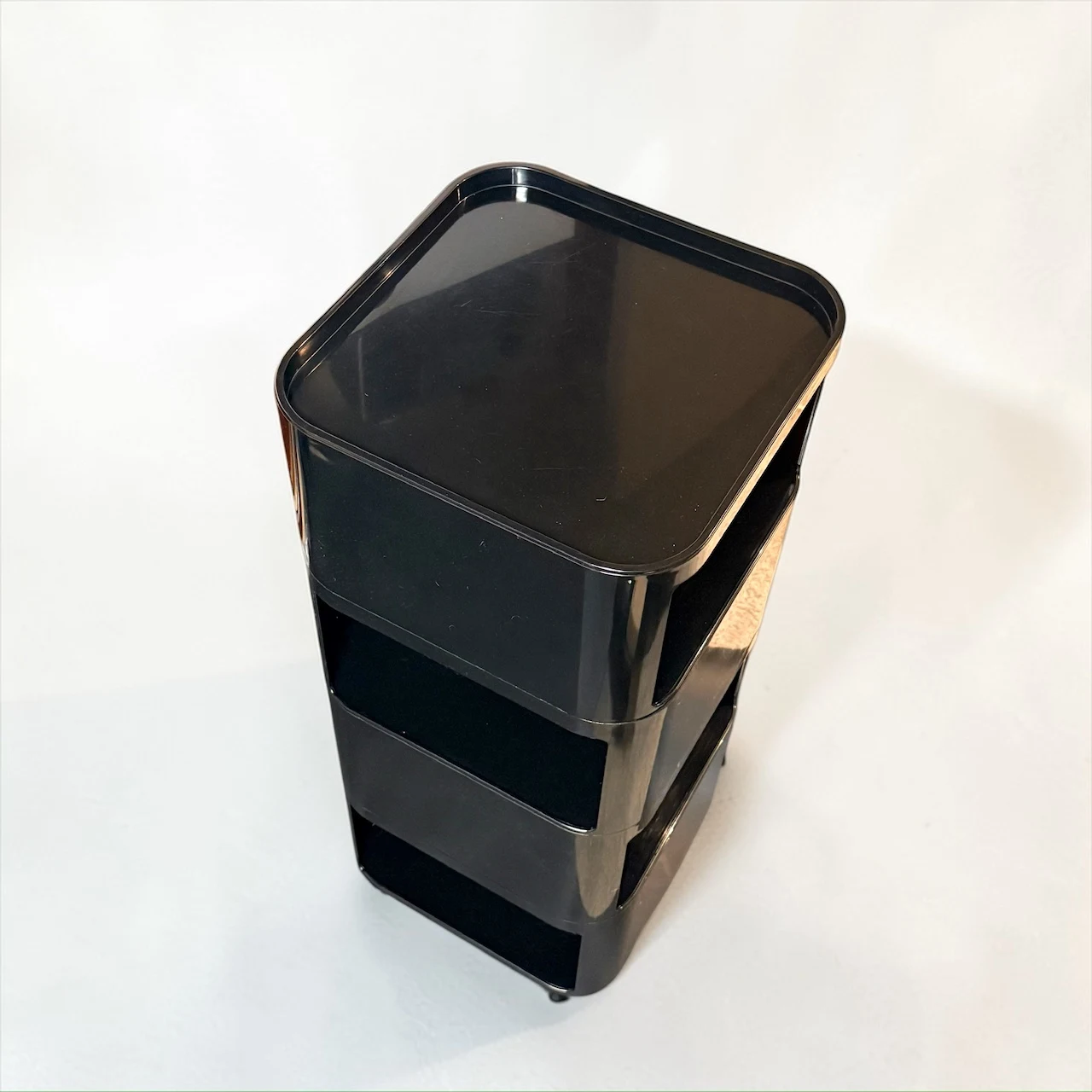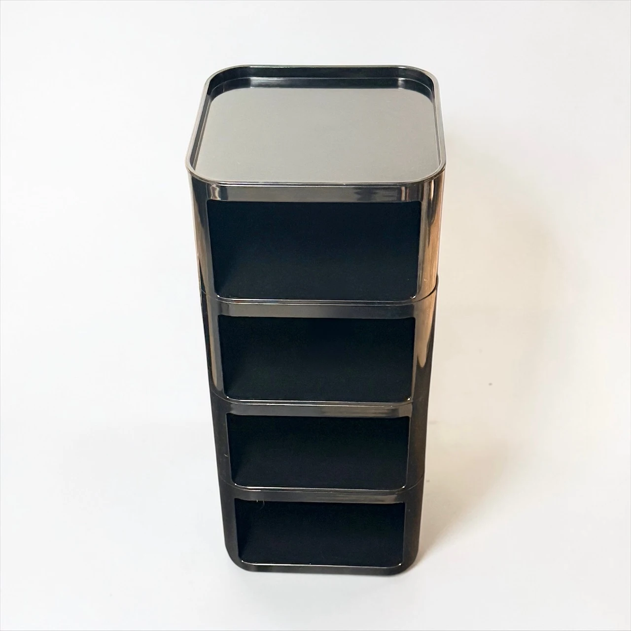 The present set includes four square modules, two tops and two sets of wheels. The elements can be arranged in multiple configurations: two compact units, a four-module tower, or smaller combinations depending on the space. This adaptability reflects the philosophy behind the Kartell modular system, where furniture could be rearranged to respond to different domestic needs.
