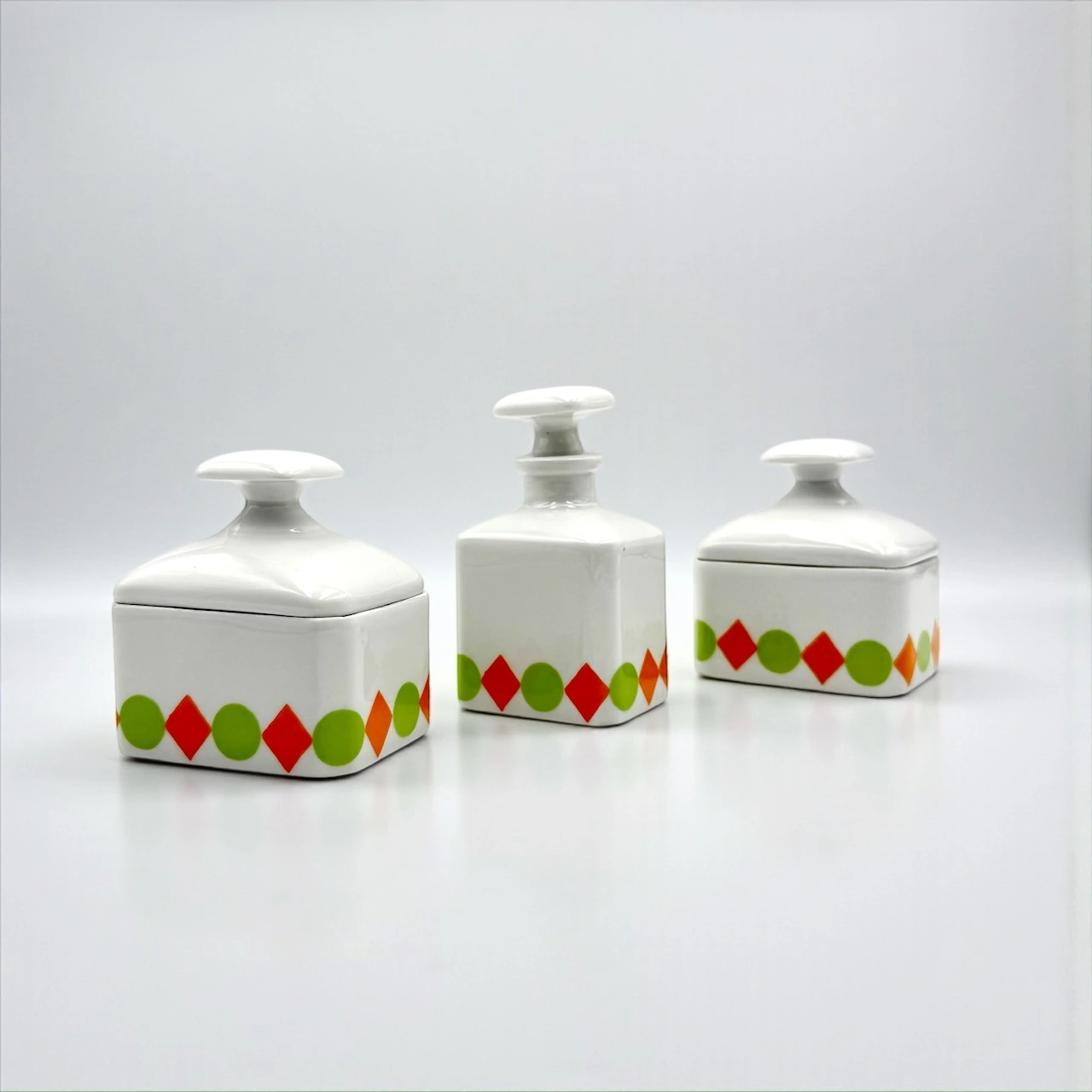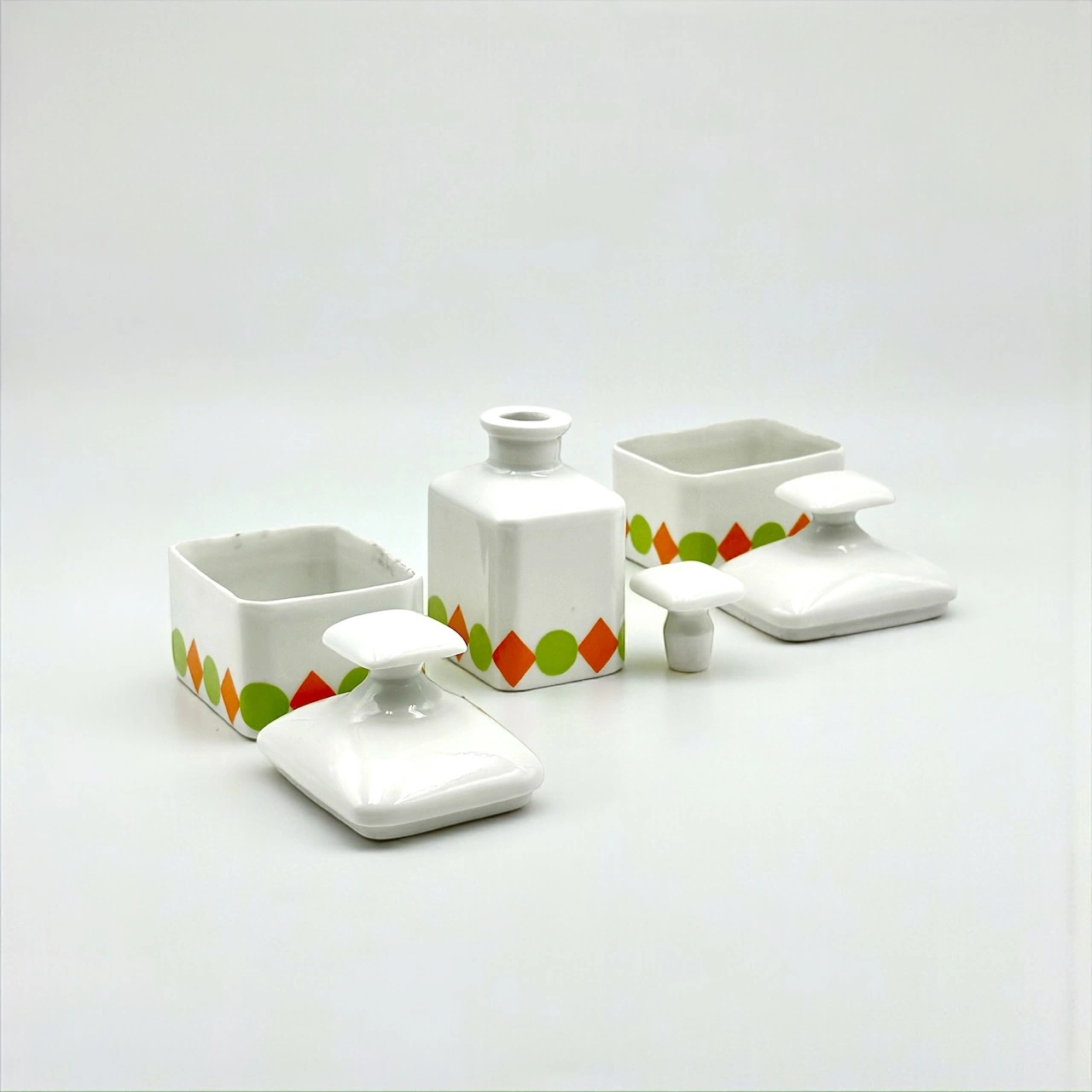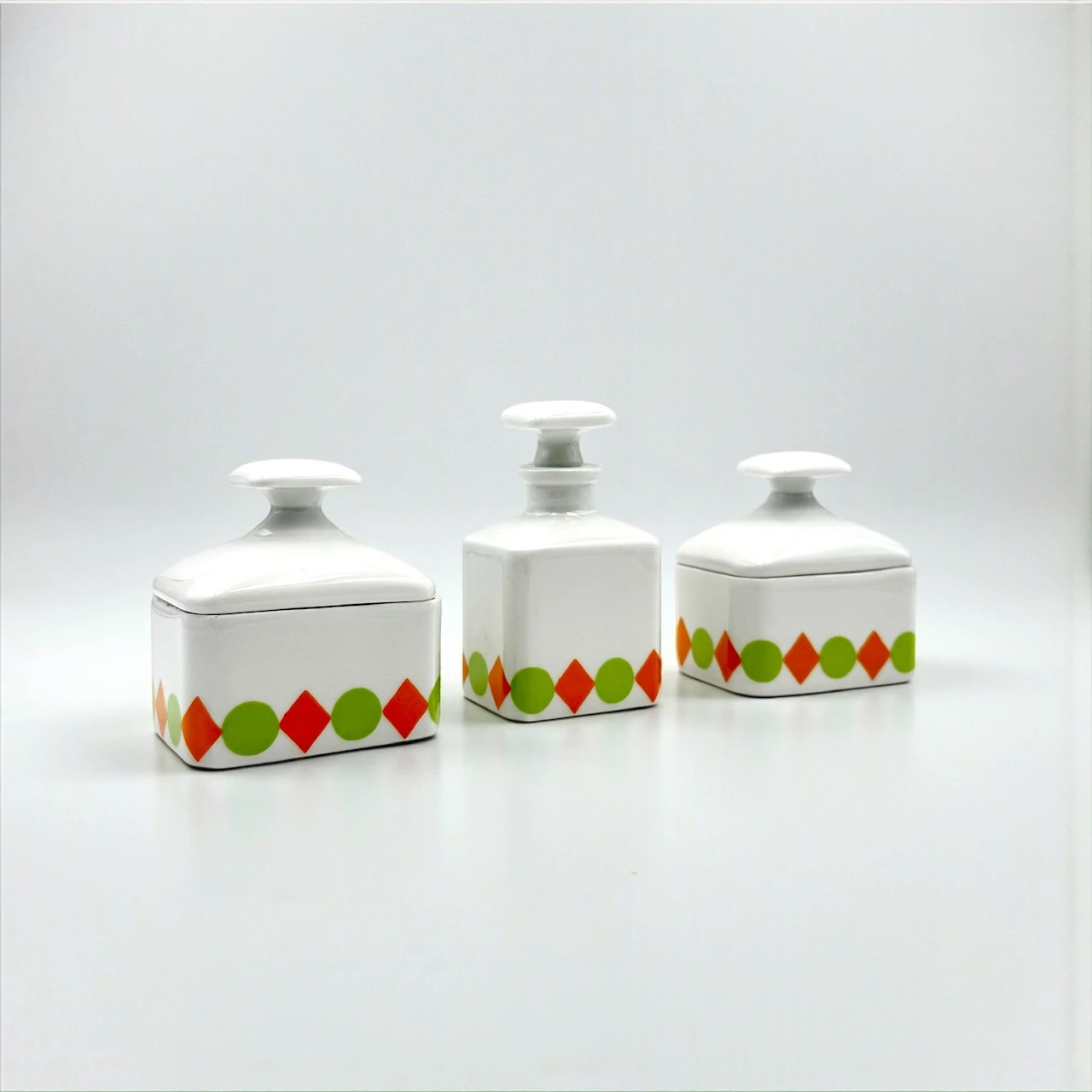 This Limoges toiletry set is a genuine document of French domestic design between tradition and modernity. It pairs naturally with both classic and contemporary interiors and appeals to collectors interested in early twentieth-century decorative objects, Limoges porcelain, and Art Deco influenced design.