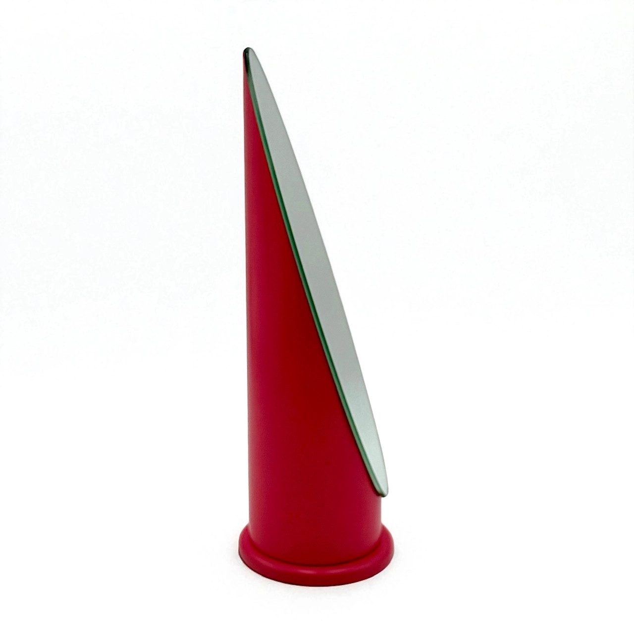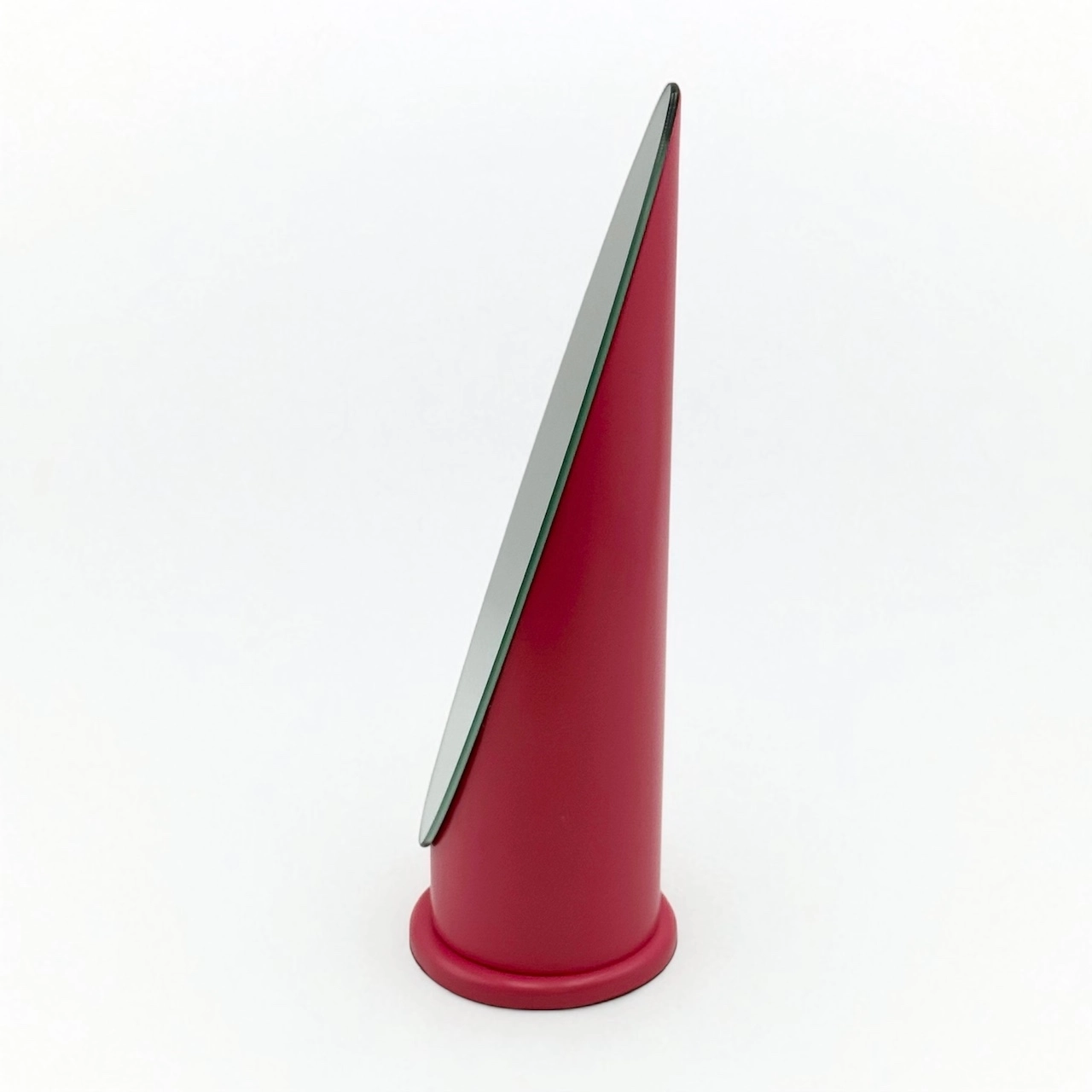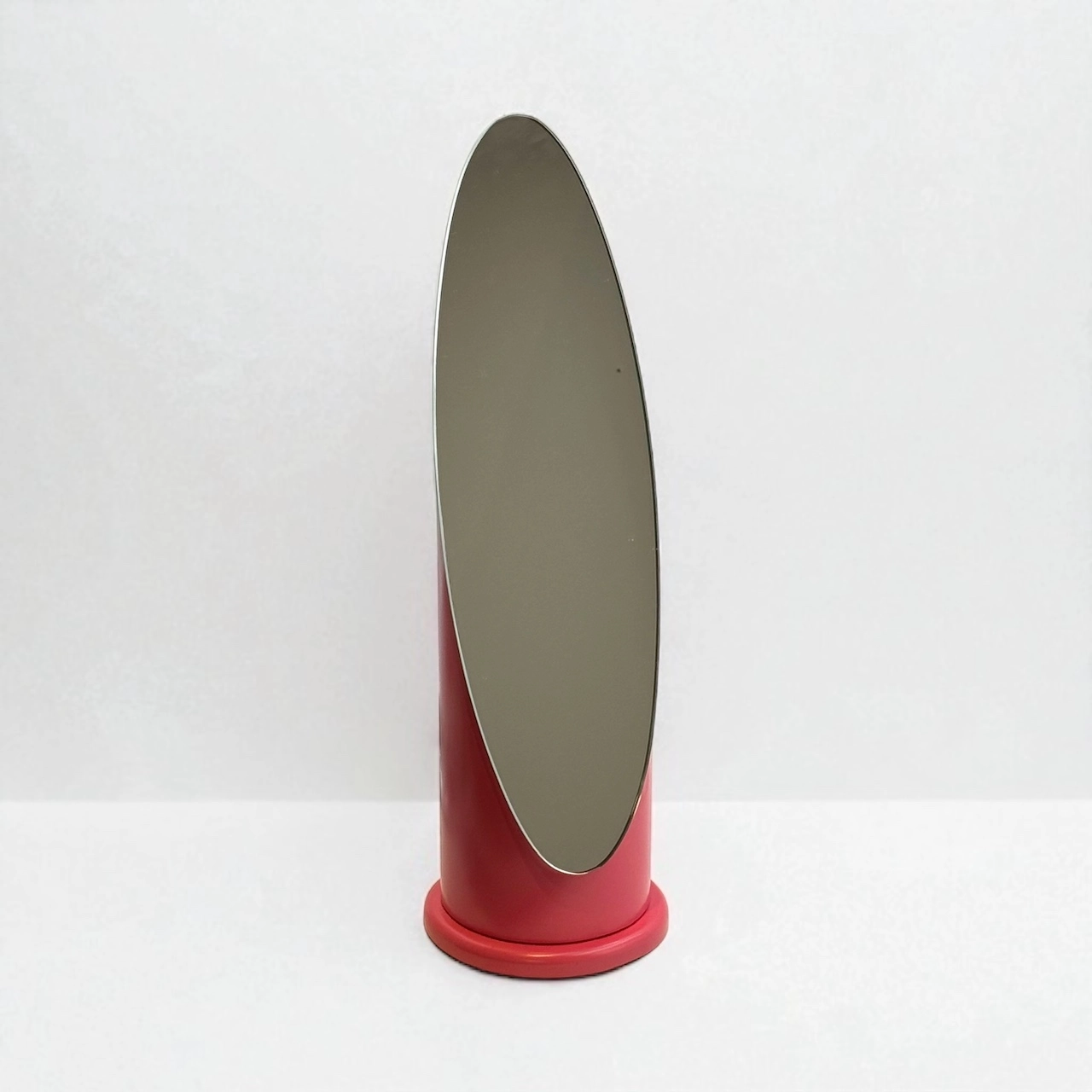 This sculptural 1970s tabletop mirror captures the essence of Italian Pop design. With its bold fuchsia base and tilted oval glass, it is a rare and collectible accent with playful form and vintage personality.
