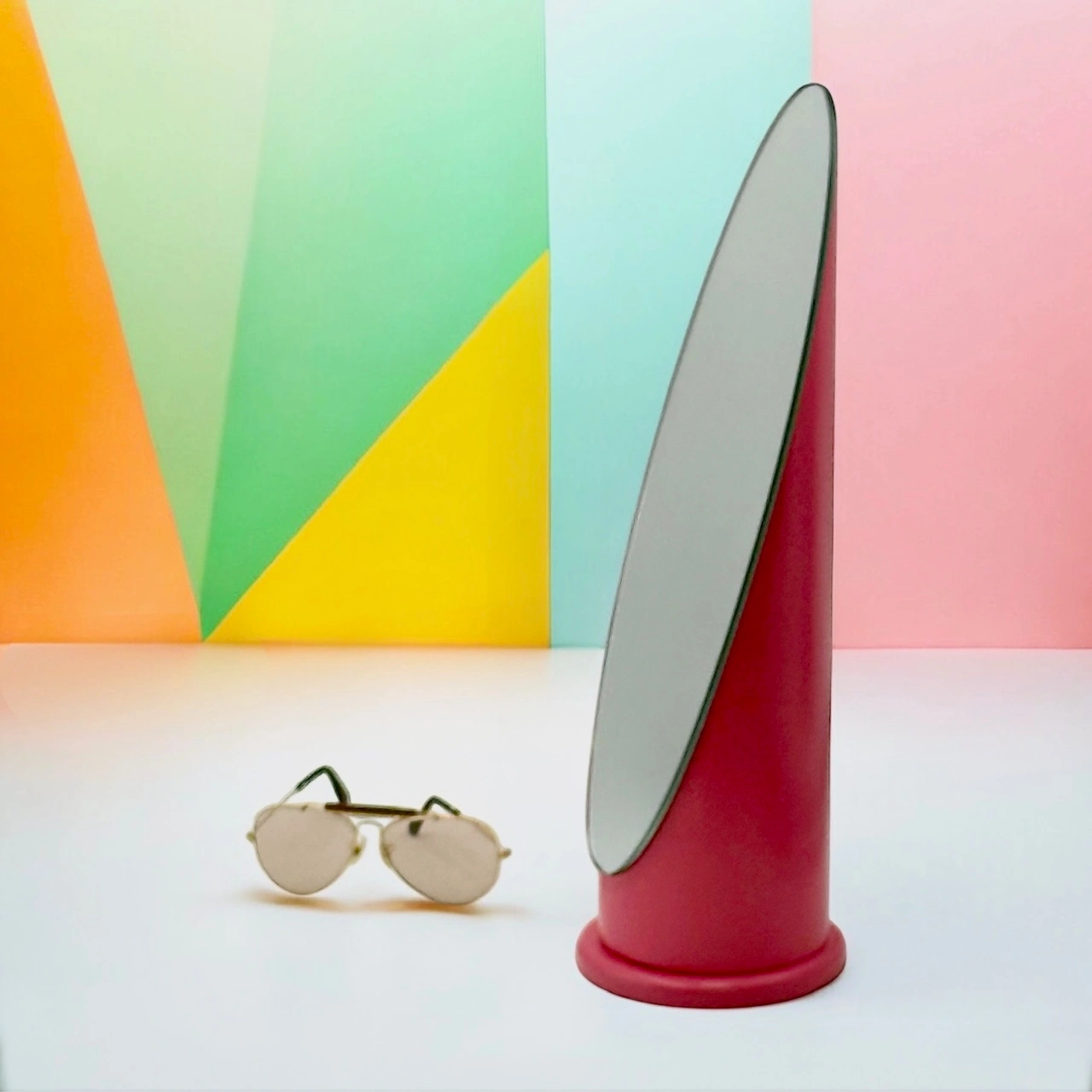 Clearly inspired by the iconic Lipstick mirror known as Specchio Unghia conceived by Rodolfo Bonetto and produced in Italy in the 70s, this piece brings its own take on the era’s radical aesthetics. Made of durable plastic and grey-tinted glass, it balances boldness with minimalism, making it a statement piece for any space.