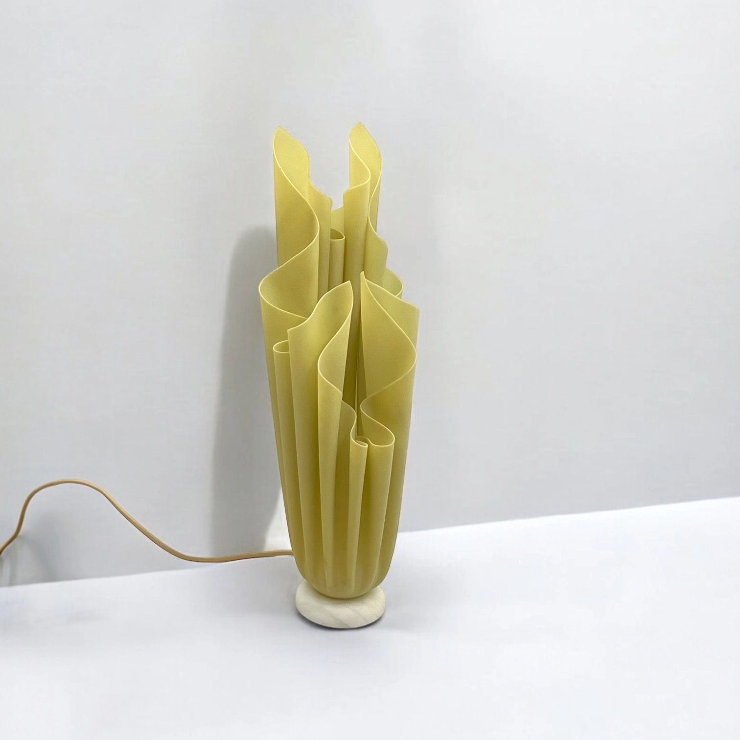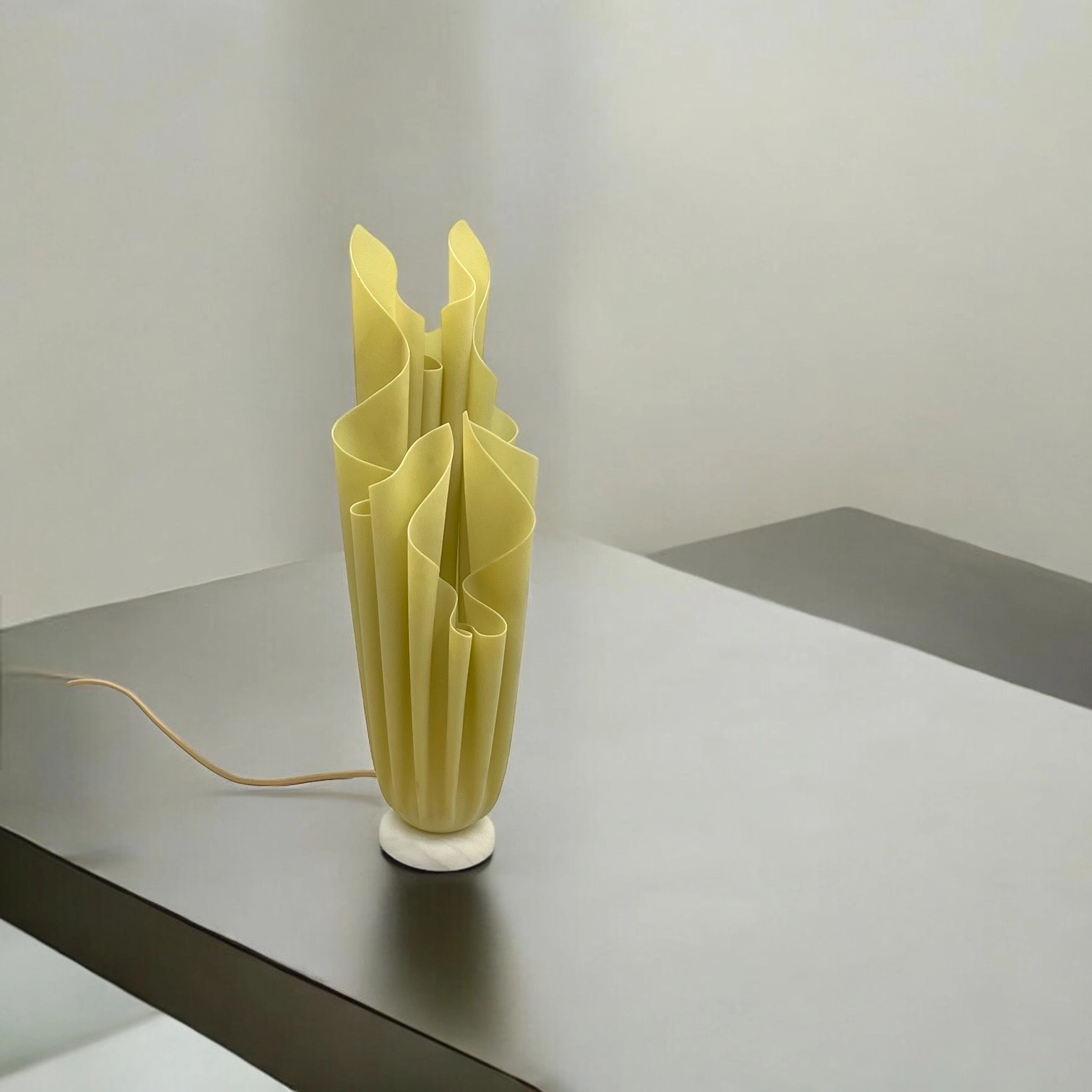 Elegant and distinctive table lamp “Athena”, created by Georgia Jacob in the 80s. Iconic draped resin lampshade and marble base for a warm ambient lighting.