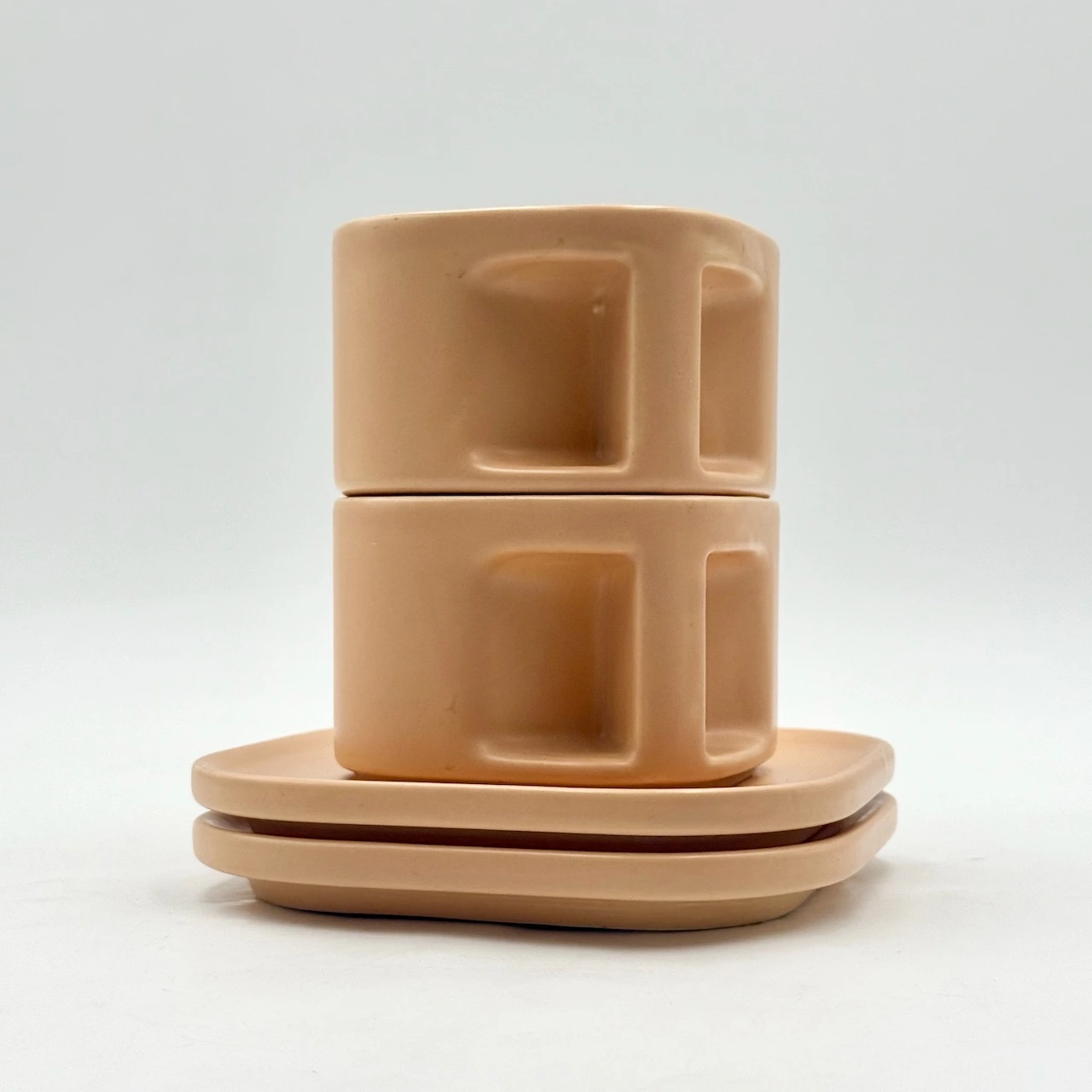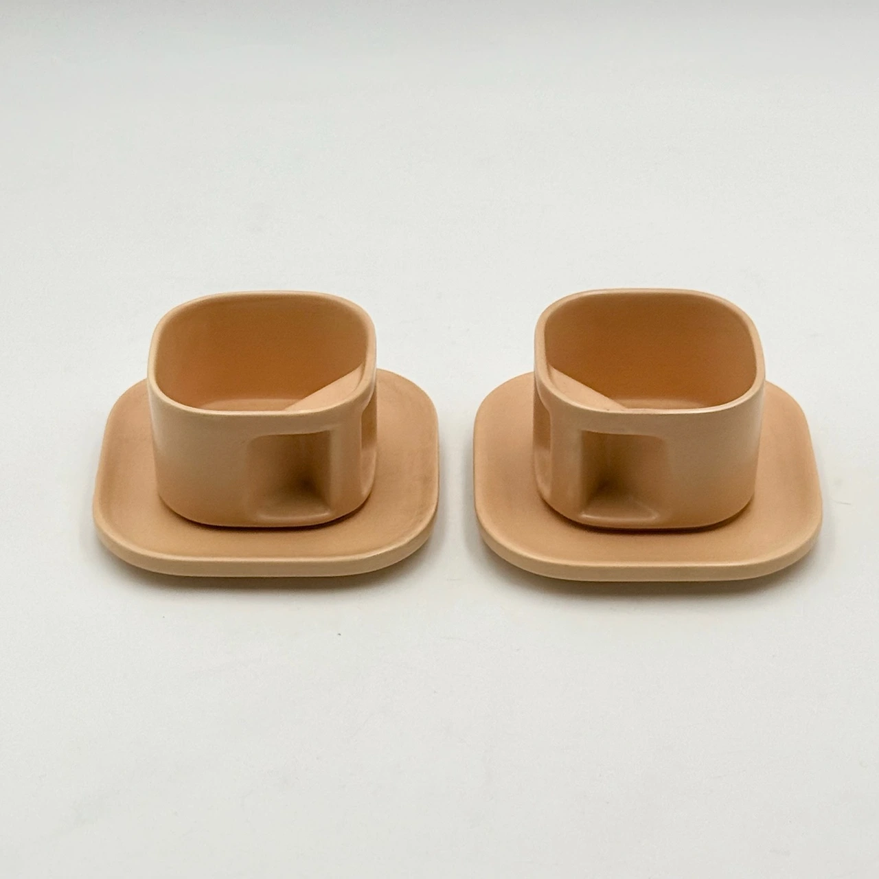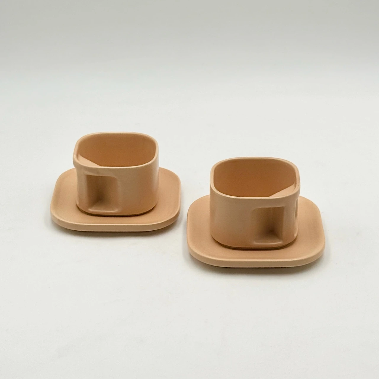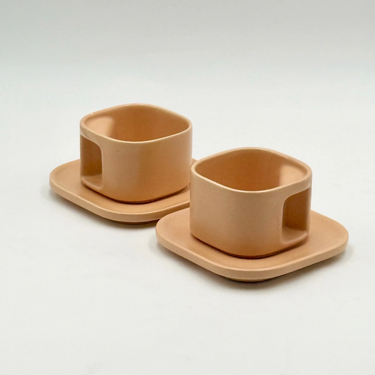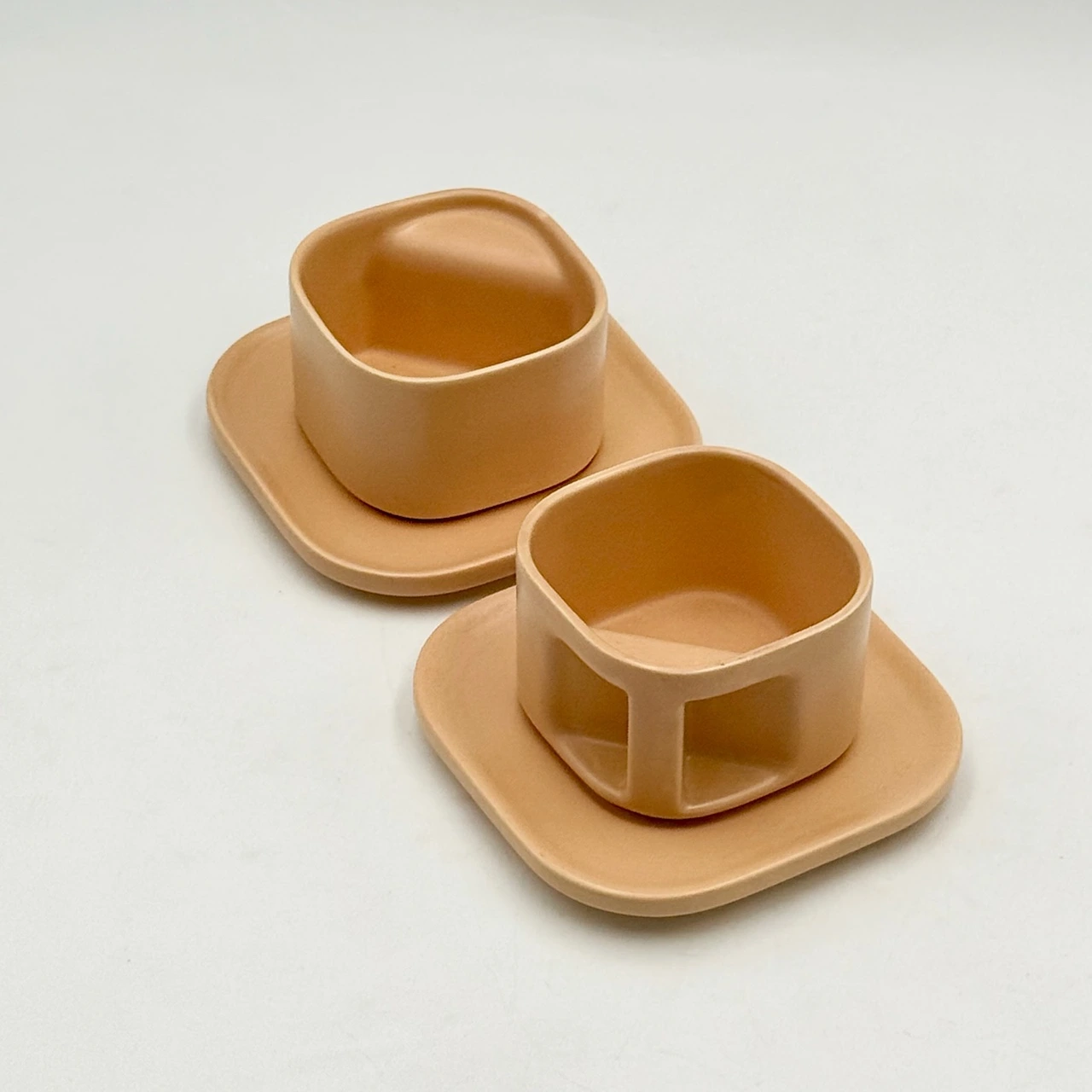 Each cup measures 9 cm in diameter and 6 cm in height, while the square saucers measure 14 cm by 1.5 cm. The proportions are intimate and precise, conceived for espresso or short coffee rituals.