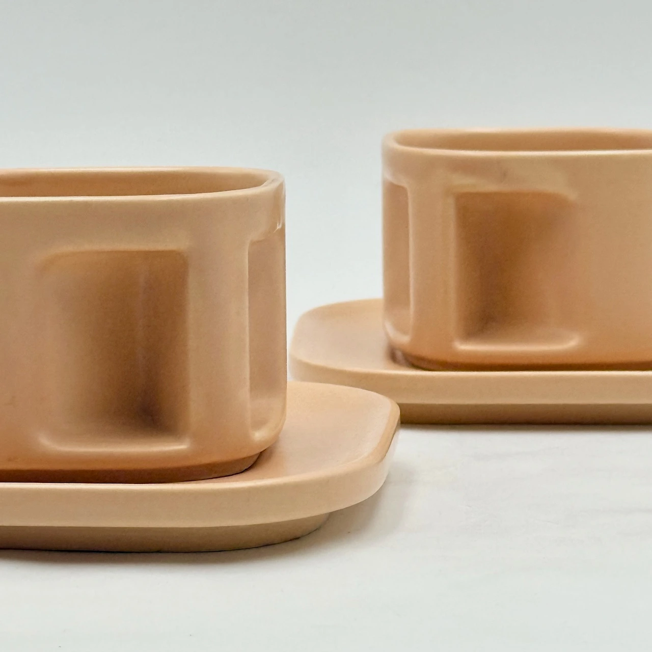 The softly squared shape, integrated handle and matching saucers define these Makio Hasuike cups as both functional and expressive. Finished in an elegant powder pink ceramic, they embody the experimental yet timeless character of Italian design from the 1970s, making them suitable for contemporary interiors as well as curated vintage collections.