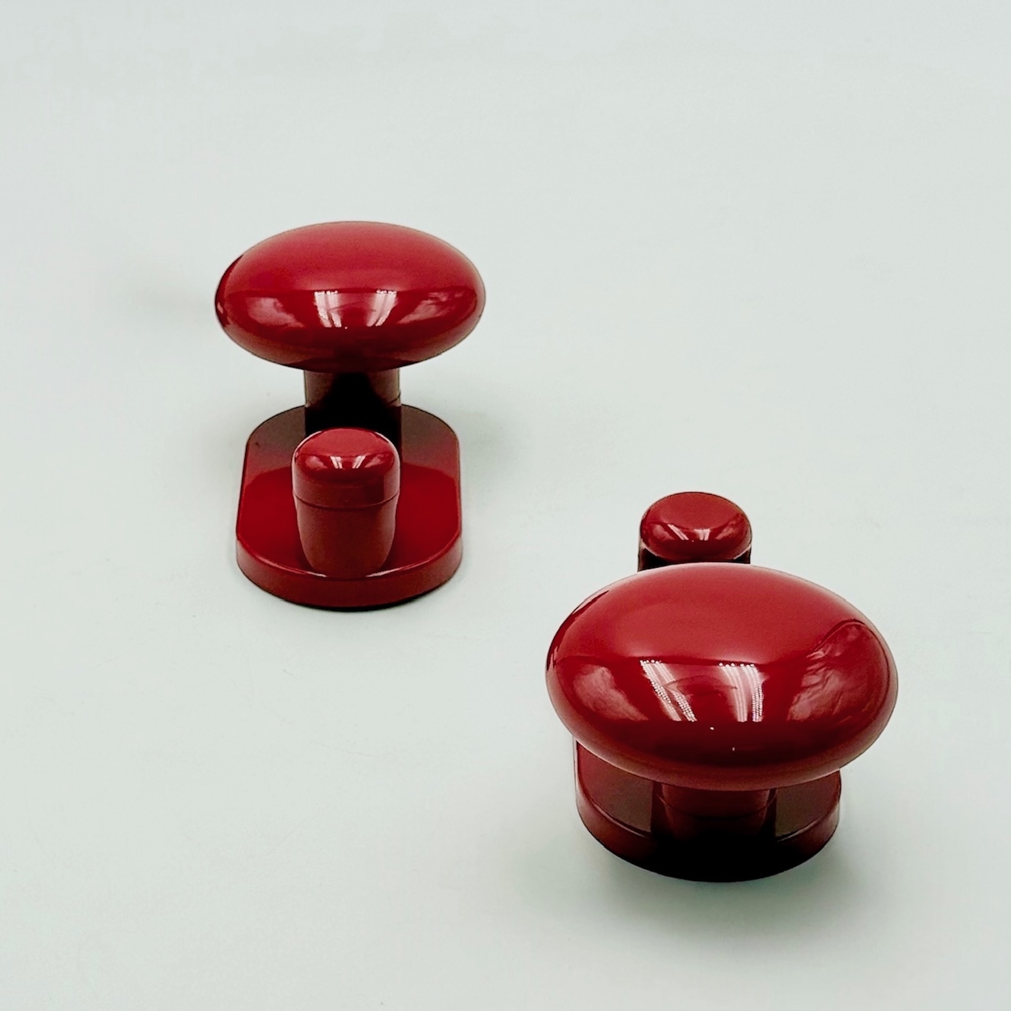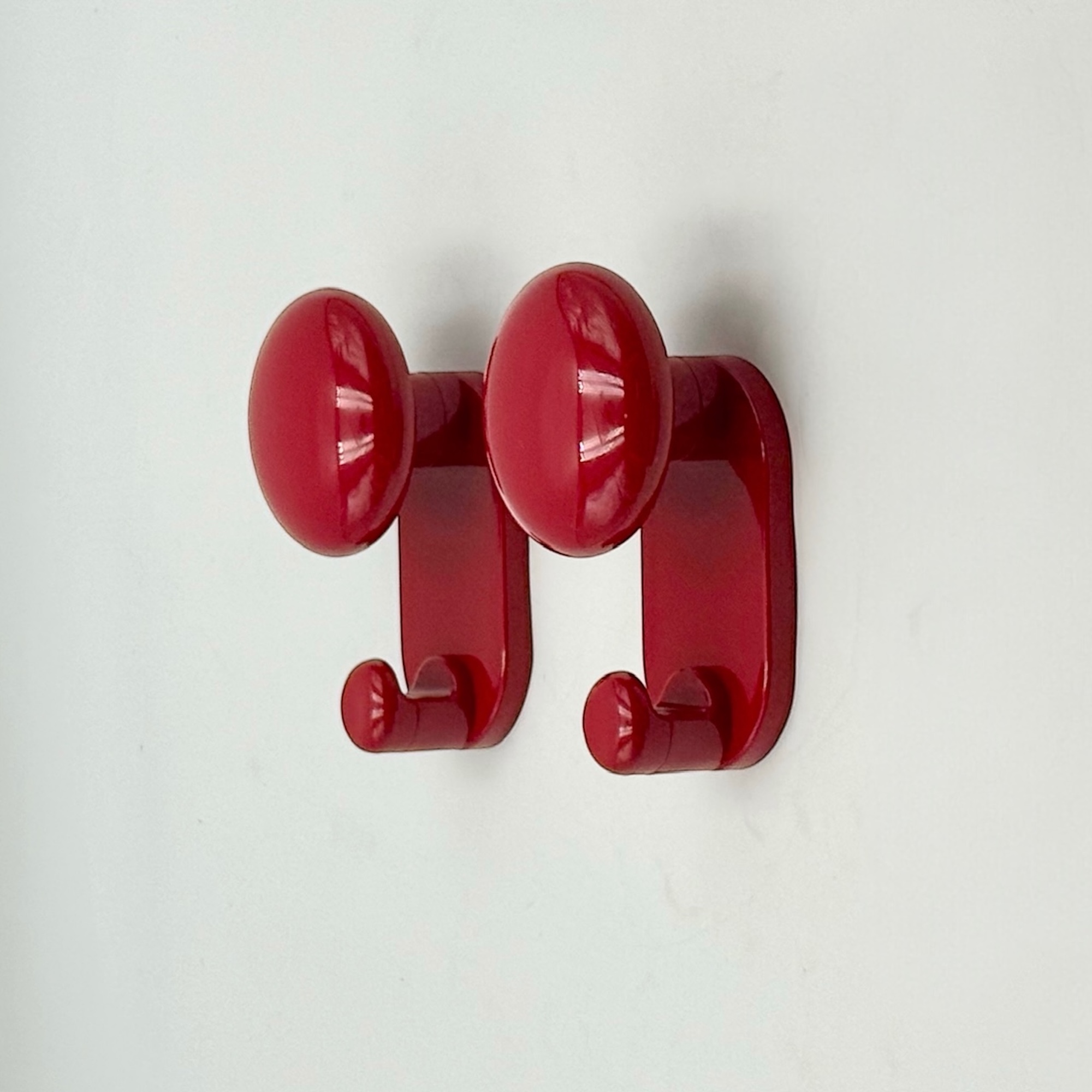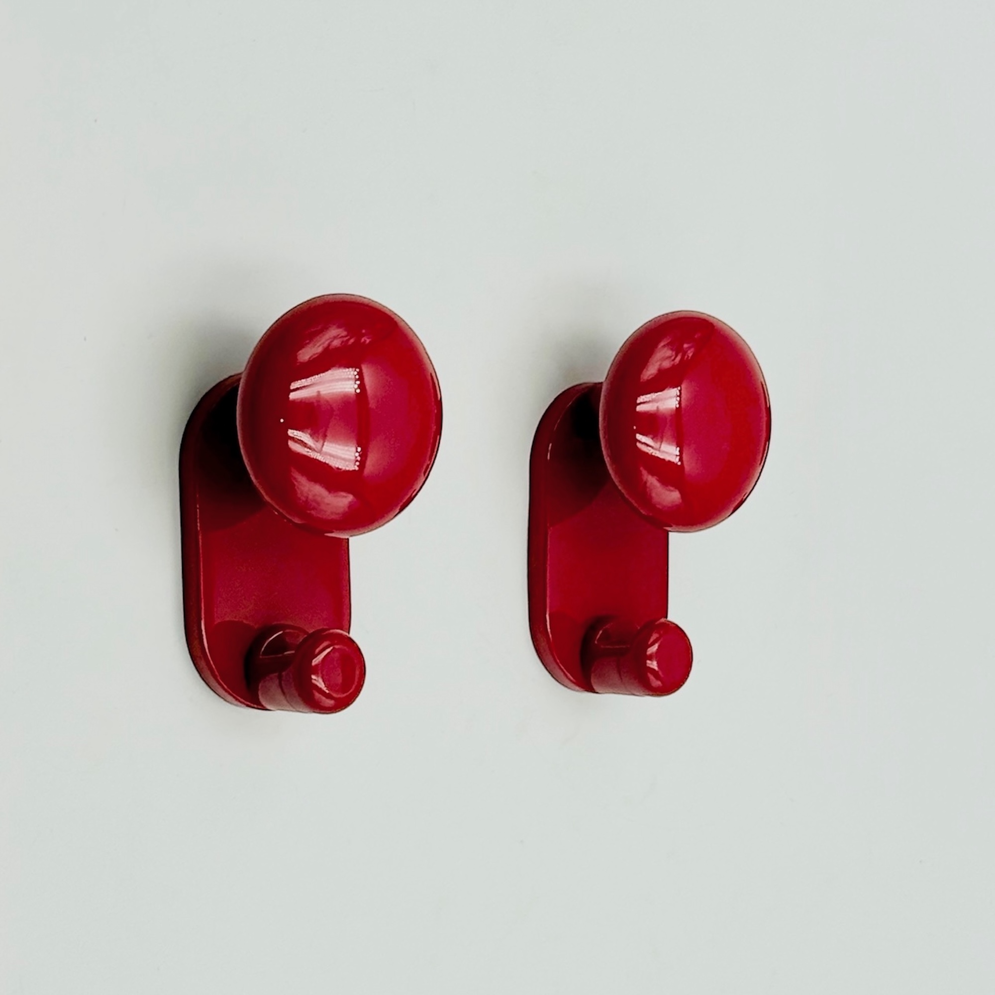 This refined set of modernist wall hooks reflects the industrial clarity and minimal elegance of Italian design in the late 1960s and 1970s. Designed by Carlo Bartoli and produced by Con&Con, the set includes two wall-mounted coat hangers, each composed of a rounded knob with an integrated hook. Their glossy red surface enhances the sculptural quality of the design, creating a striking focal point while remaining highly functional.