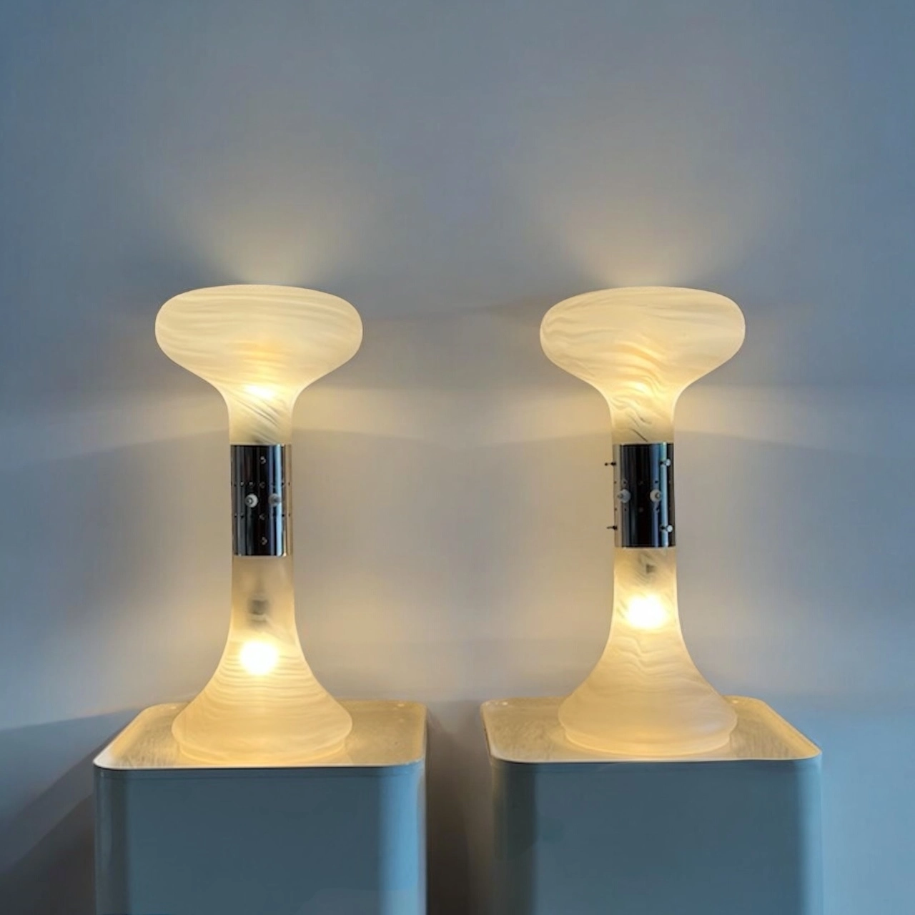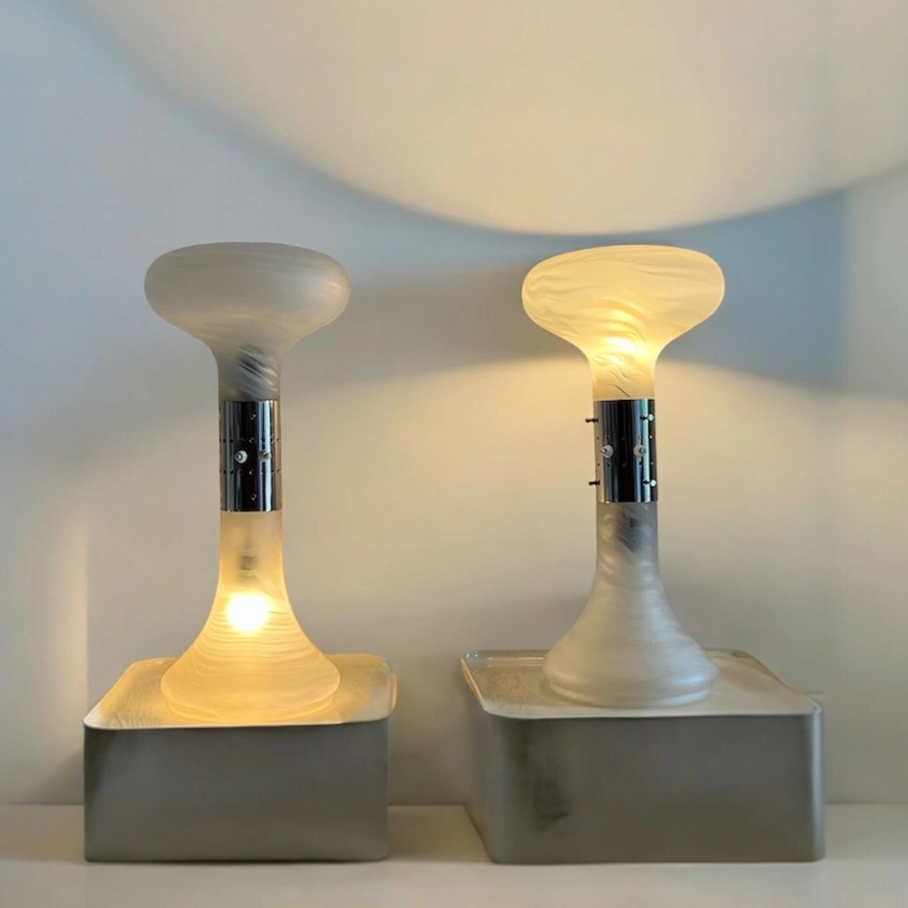 The translucent glass emits a warm, inviting glow, adding a sophisticated ambiance to any room. Each lamp is highlighted by a central chrome metal ring that elegantly supports the bulb holders, blending modern design with the timeless charm of the 70s.