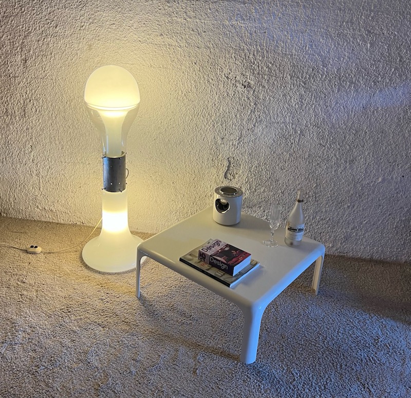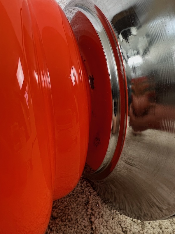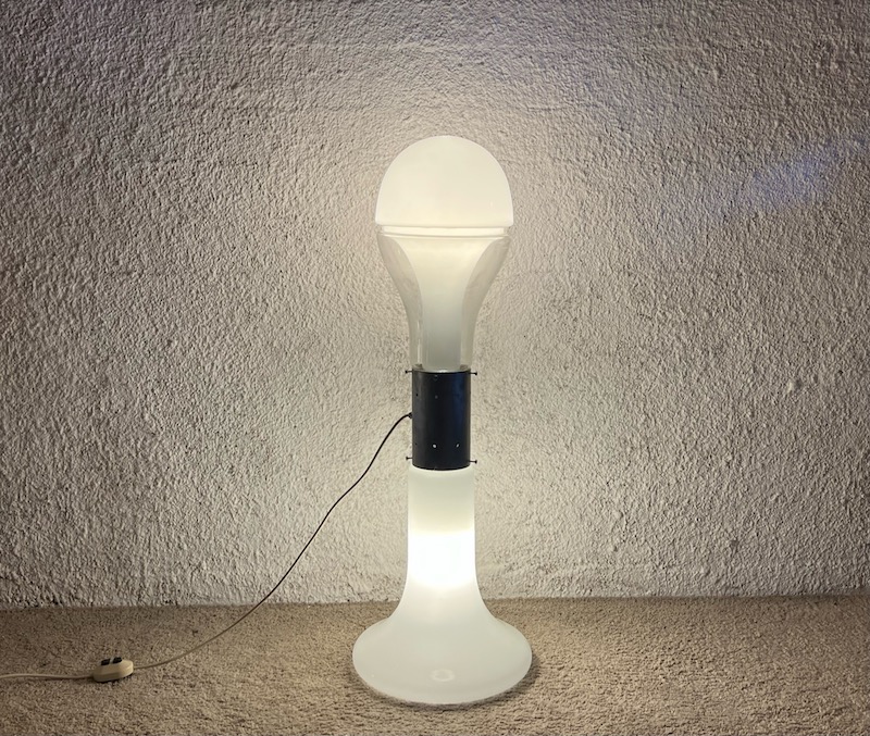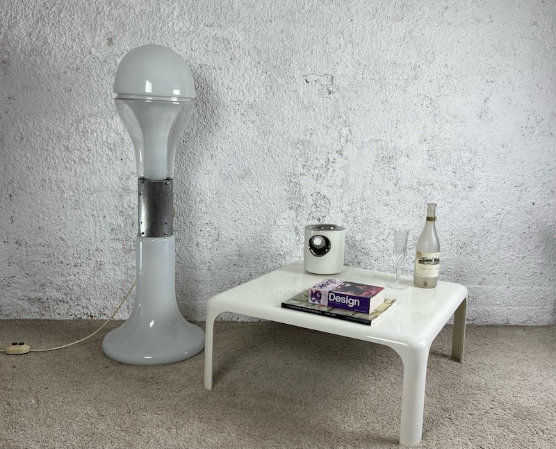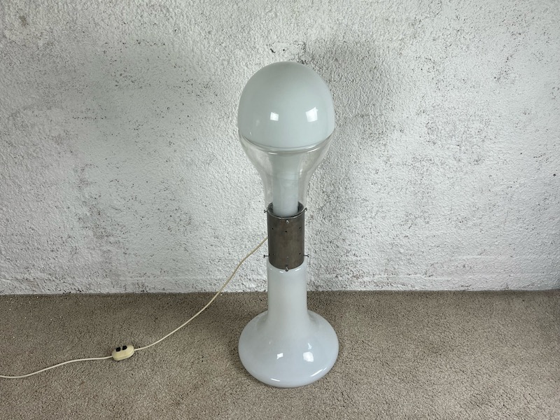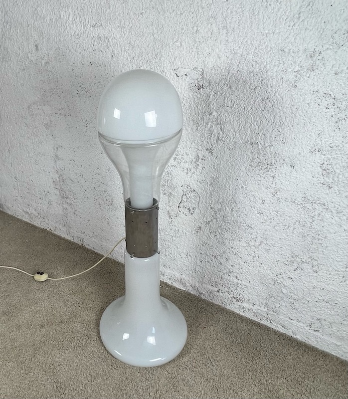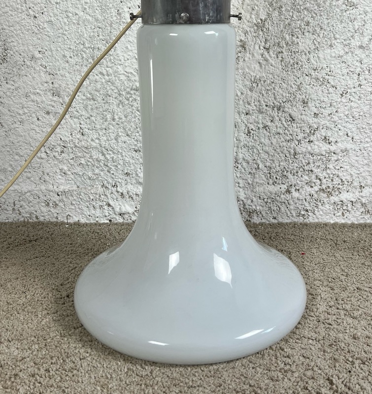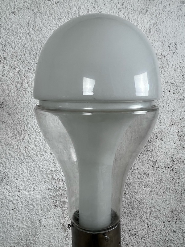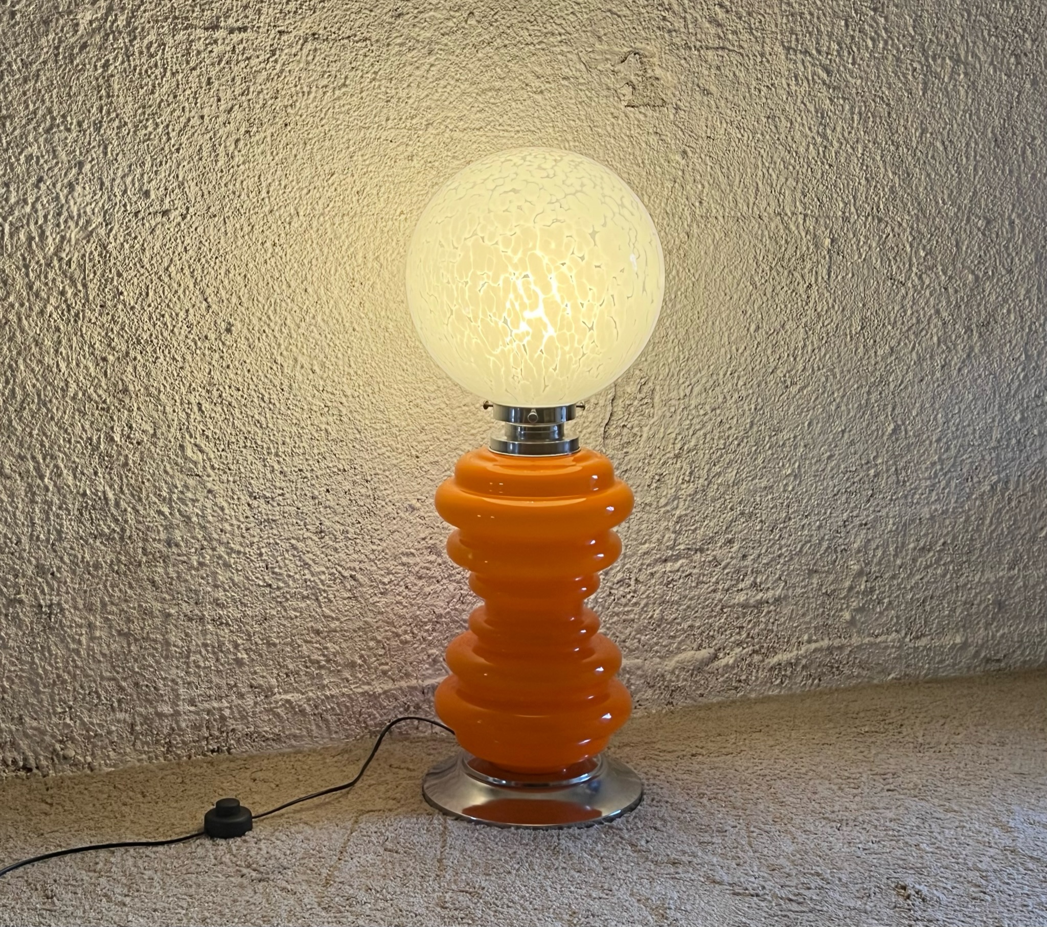 This lamp is made of opaline orange base and a large white mottled glass lampshade. The chromed metal parts perfectly match with the iconic shape of this beautiful lamp.