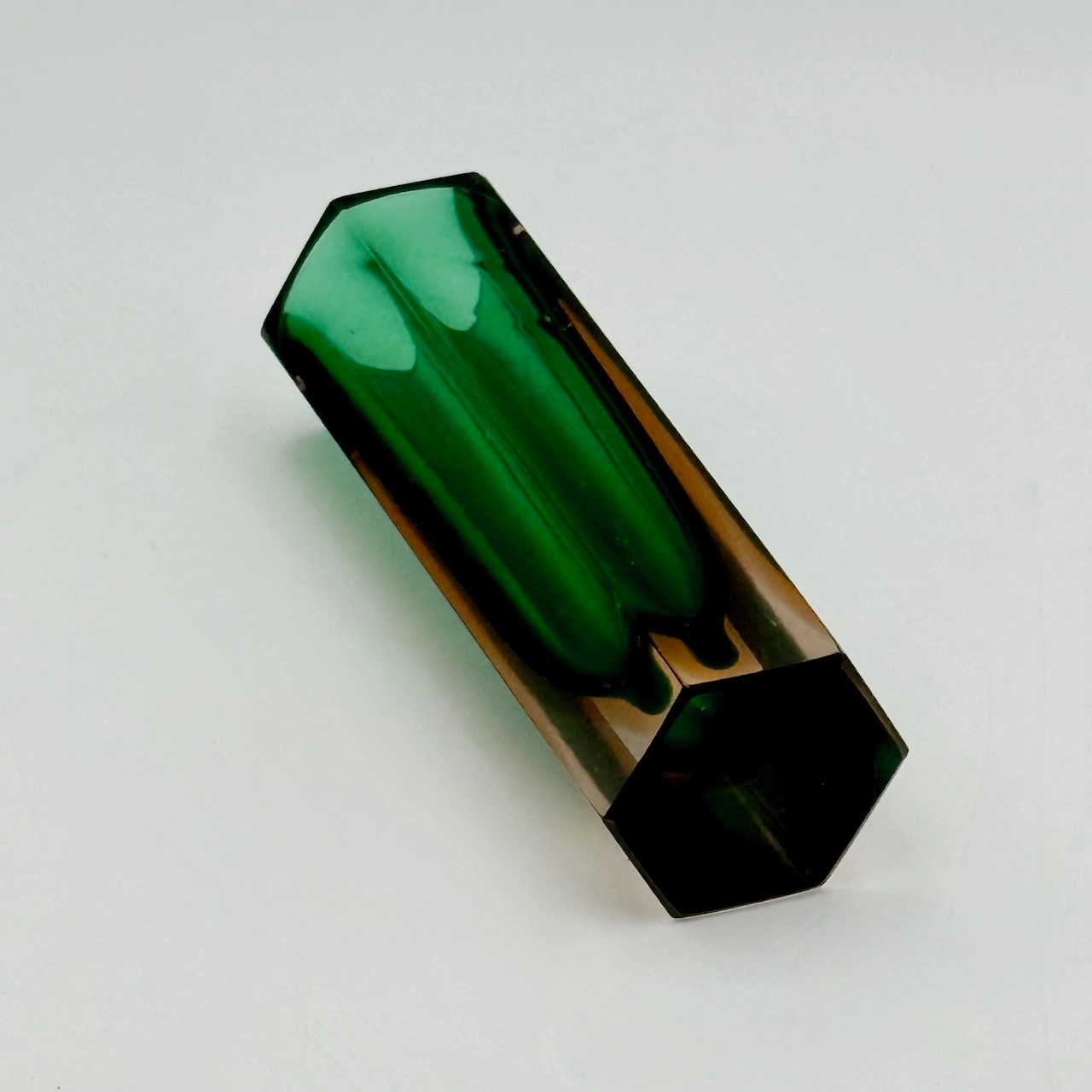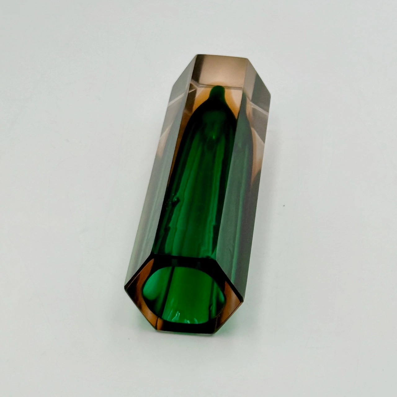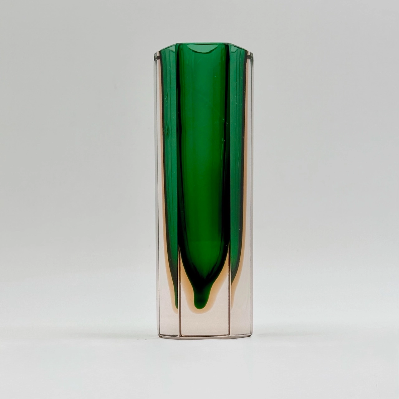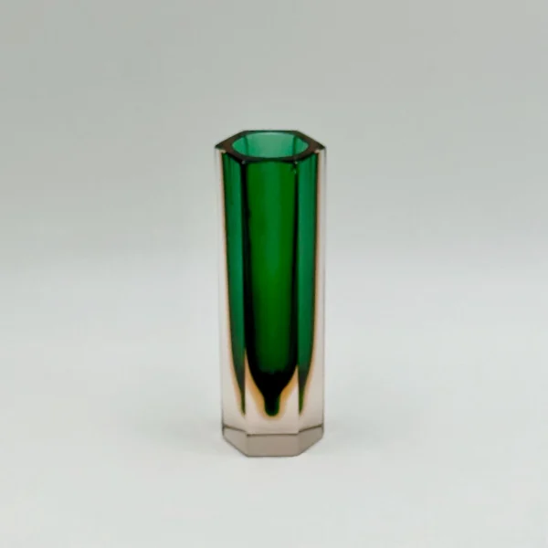 Small Murano glass vase from the 1960s, crafted using the “sommerso” technique. Its faceted hexagonal form frames a vibrant emerald core within amber-tinted crystal. A collectible gem of bold geometry and timeless elegance.