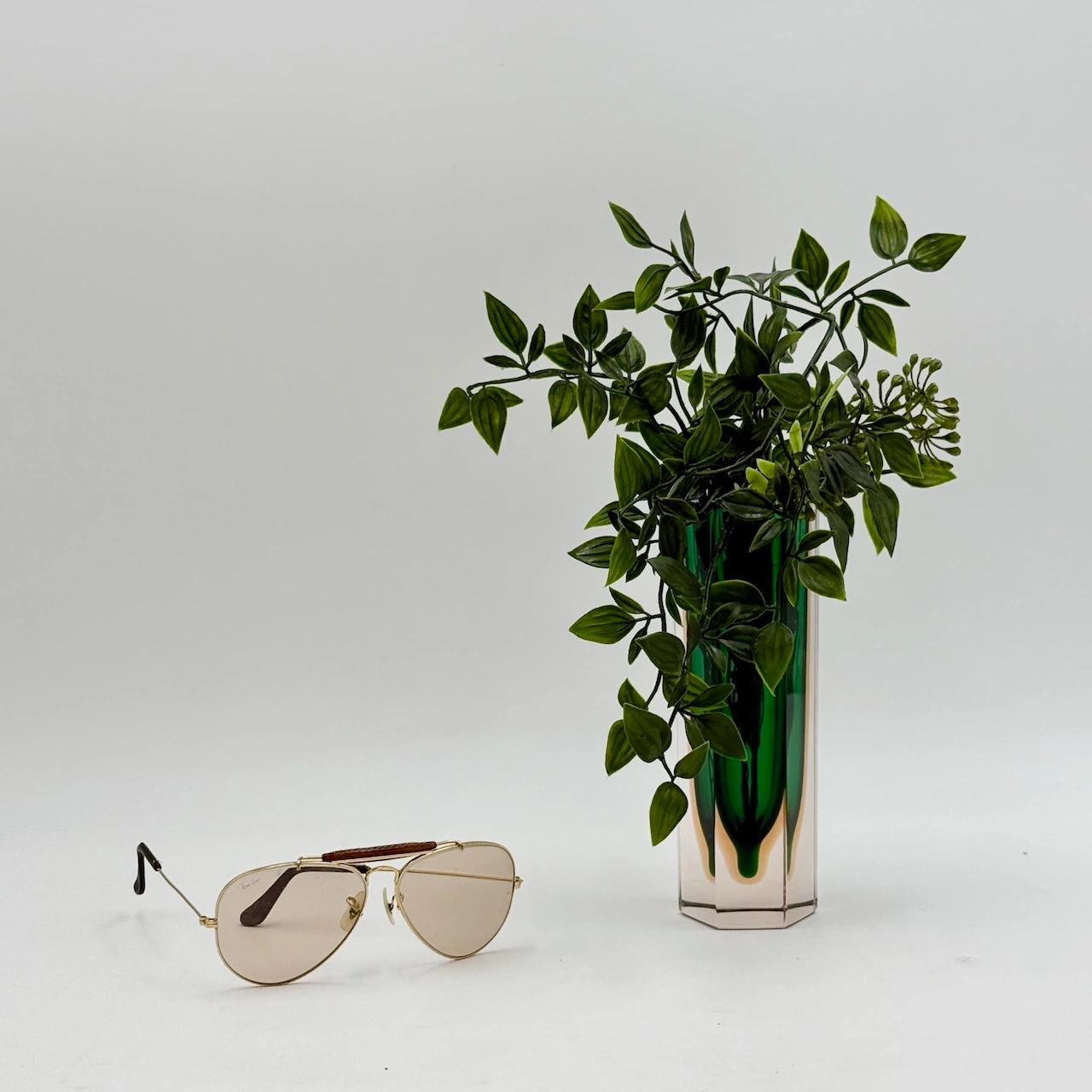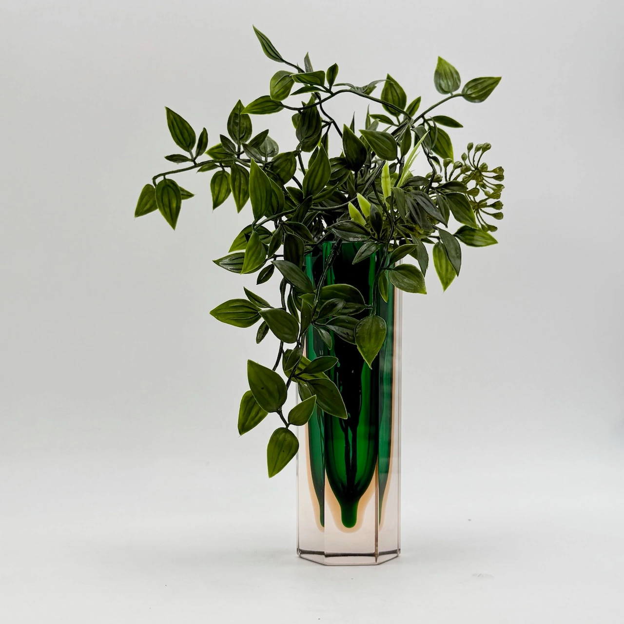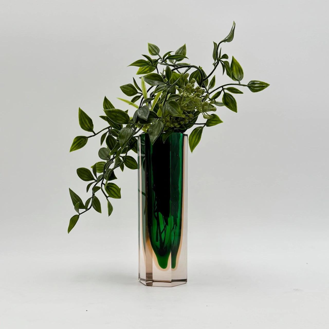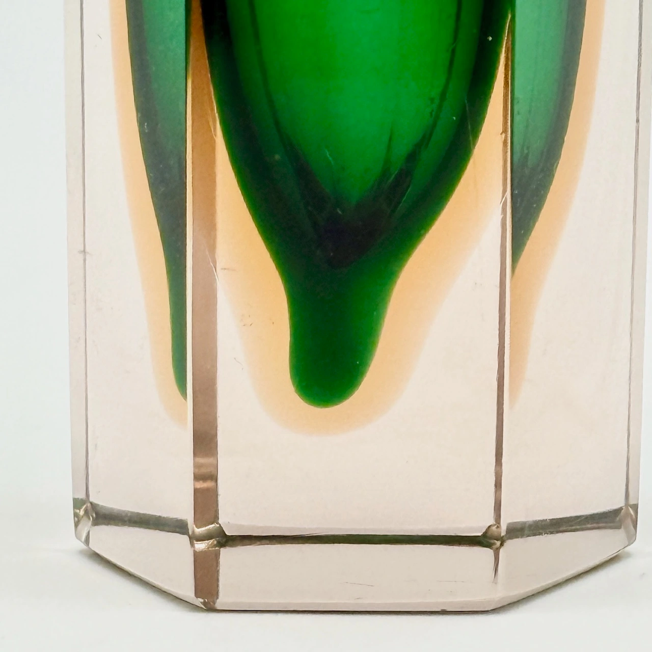Small Murano glass vase from the 1960s, crafted using the “sommerso” technique. Its faceted hexagonal form frames a vibrant emerald core within amber-tinted crystal. A collectible gem of bold geometry and timeless elegance.