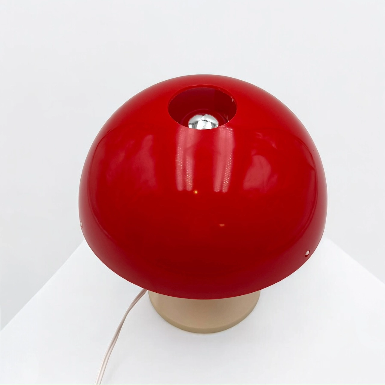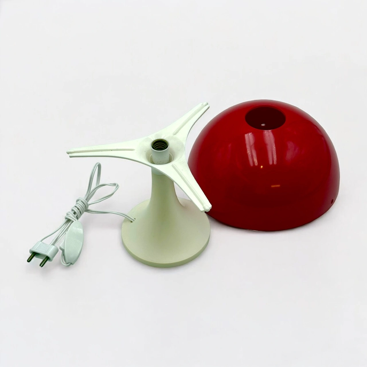 This striking mushroom table lamp captures the playful futurism of 1970s space age design. With its vivid red dome and ivory tulip-shaped base, it brings a bold pop of color and form to any interior. The lamp is entirely original, featuring its vintage E14 socket, cable, and plug—all in excellent working condition. When switched on, the red dome emits a warm, ambient light, while the base glows softly, creating a captivating visual effect.