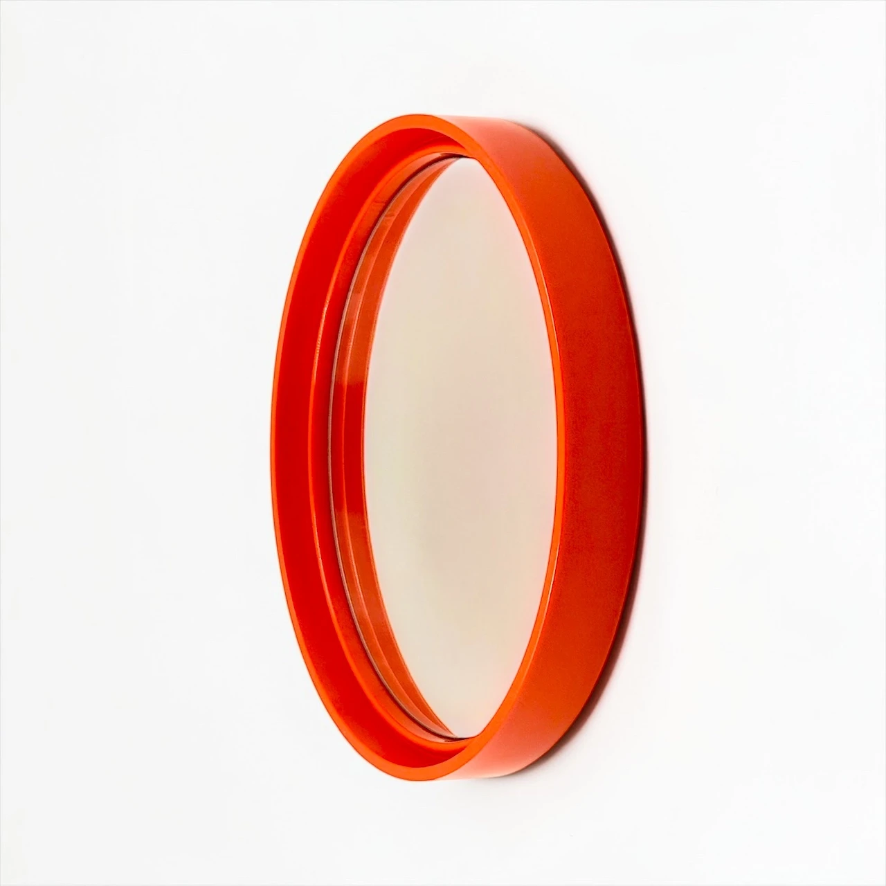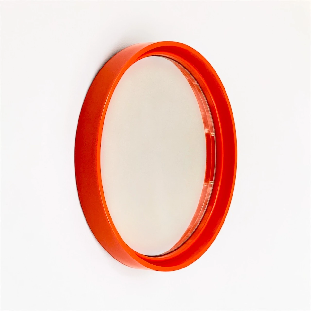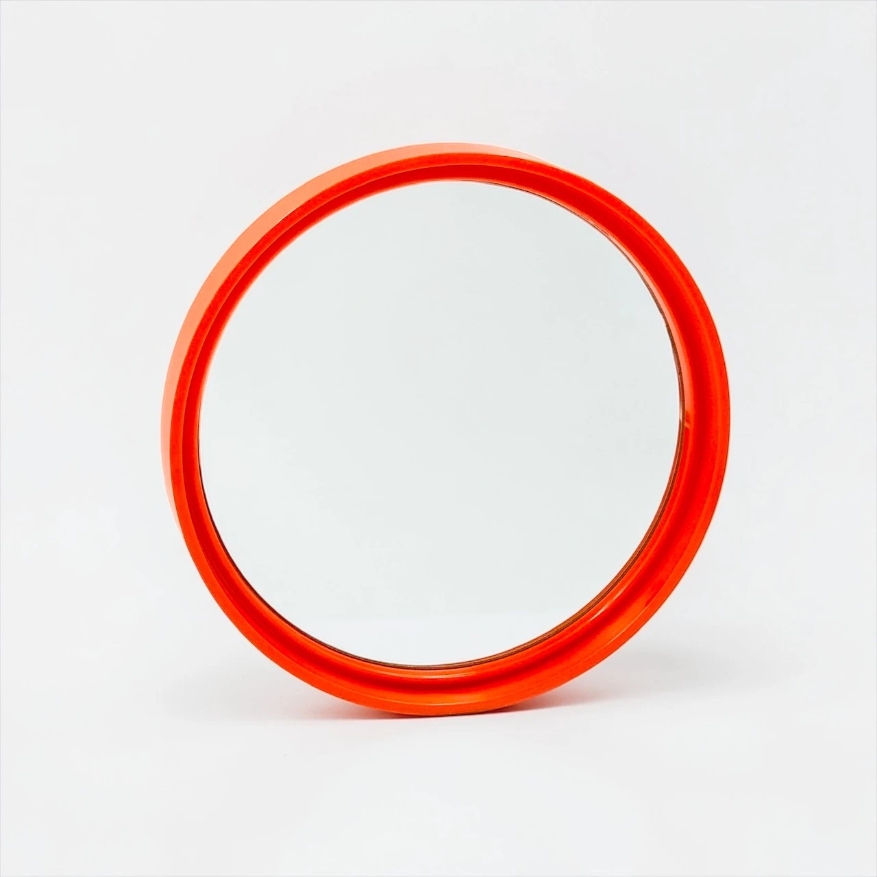 A sculptural 1970s mirror with a vibrant orange frame and clean circular form. It injects energy, depth and a bold graphic accent into any interior space.