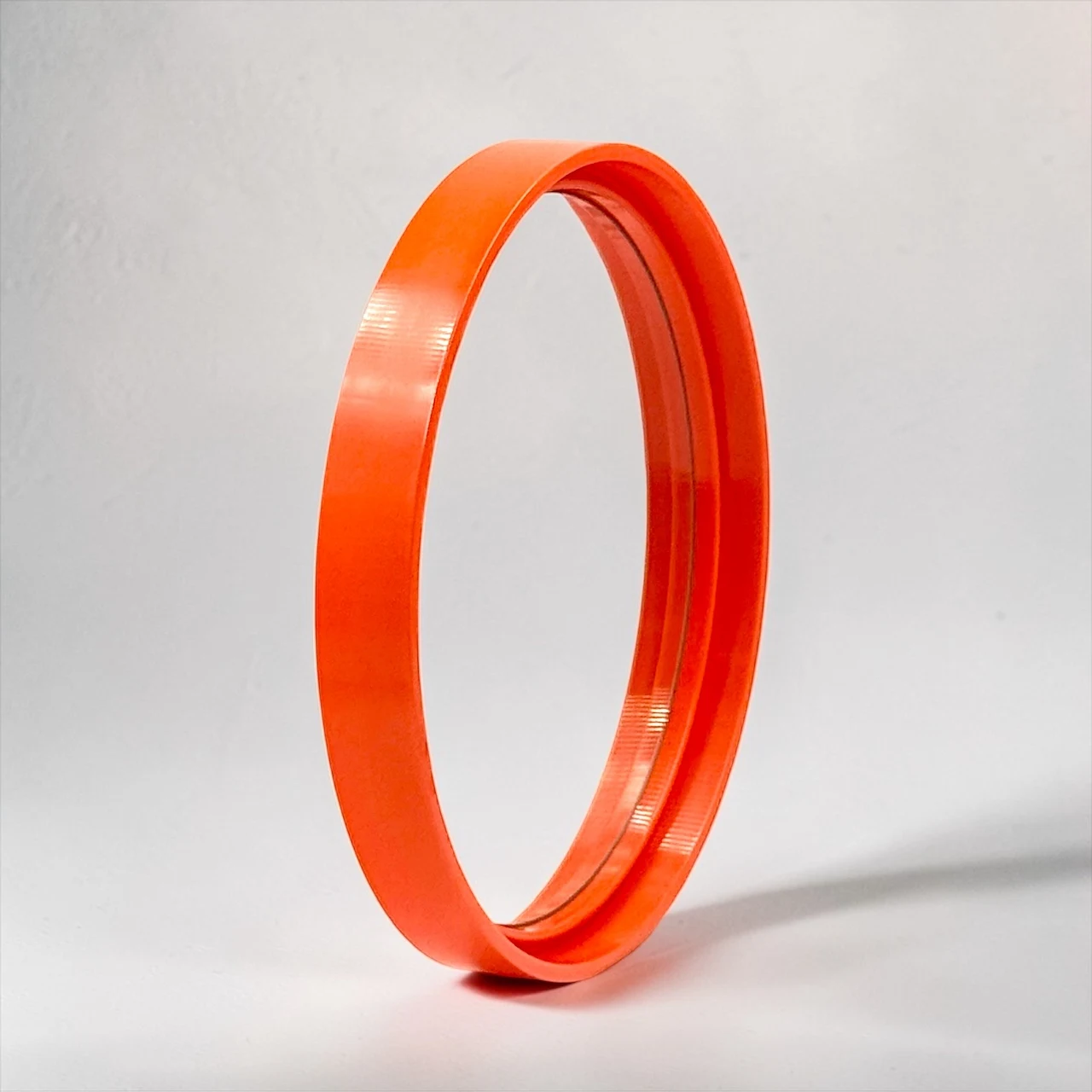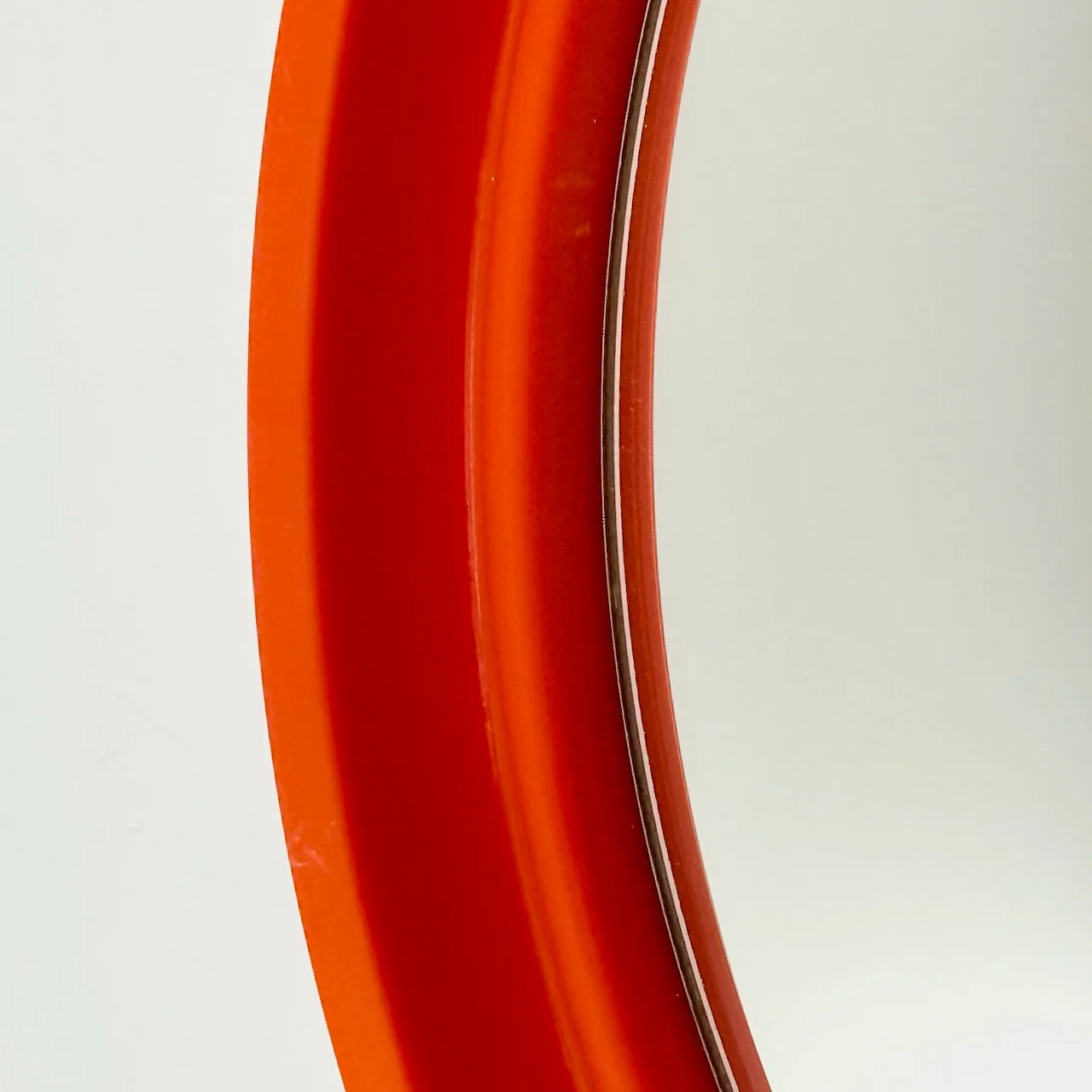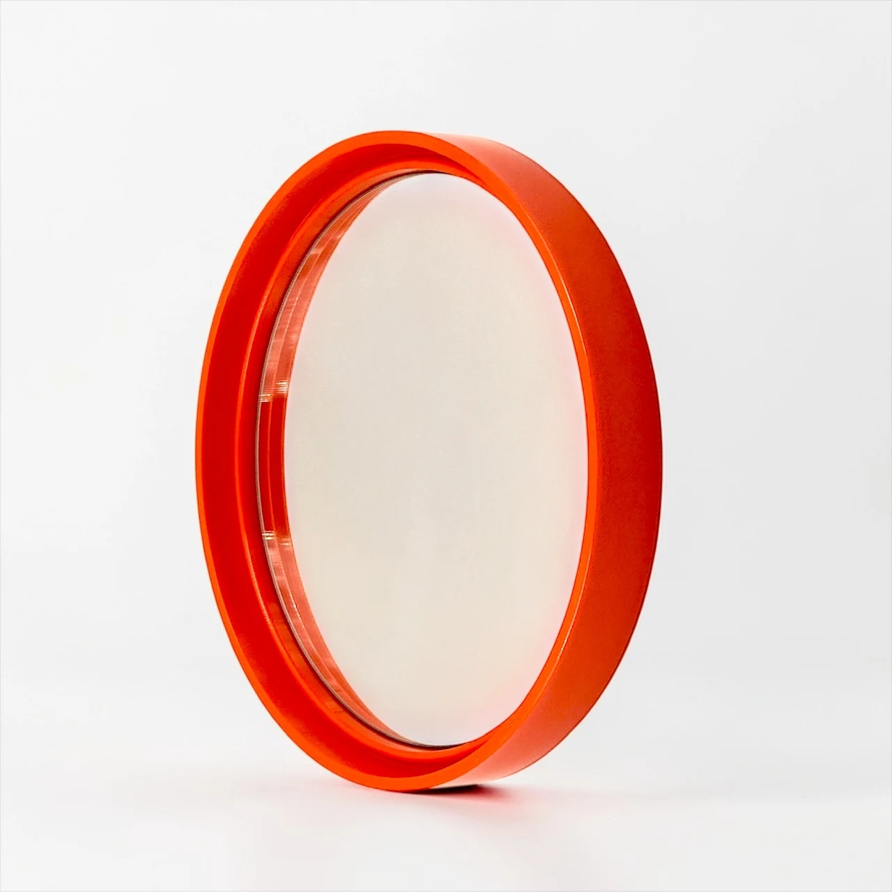 A sculptural 1970s mirror with a vibrant orange frame and clean circular form. It injects energy, depth and a bold graphic accent into any interior space.