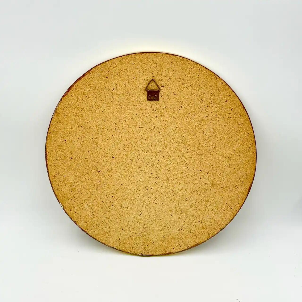 The reverse retains its original period backing panel in pressed wood fiber, complete with the original hanging hardware, confirming the authenticity of the piece. Condition is excellent, with only minimal oxidation to the brass elements and a few tiny specks on the mirrored surface, consistent with careful vintage use.