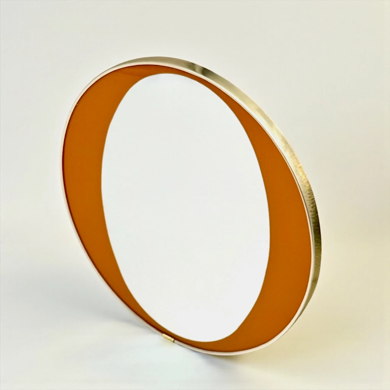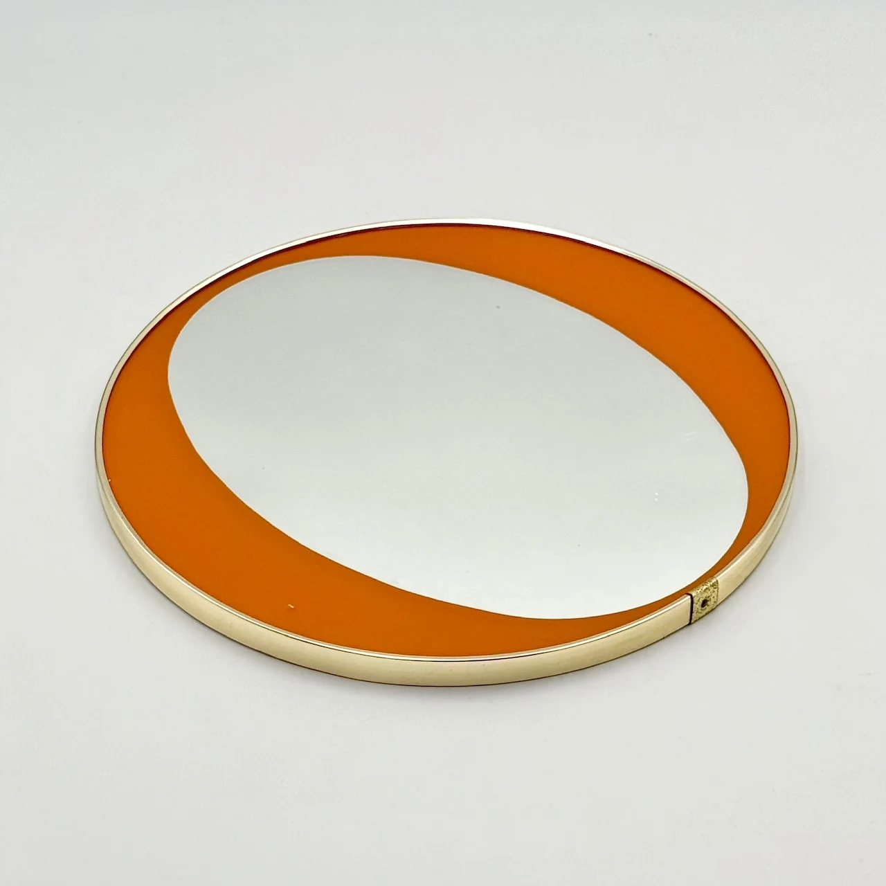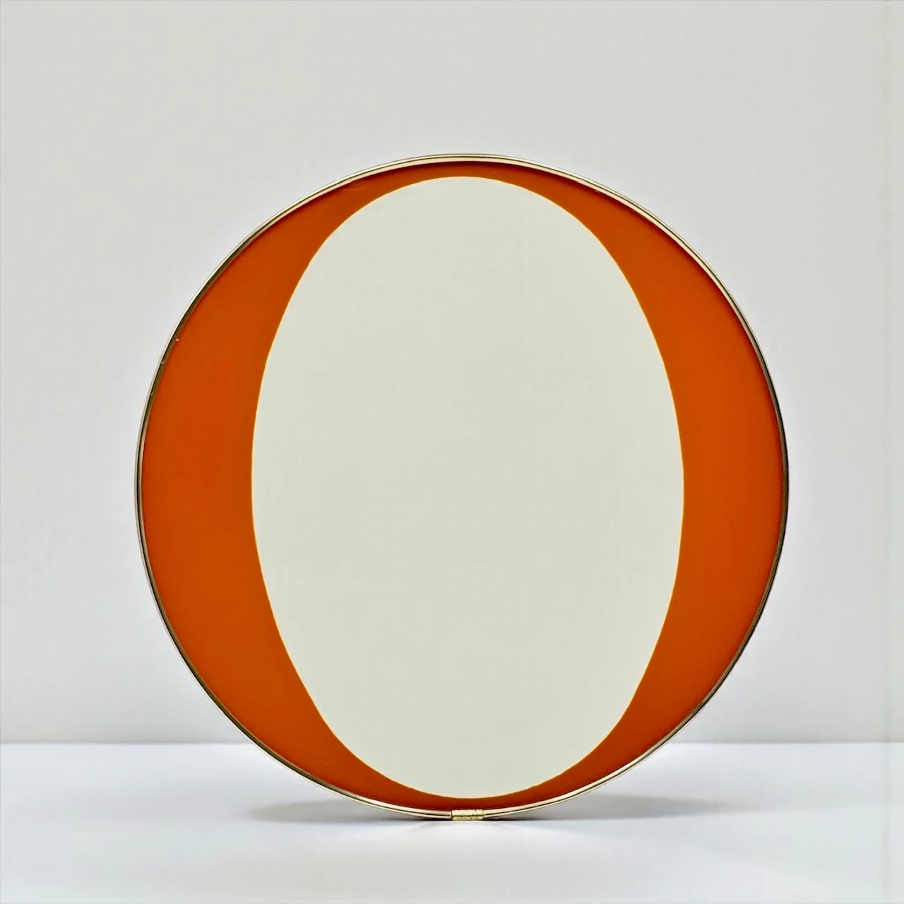 This rare 1970s orange mid century mirror is a refined expression of Italian modernist design, where color and structure are resolved into a single, carefully balanced surface. The round wall mirror features a differentiated glass composition, with a central reflective area and an orange perimeter band fully integrated into the glass itself rather than applied. This construction detail gives the mirror depth, clarity, and a distinctly architectural character.
