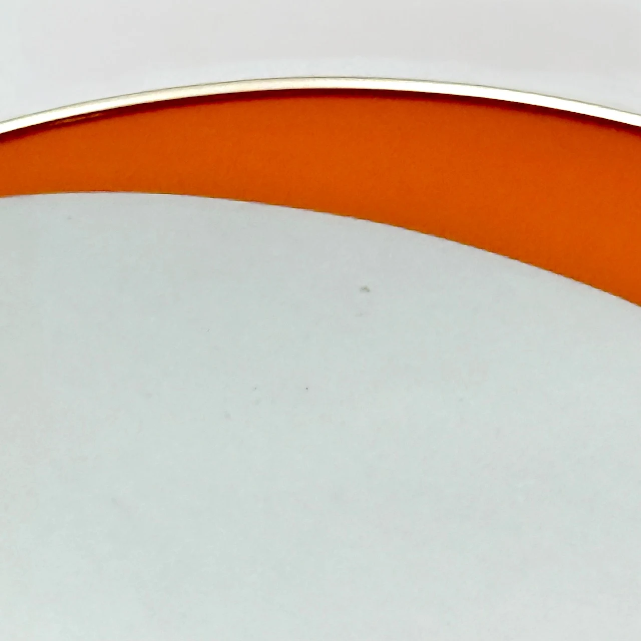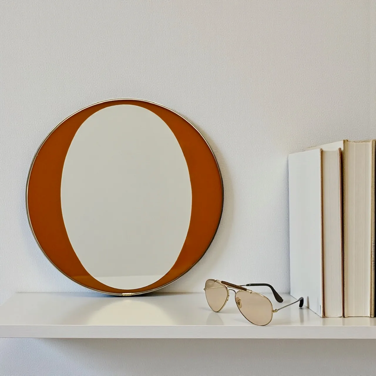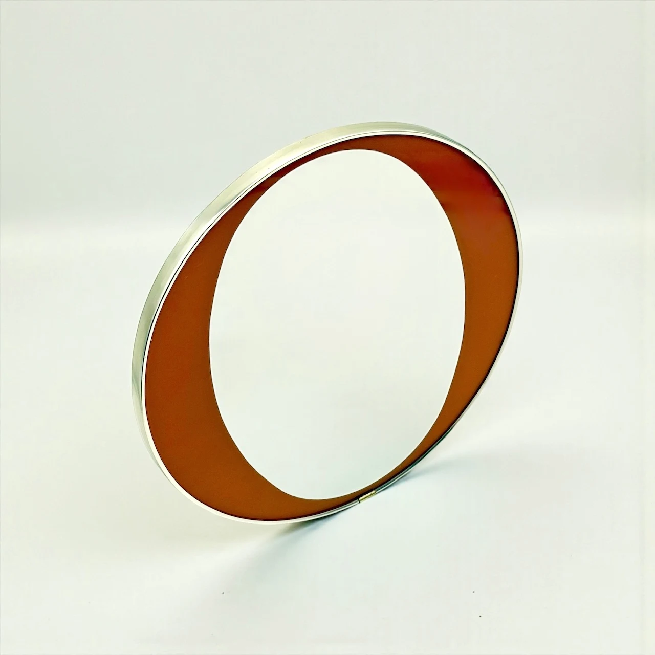 This rare 1970s orange mid century mirror is a refined expression of Italian modernist design, where color and structure are resolved into a single, carefully balanced surface. The round wall mirror features a differentiated glass composition, with a central reflective area and an orange perimeter band fully integrated into the glass itself rather than applied. This construction detail gives the mirror depth, clarity, and a distinctly architectural character.
