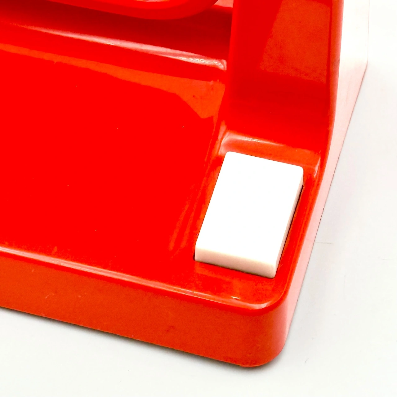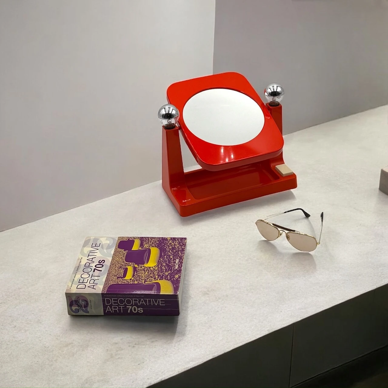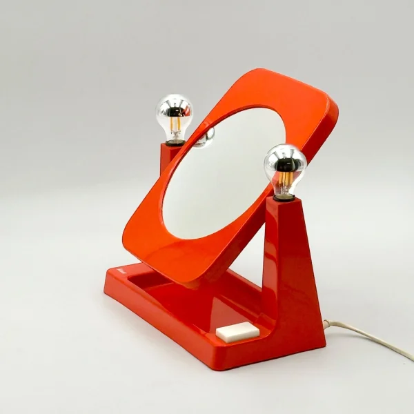 This vintage makeup mirror is made of vibrant orange plastic with a two sided mirror – one regular, one magnifying – that can be used rotating the square frame. The two mirrors have a different shape (one circle, one squared). On the sides there are two sockets for E14 bulbs to illuminate the mirror and a practical lamp switch.